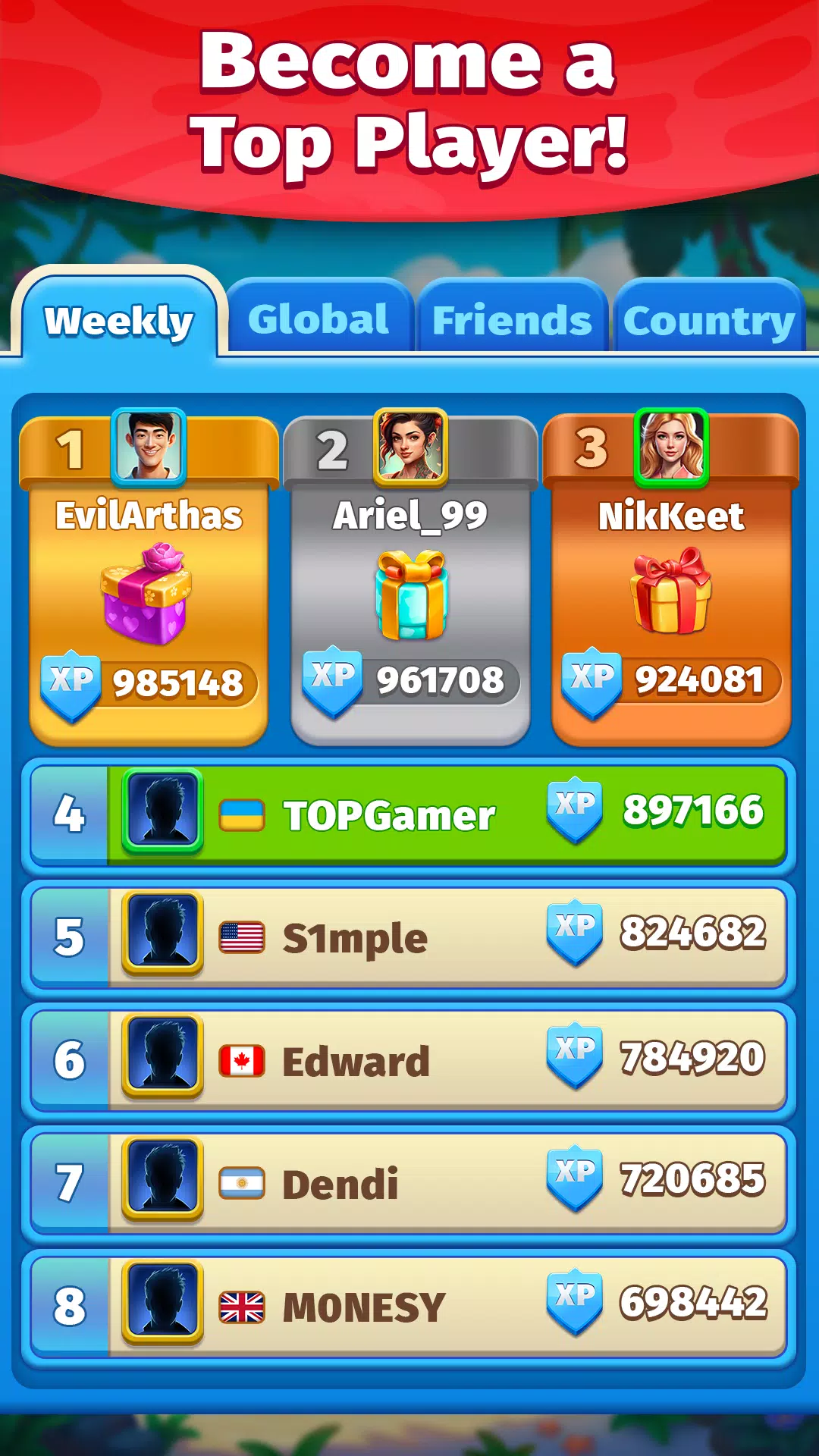 畅玩【三消之星:PVP 冠军】这款益智三消 PVP 多人游戏,与好友或随机对手对战,赢取冠军,跻身全球/国家/周排行榜的顶尖三消大师。让其他人赞叹你的辉煌战绩!