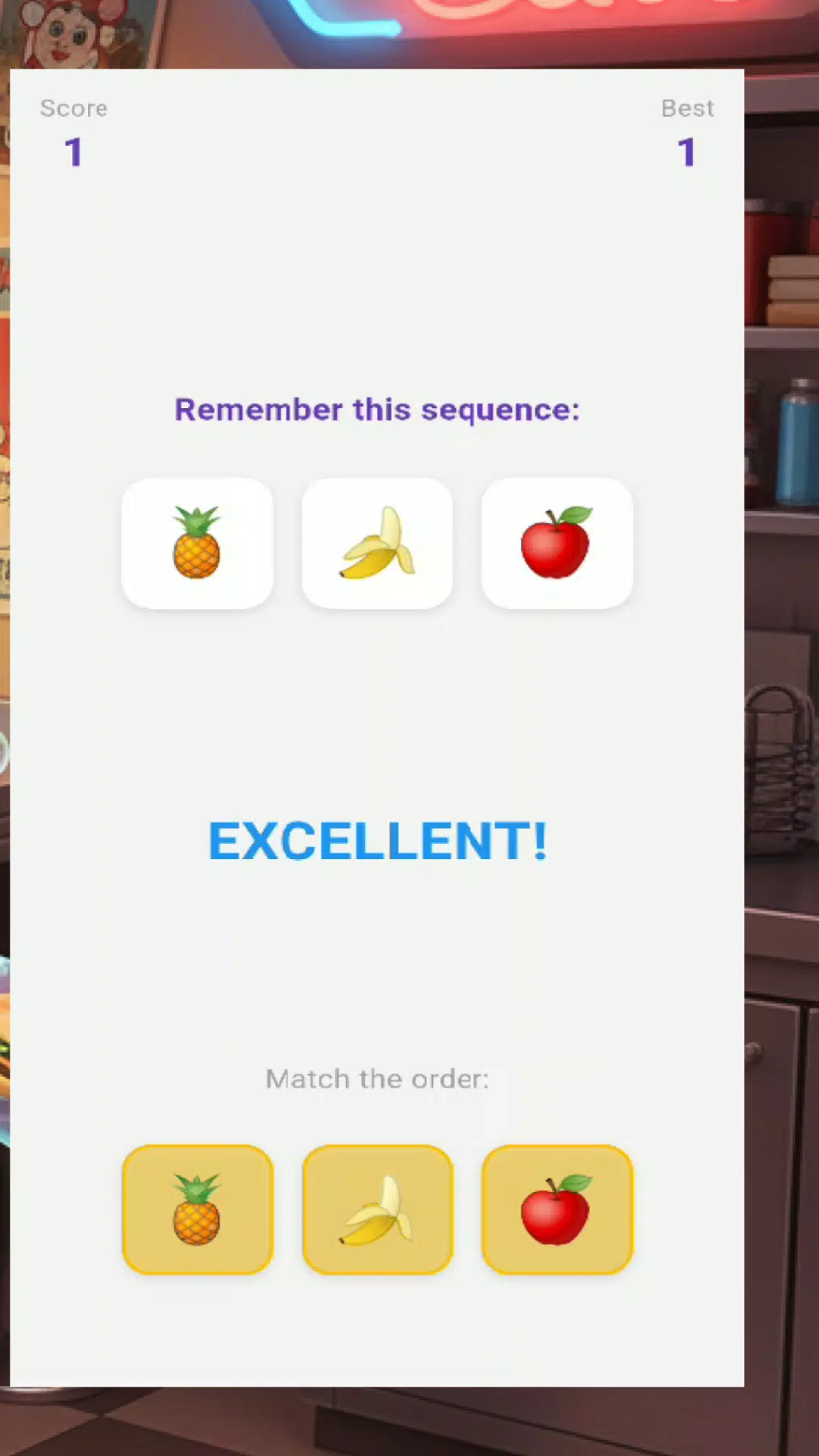 记住顺序——而不仅仅是物品。在“顺序记忆”游戏中,简短的视觉序列会测试你的注意力和记忆力。你需要按照图标出现时的顺序重新排列它们,才能通过难度逐渐增加的关卡。
