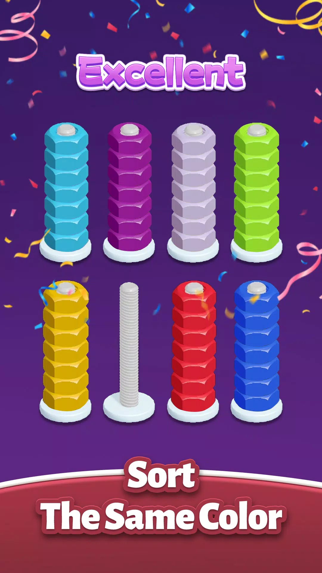 随着关卡的推进,会出现更多颜色,螺丝会变得越来越少,隐藏的彩色方块/障碍物也让挑战更加艰巨。