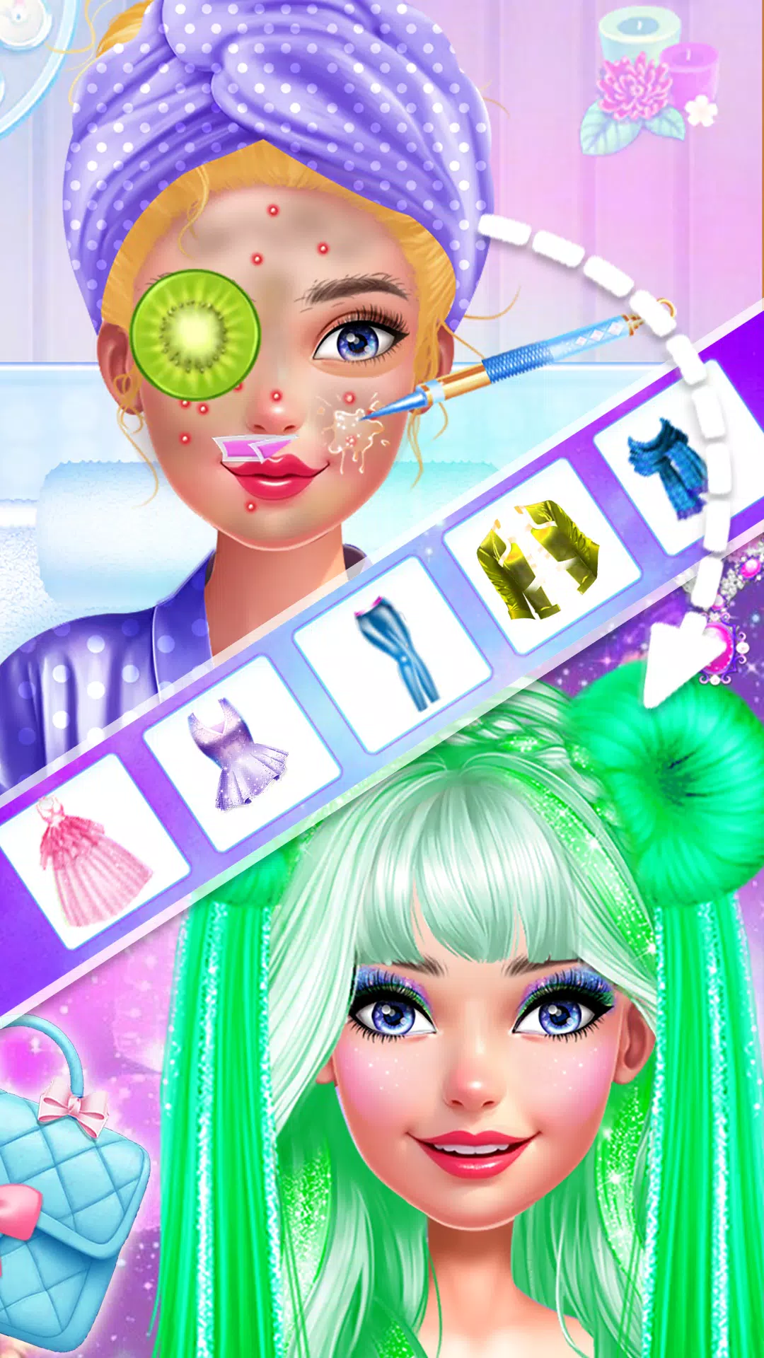 在美发沙龙度过一天真是妙趣横生,尤其是当你想尝试新造型的时候。在这个激动人心的游戏中,你有机会成为理发师、造型师,甚至是化妆师。点击“开始”按钮,开启冒险之旅。第一关发生在家,你可以试穿酷炫的服装和与之完美搭配的鞋子。屏幕右侧有大量的造型选项可供选择,例如裤子、裙子、包包、鞋子等等。对造型满意后,即可进入第二关,即生日派对故事。在这里,你可以挑选不同的礼物:如果你热爱时尚,可以选择缝纫机;如果你想捕捉美好瞬间,可以选择相机。尽情畅玩,最终所有关卡都会解锁。接下来,我建议我们去百货商店,在那里你可以找到新的商品可以购买。点击“购物”图标,将所有想买的商品放入购物车,确保你有足够的金币来购买。对于第四级,我们决定去水疗中心 (spa) 再合适不过了。现在我们去面部水疗中心:准备好迎接最放松的体验吧。女孩坐在桌子上,头发盘起,毛巾盖着:她准备好迎接魔法的降临。使用各种工具,例如不同的面膜、护理产品,甚至镊子,打造完美妆容。美容师看似简单,但有时事情并非总是如计划般顺利,但不用担心,我们会一步步指导你。水疗中心之旅结束后,你还可以体验其他活动,例如学习如何为女孩打造专业的发型、进行有趣的照片拍摄、学习如何使用各种化妆品等等。化妆对于改头换面至关重要。眼影可以提亮女孩的眼睛,改变她的整体形象,睫毛膏也同样重要。遮盖黑眼圈,记住口红也是必不可少的。选择大胆的粉色,通过这个妆容展现你的本色。别忘了每天关注我们,解锁我们精心准备的所有精彩关卡和功能,最重要的是享受游戏乐趣。