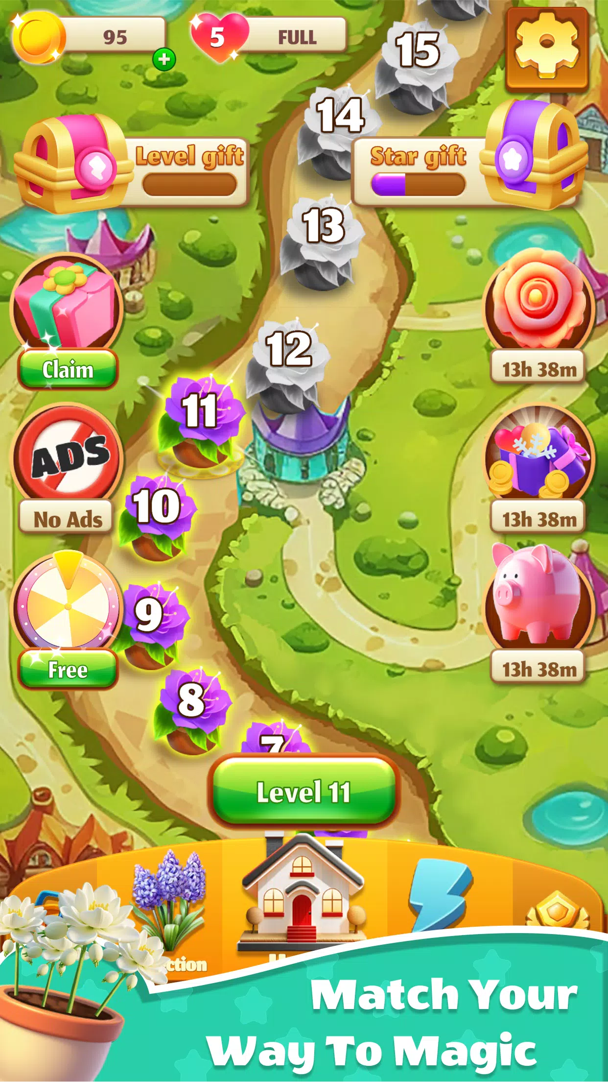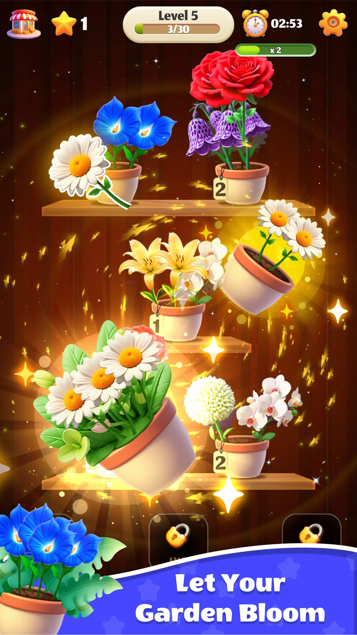 不断进步,绽放花朵:您匹配和整理的次数越多,您的花园就会变得越美丽。