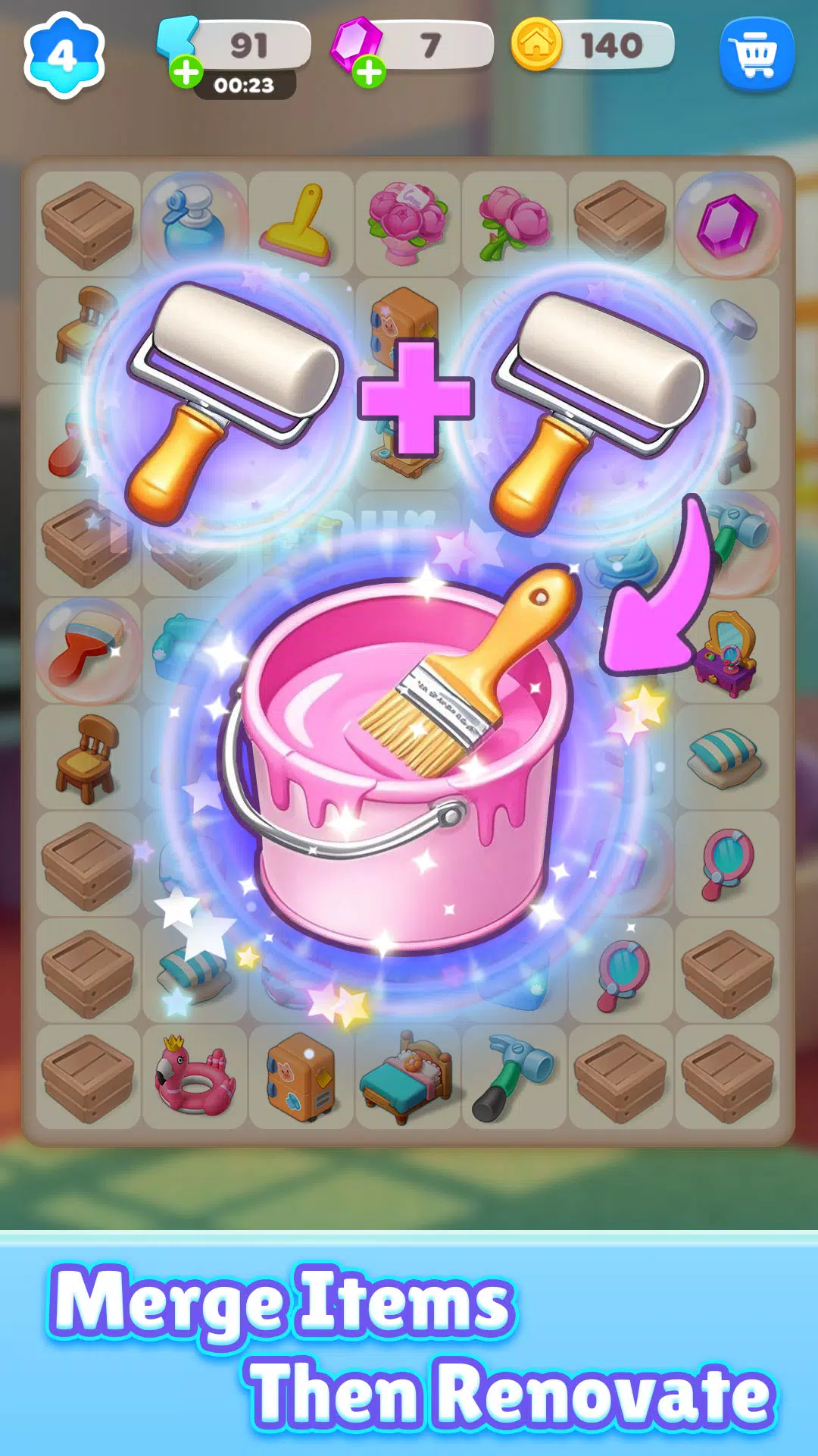 享受合并的简单乐趣,将相似的元素组合在一起,收集装修项目所需的材料,促进成长和创造力。
