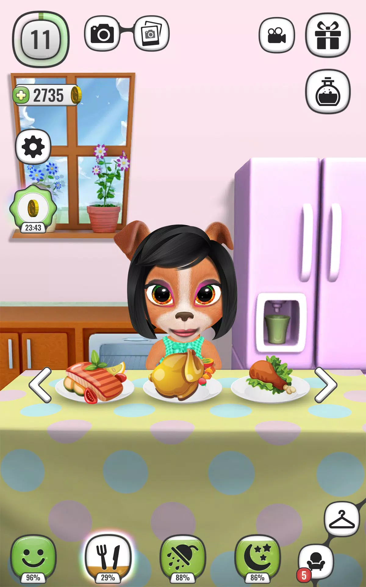 选择你最喜欢的衣服为你的虚拟宠物穿上个性化您的说话的小狗。你可以改变的衣服,家具,一切都在房间里其他人。