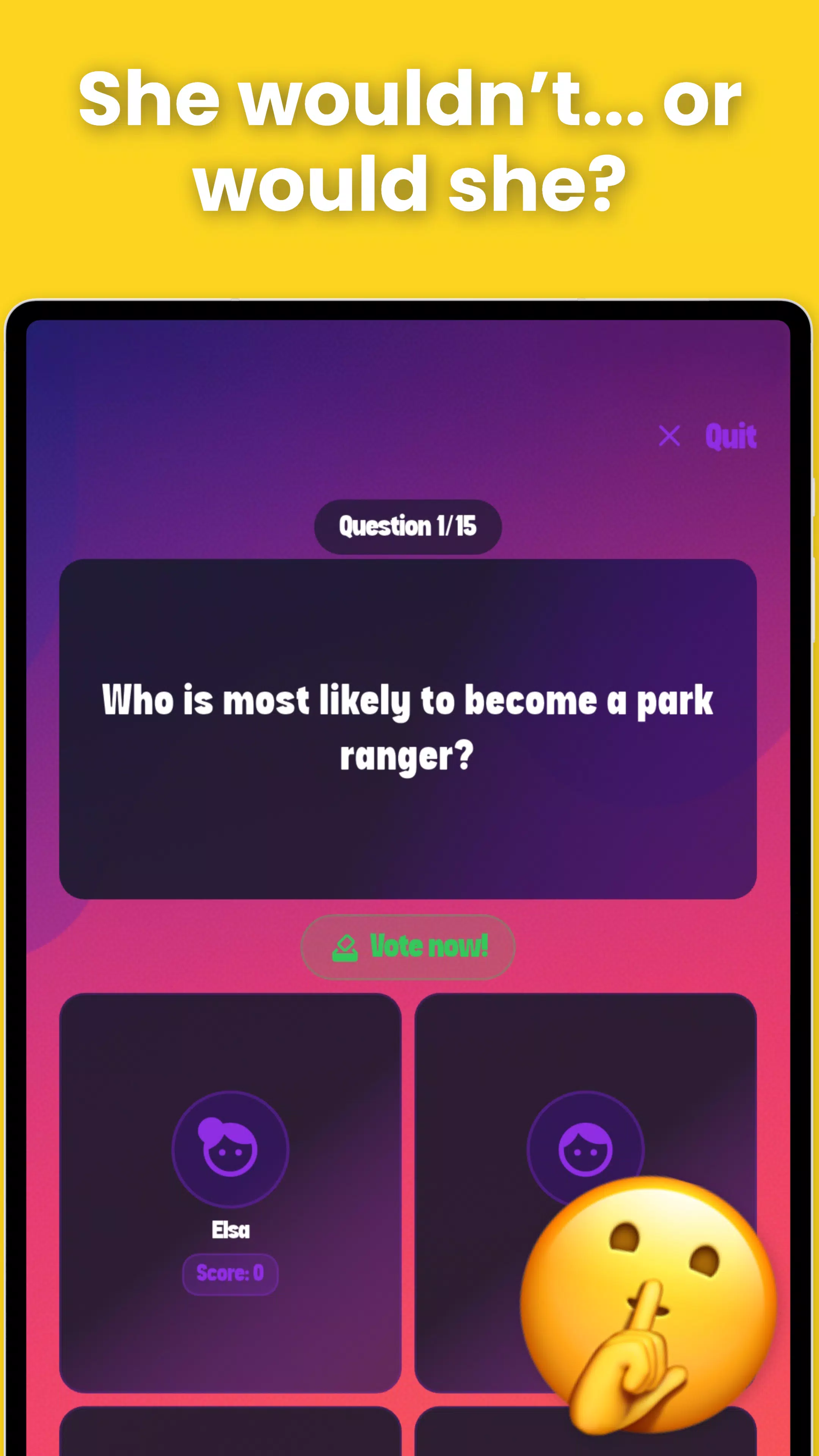 你知道谁最有可能泄露秘密、恶作剧,或者在桌子上跳舞吗?玩“最有可能”游戏,你就能找到答案。这款游戏专为那些喜欢开怀大笑、乐于接受趣味挑战、渴望拥有难忘社交时光的人们而设计。