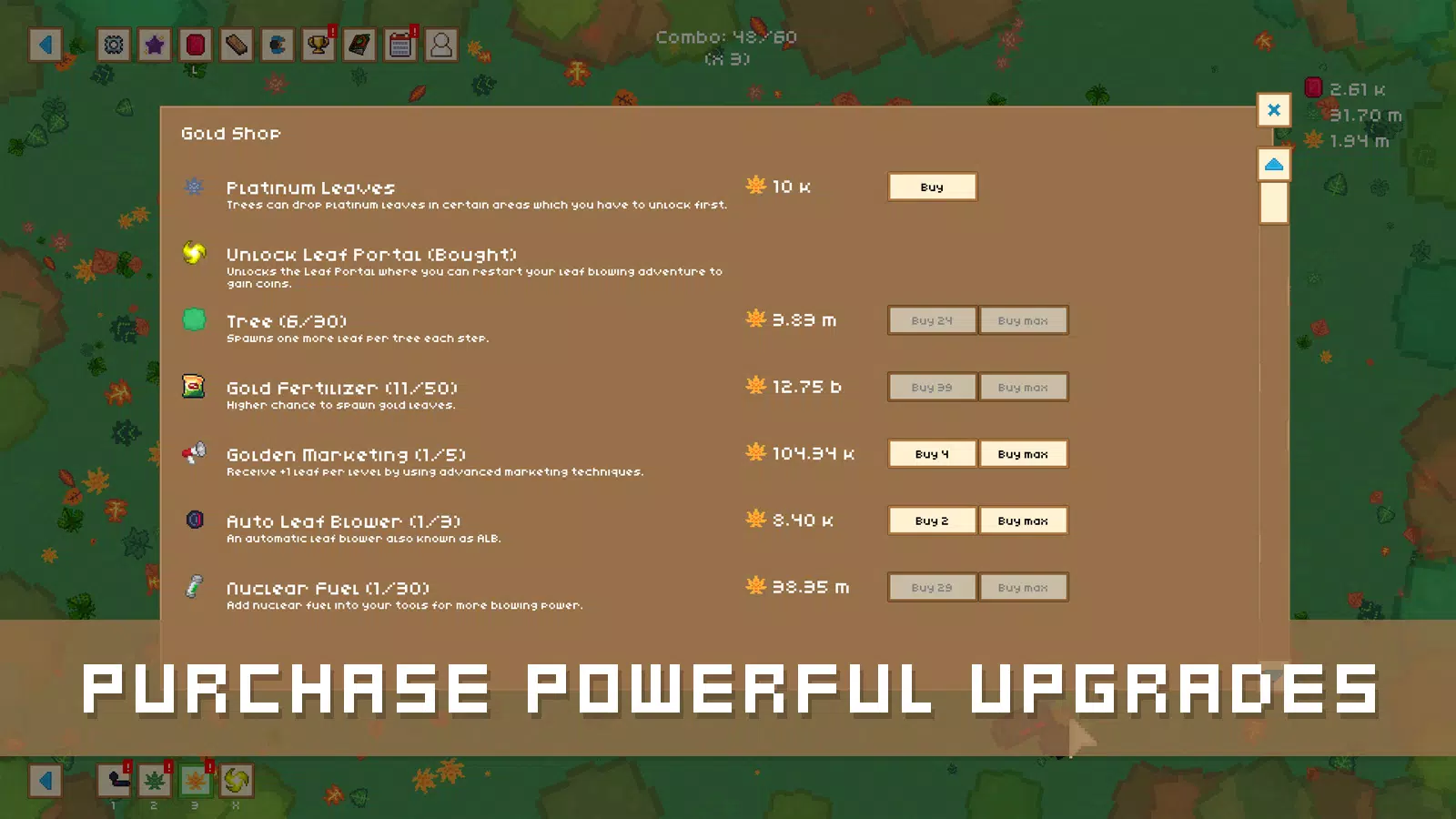 《吹叶机革命》是一款增量式放置类游戏,您可以使用独特的吹叶机吹落树叶,解锁升级,获得成就,探索新区域,制作树叶等等!