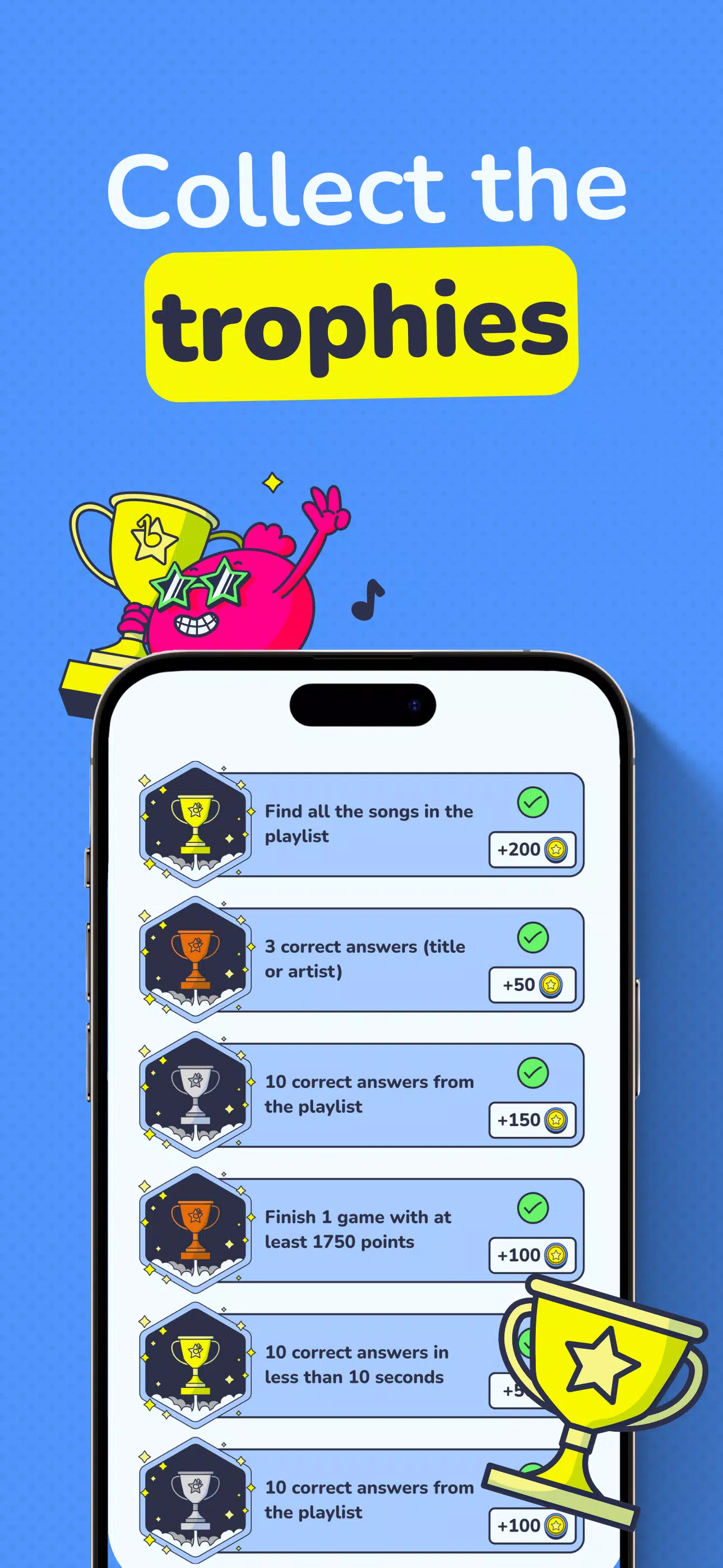 – 赢取奖杯和金币🏆:在 Mukiz 的经典模式中展示您的音乐专业知识,赢取奖杯,向其他玩家展示您的技能并解锁令人兴奋的功能。通过获得奖杯来赢取金币,金币可用于自定义您的头像和解锁播放列表。