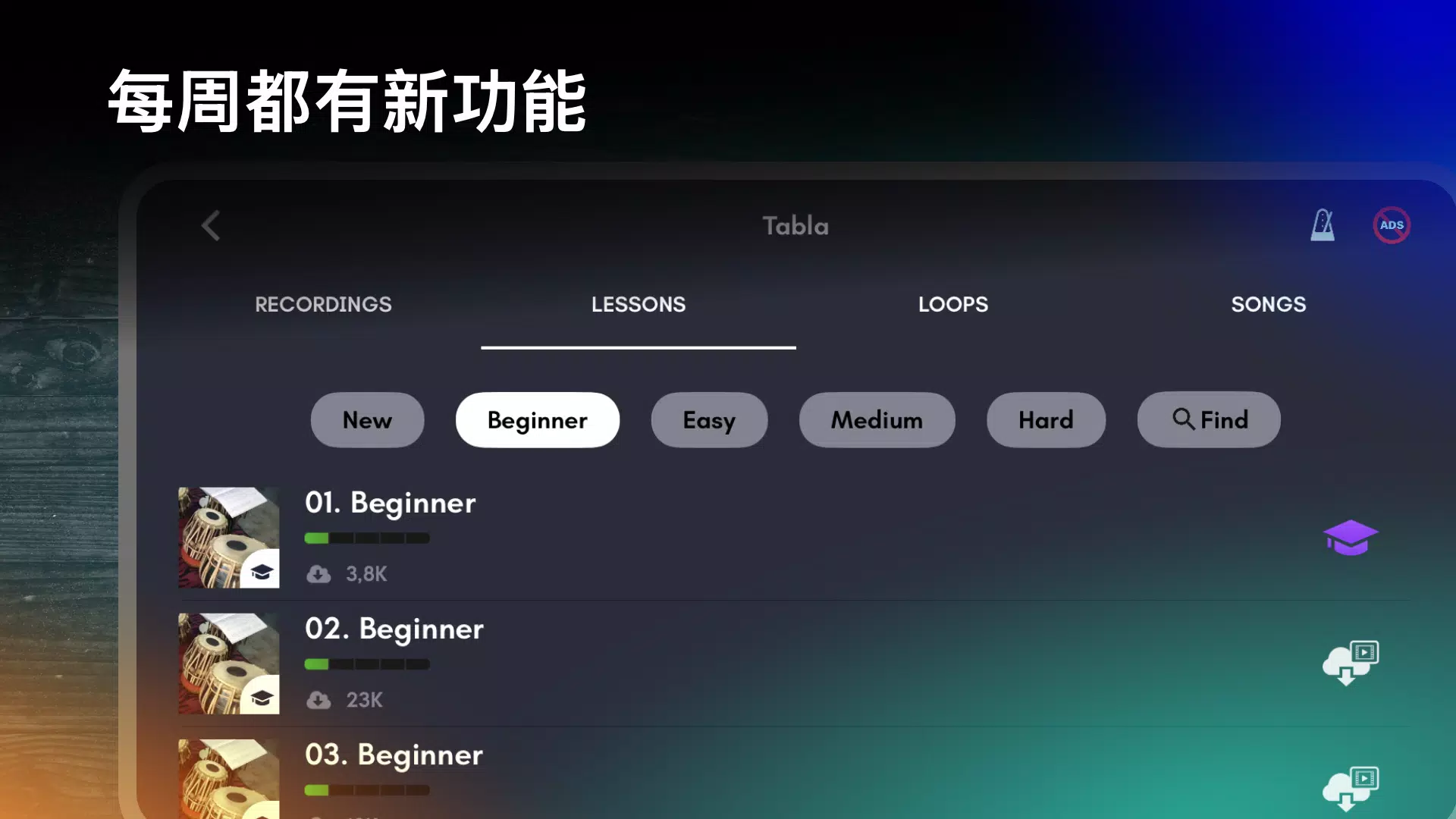 – 100+ 个循序渐进的课程:从零开始学习演奏。
