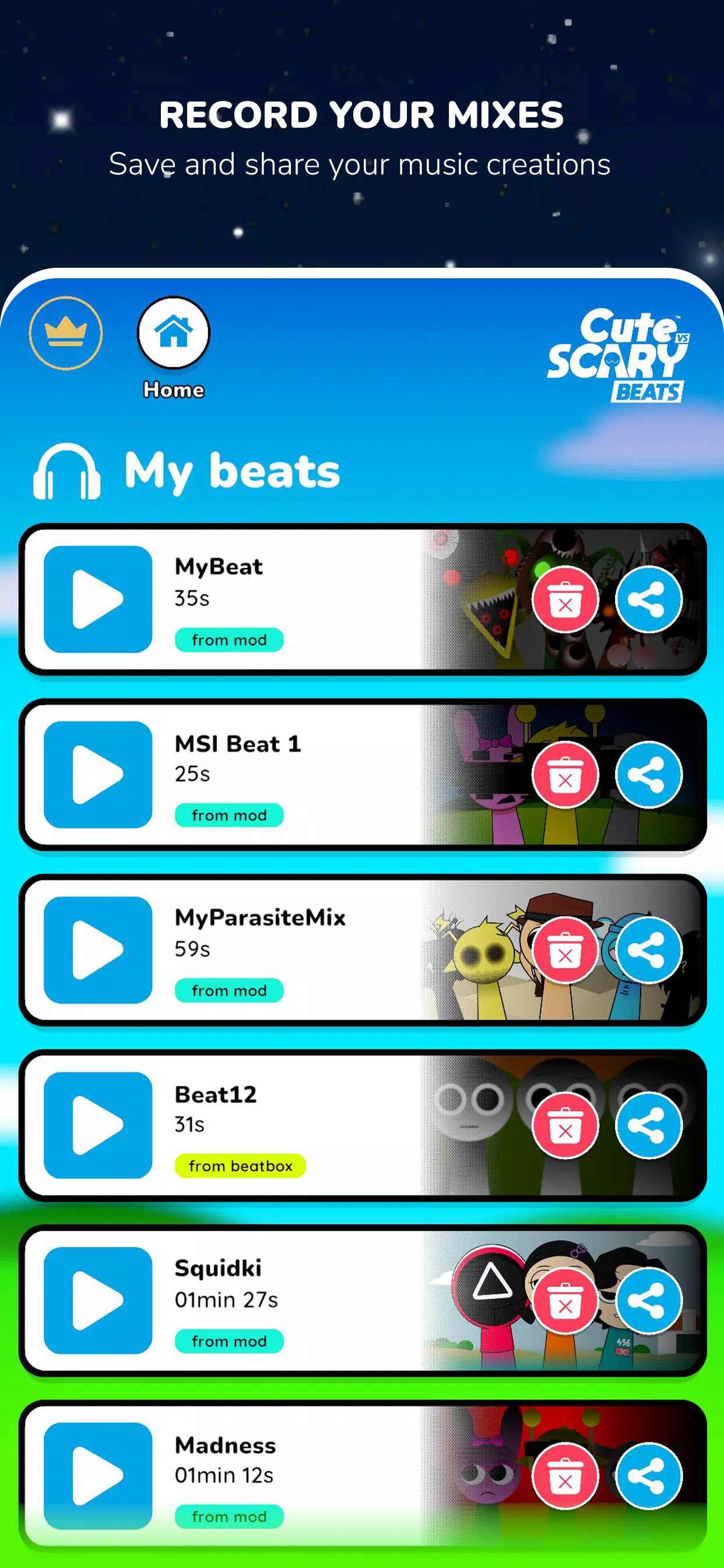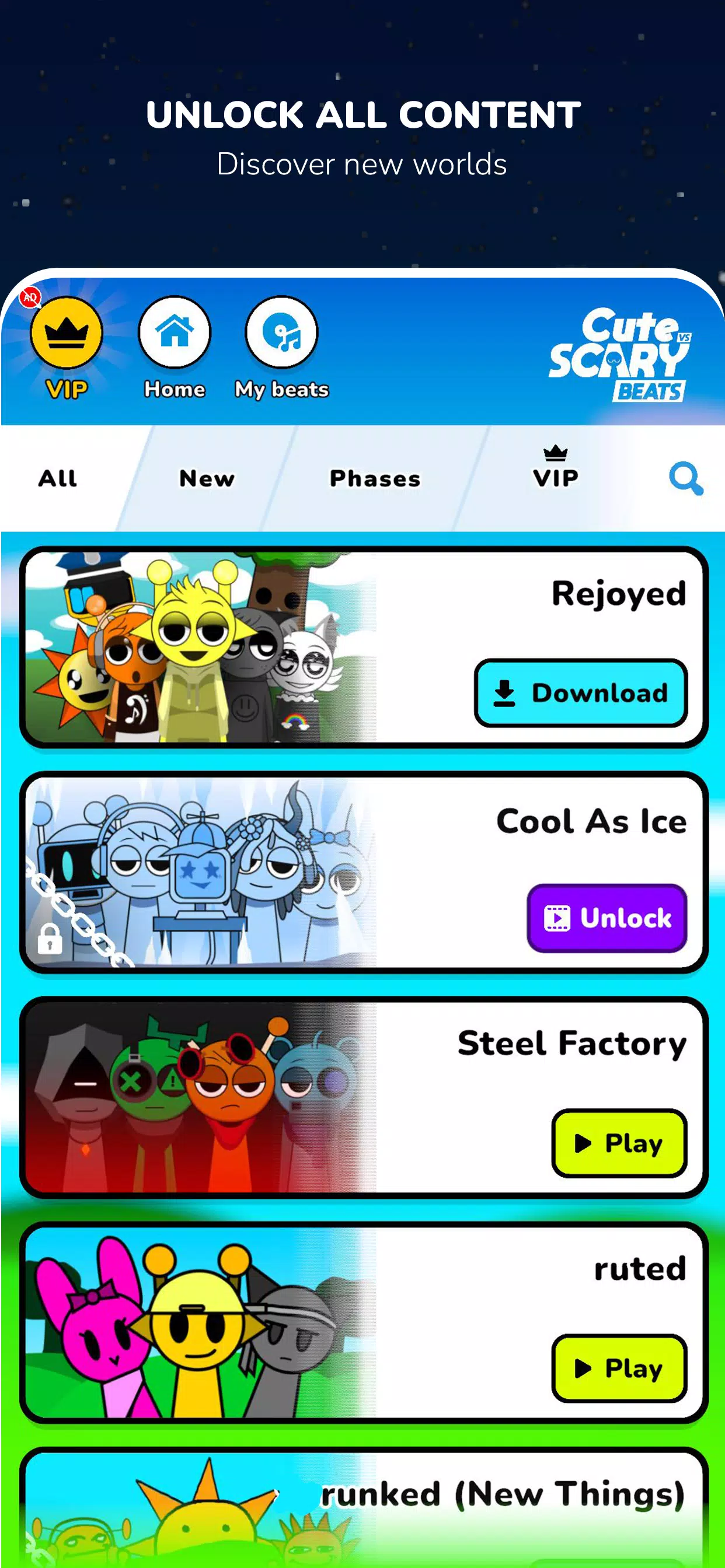 准备好在《可爱与恐怖节拍 2》中体验更高层次的音乐创作乐趣吧!全新模式、新鲜音效以及更疯狂的变形,让你以前所未有的方式混音节拍。尝试独特的音效组合,看着你的角色瞬间在可爱和惊悚之间切换!