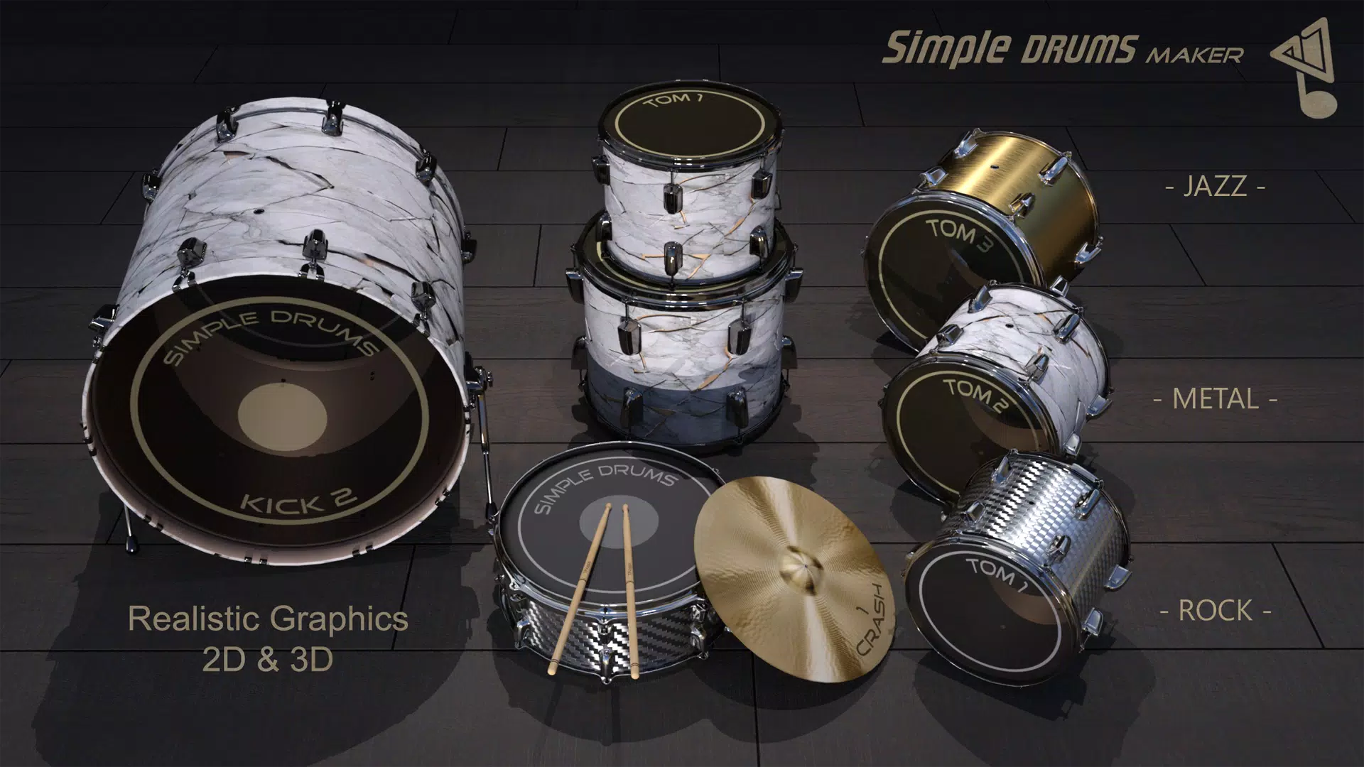 Simple Drums Maker 是我们功能最齐全的鼓组应用,拥有众多先进的新功能。您可以使用我们全新的“编辑鼓组”功能,完全按照自己的喜好创建和自定义鼓组。借助此功能,您只需轻触并拖动,即可将所有镲片和打击乐器放置在屏幕上所需的位置。现在,您可以无限地自定义鼓组。最重要的是,您可以享受高品质的打击乐音色,享受击鼓的乐趣。我们的应用响应速度快,并支持多点触控,让您享受真实的鼓组体验。