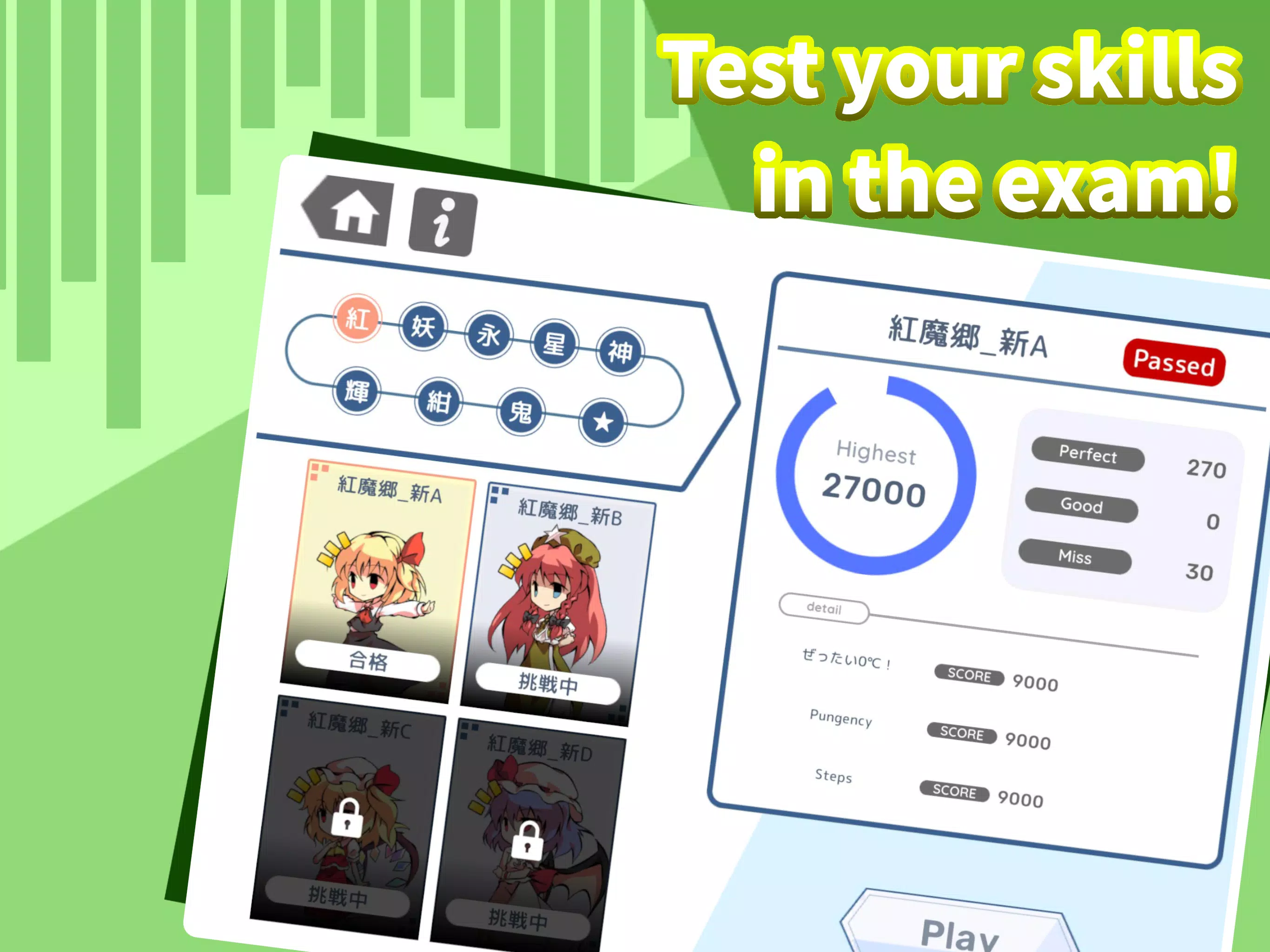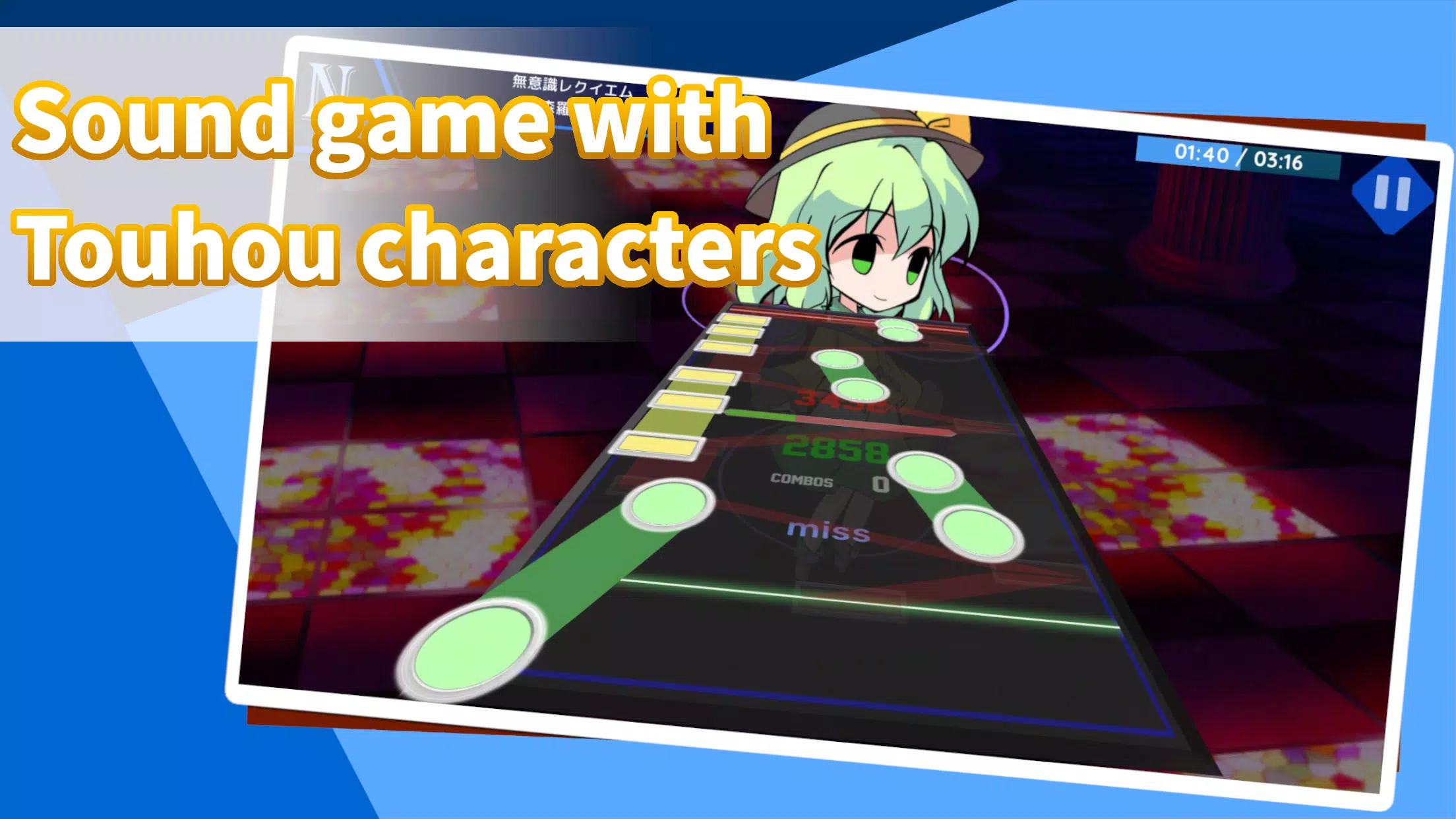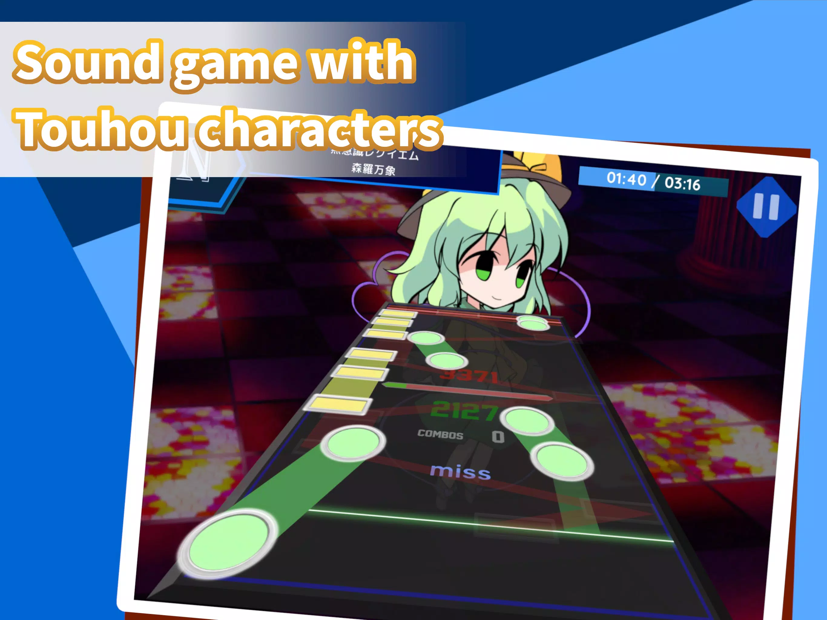 这款游戏是一款音游,可以与 “Touhou Project “的编曲一起玩。使用与歌曲相关的东方角色进行游戏,欣赏协奏曲并争夺积分。 你所获得的最高分的总和会显示在图表中,让你享受每天的成长。