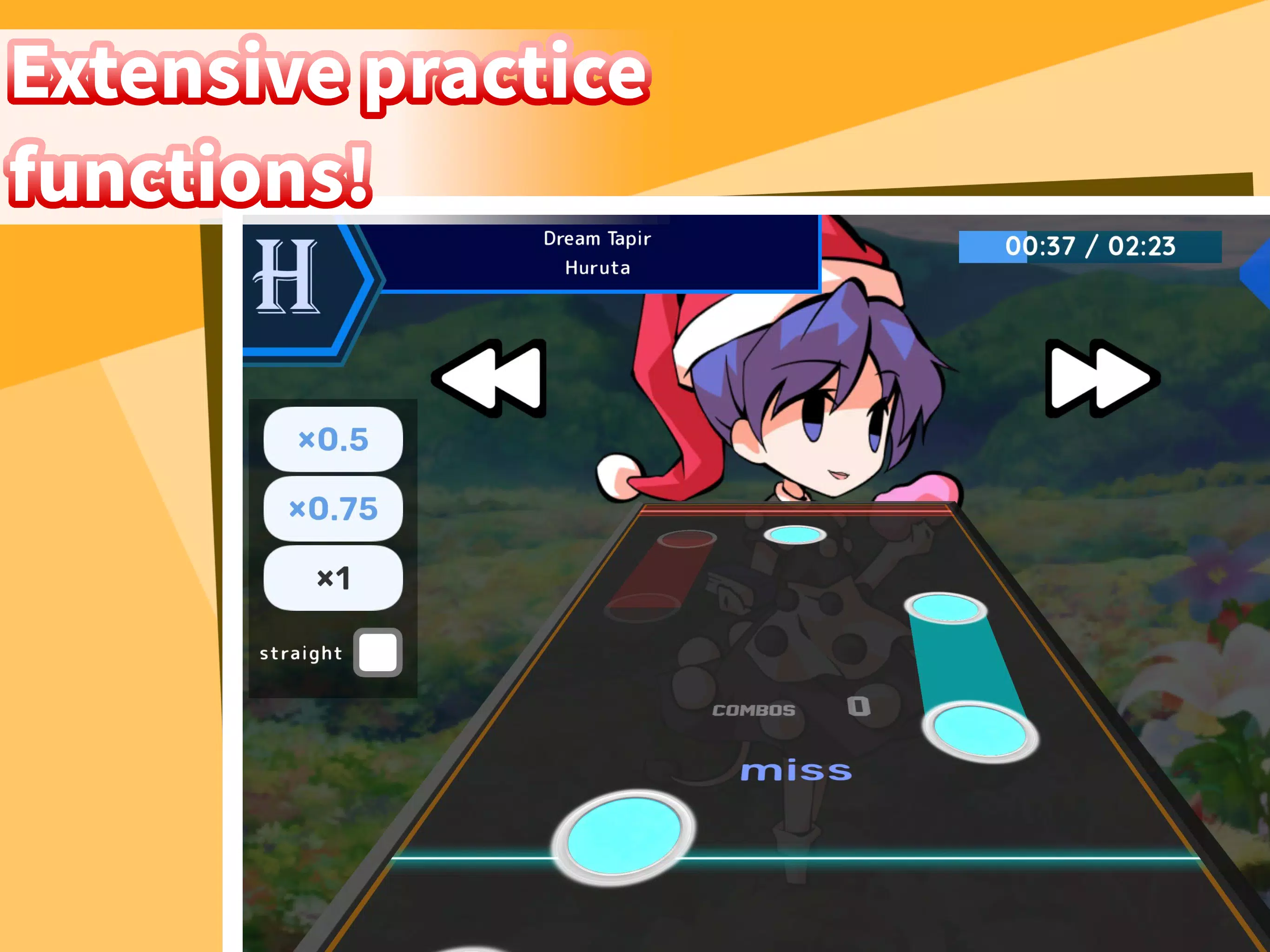 通过调整乐曲速度、倒带(快进)以及查看推荐指法等功能,提升你的节奏游戏技巧。