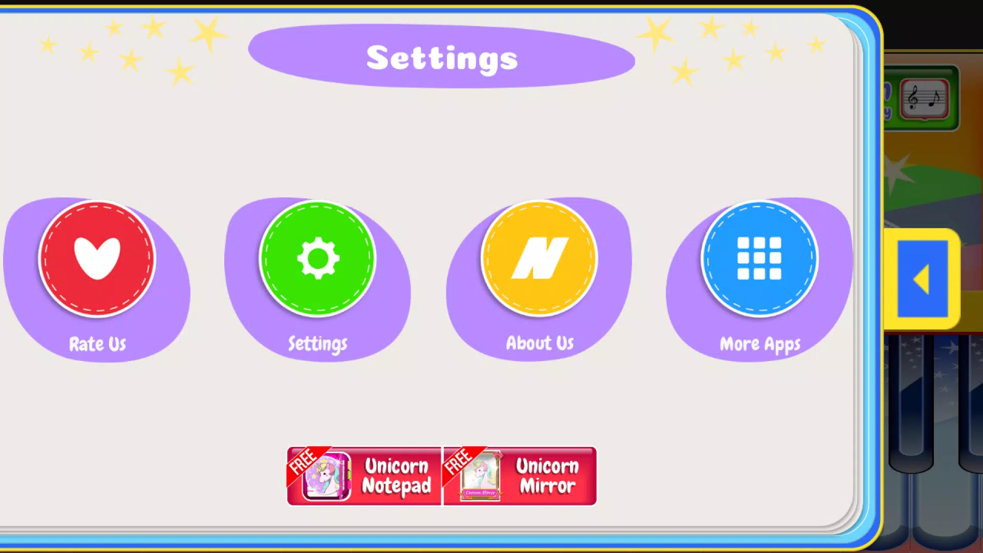 该应用程序也可以用作没有学习模式的钢琴。 还有一个选项可以录制您自己的歌曲。 录音功能将允许您保存您的音乐作品并在以后播放。 您可以将可见钢琴键的数量设置为 10 到 24。您可以用一个键或一个八度向右或向左移动键盘。 这架神奇的键盘钢琴将像你的虚拟老师