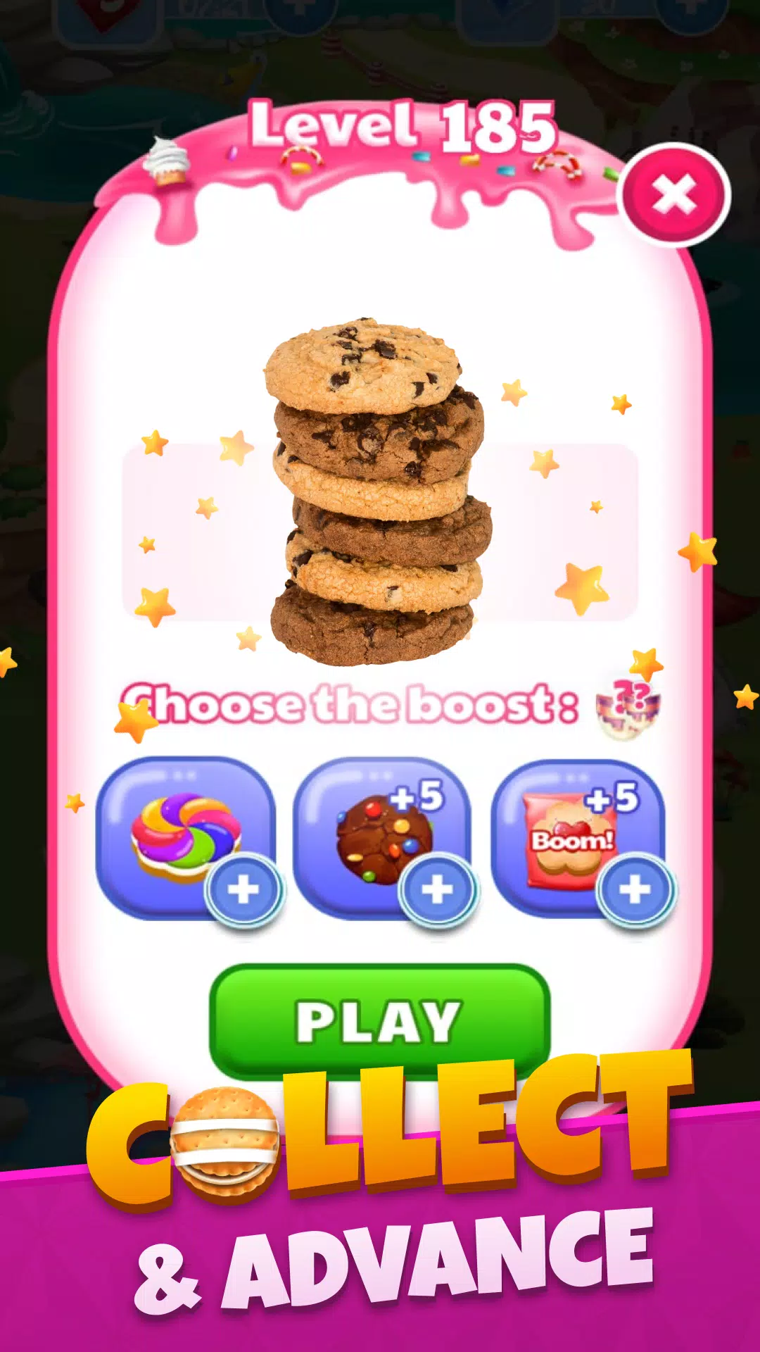 ⭐ 交换位置,将 3 个或更多相同的饼干连成一线,即可将其粉碎。