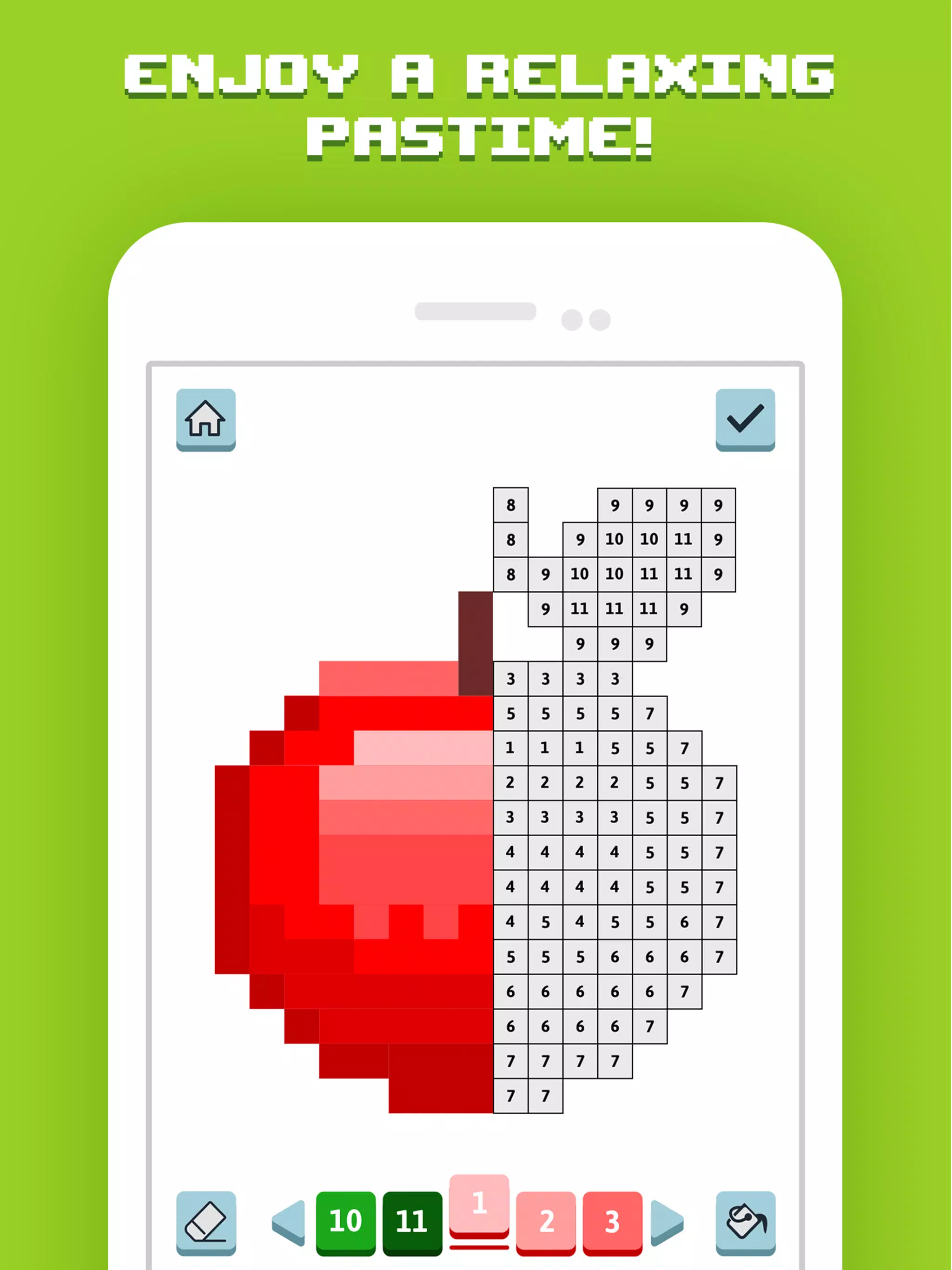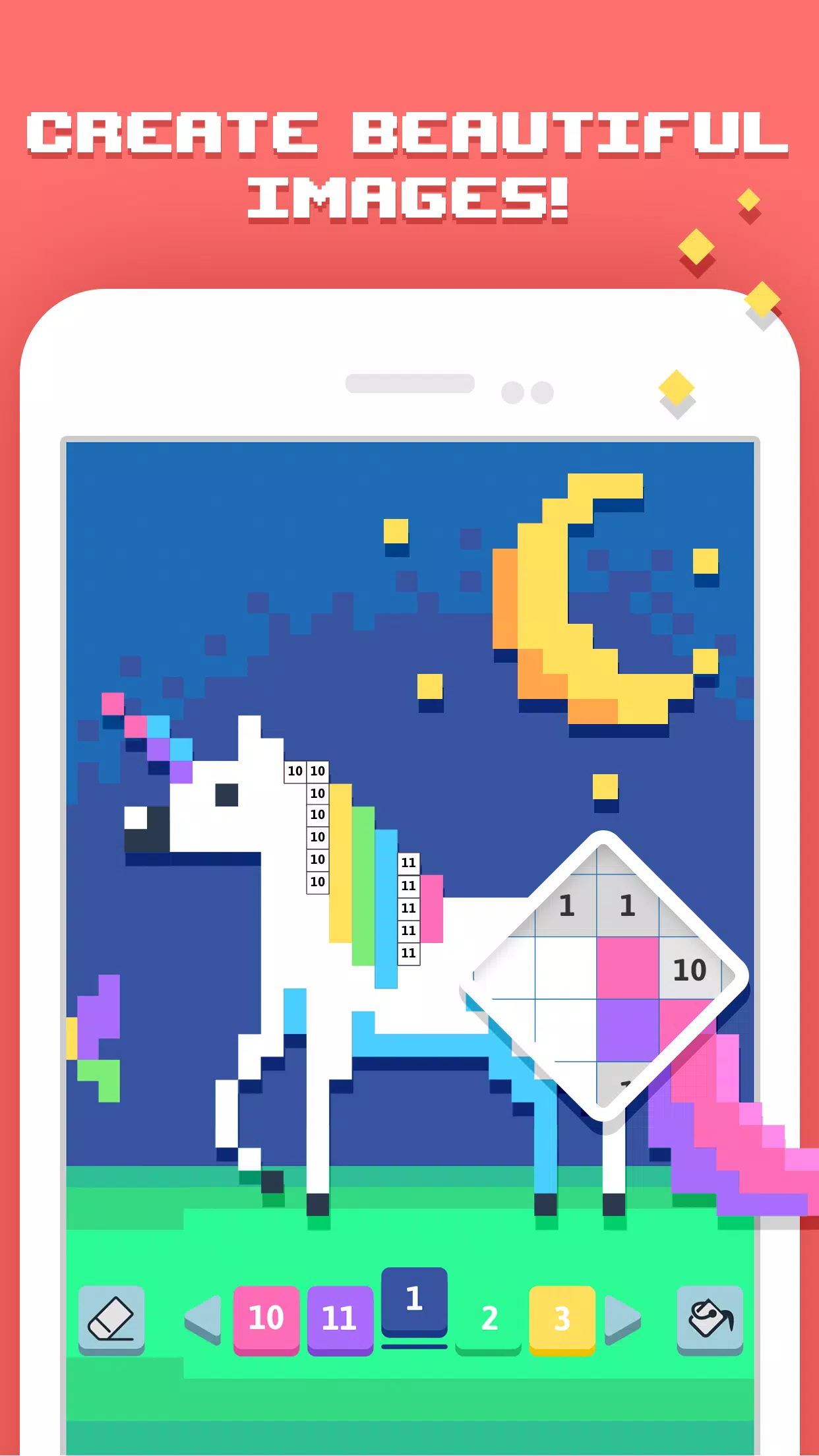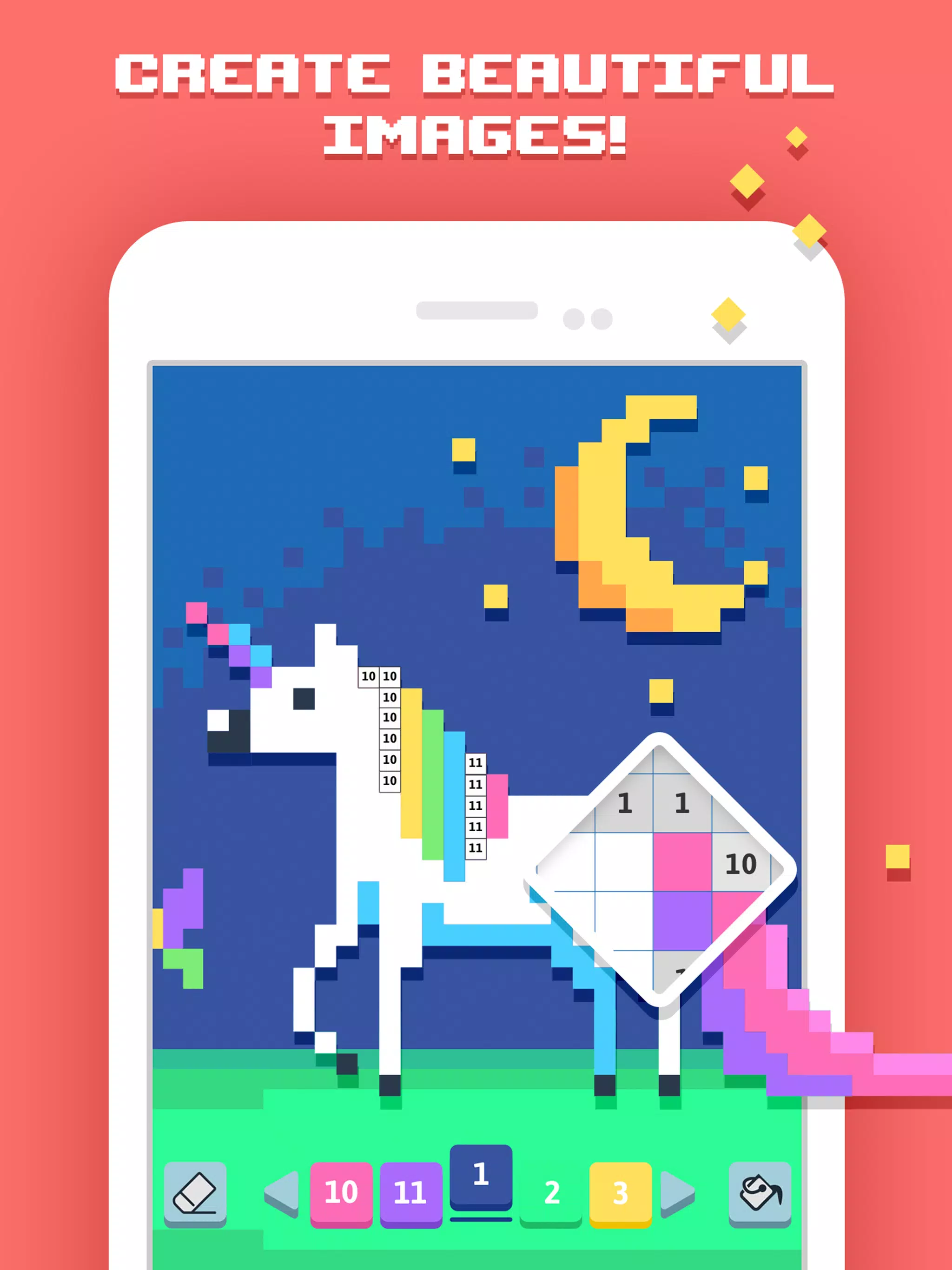 跟随对应不同颜色的数字,填满屏幕上的每个方块,让精彩的艺术作品栩栩如生!