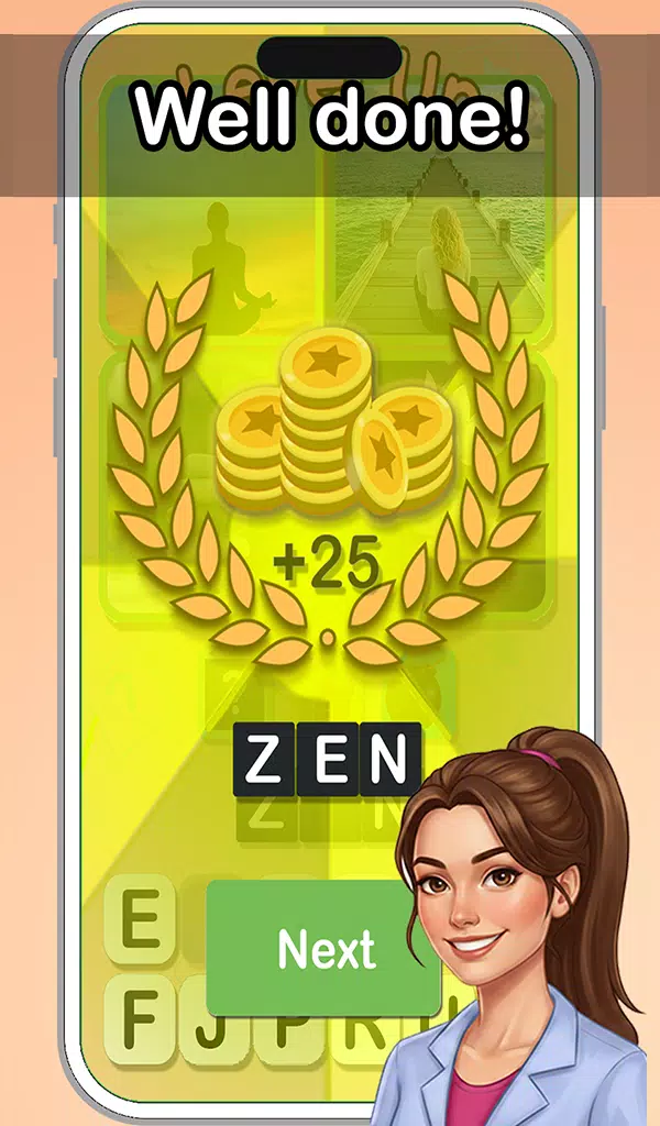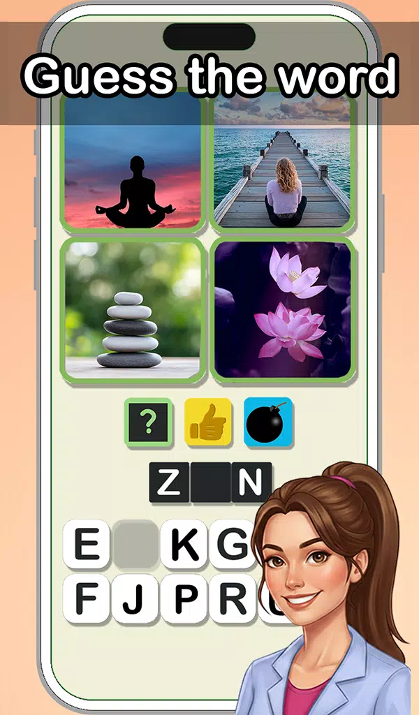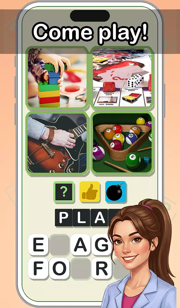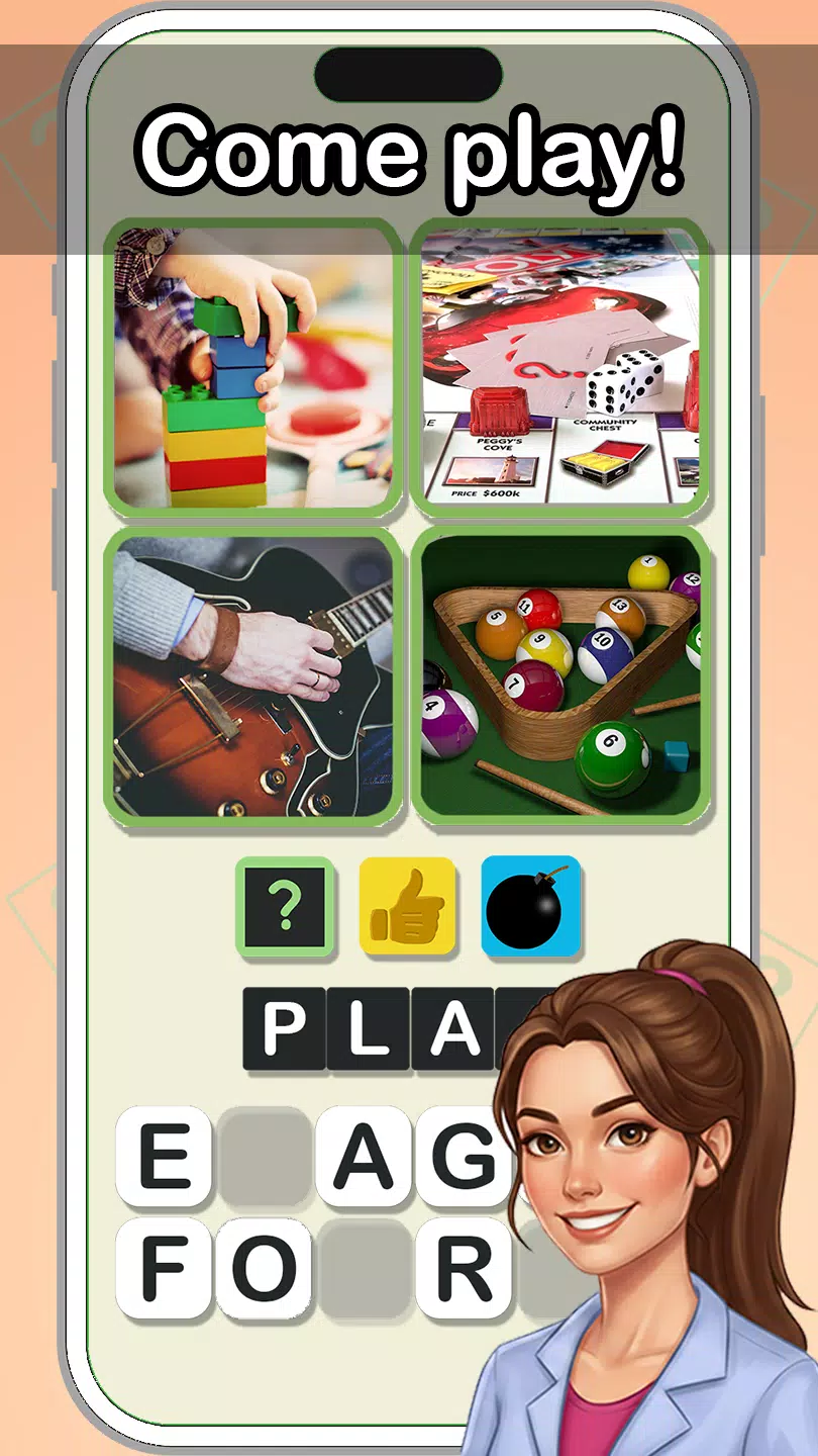 在每个关卡中,你将看到四张图片。你需要猜出与这些图片相关的单词。键盘上的字母和答案栏中的字母数量将帮助你找到谜题的答案。