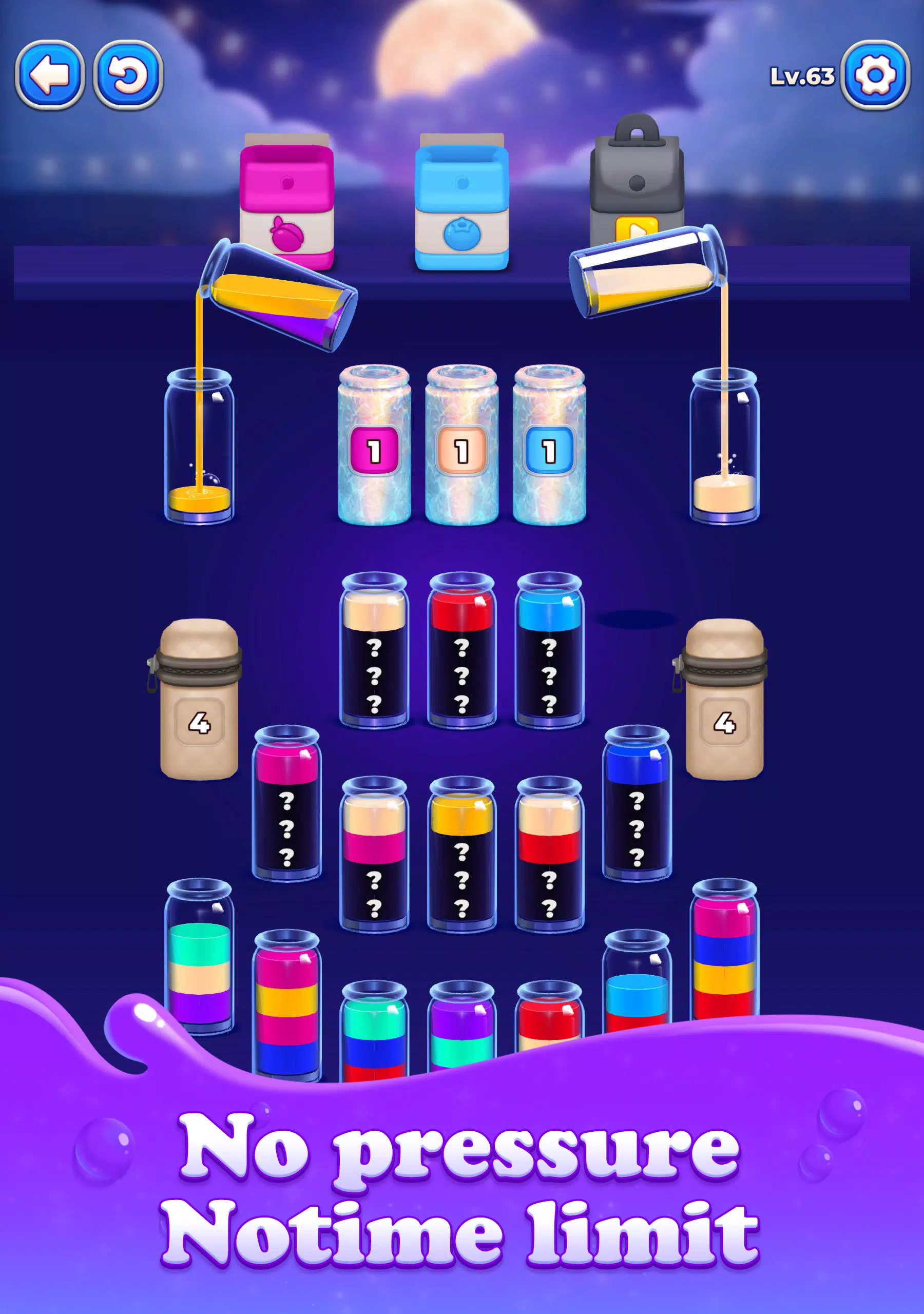 随着关卡的推进,你需要提前思考。巧妙的颜色排序决策可以帮助你管理空瓶、避开障碍物,并完成复杂的颜色谜题布局。一次错误的灌装就可能迫使你重新思考整个解决方案。