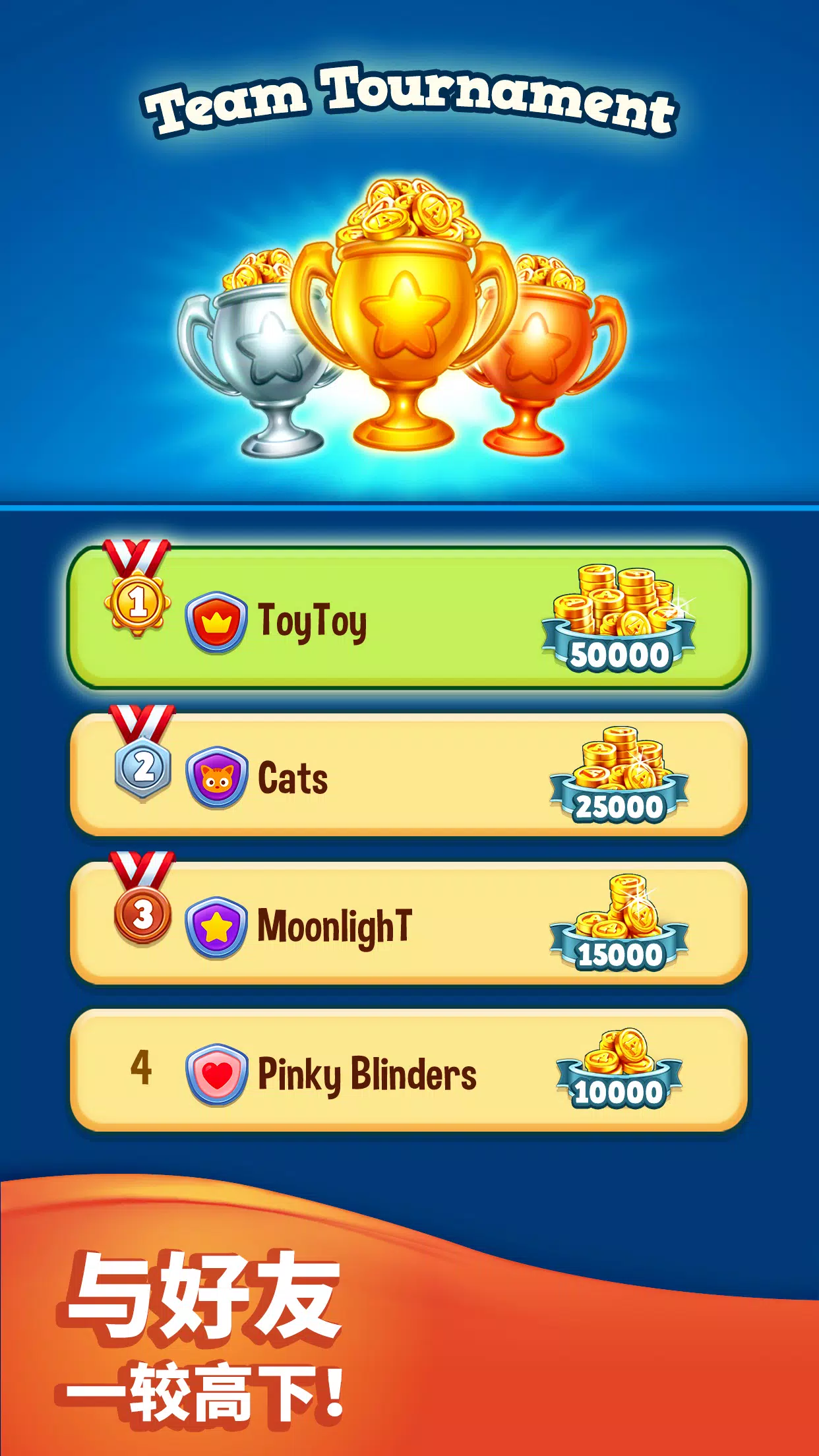 ● 每天精彩活动不断:方块派对、星星锦标赛、团队冒险、皇冠争夺、旋转派对和团队赛!