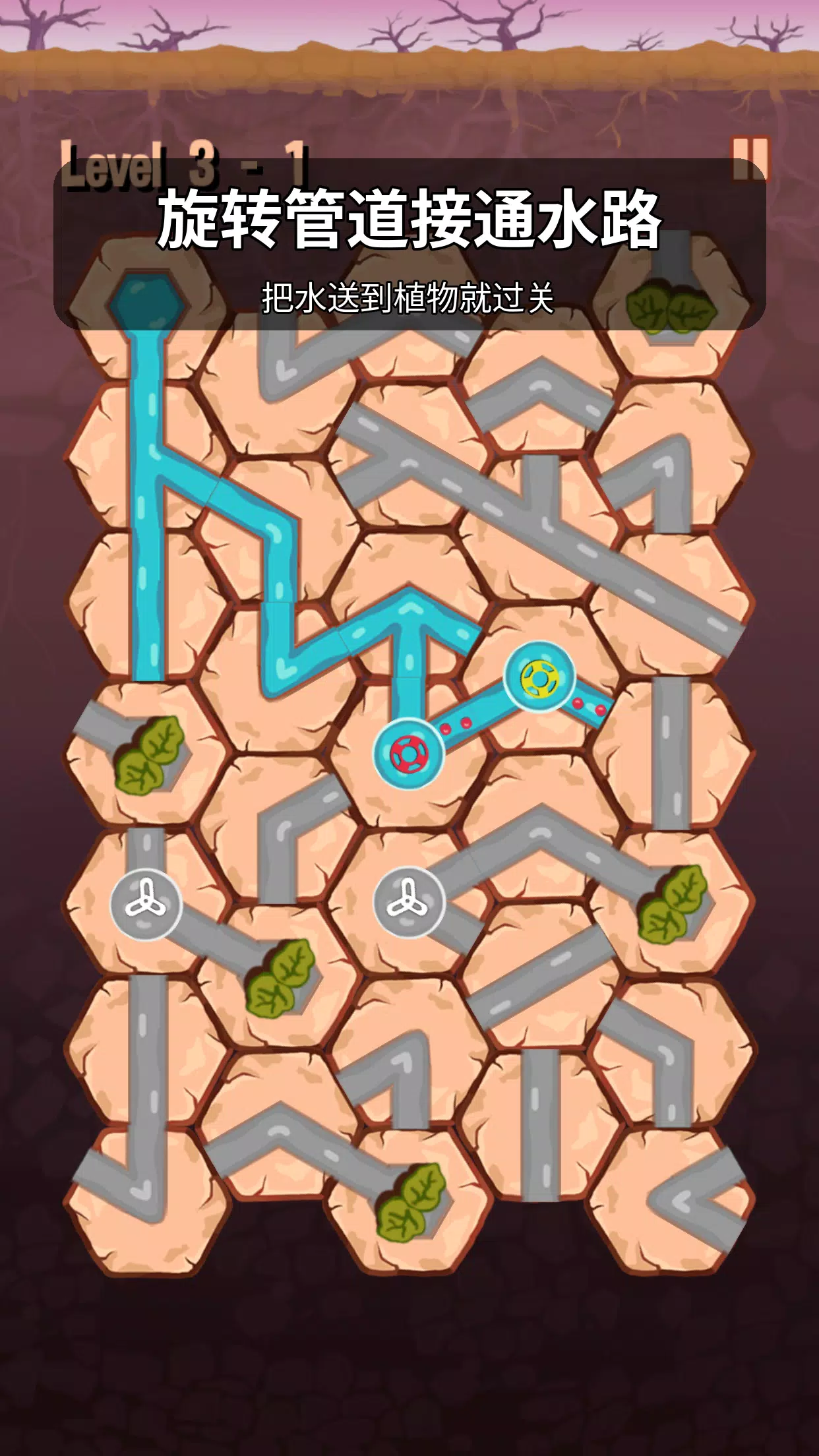 但您必须旋转水管来建立通道,让水可以顺利流到所有植物来完成关卡。