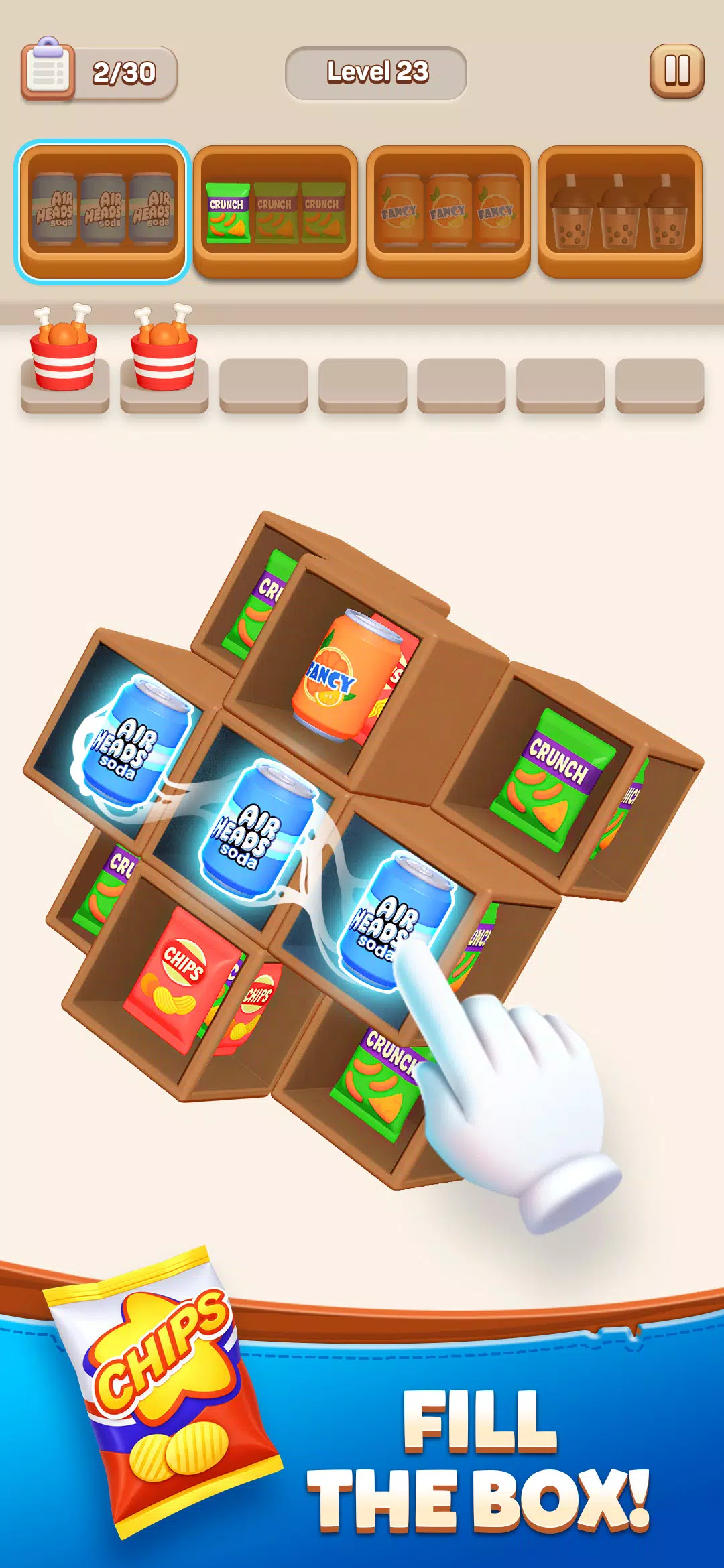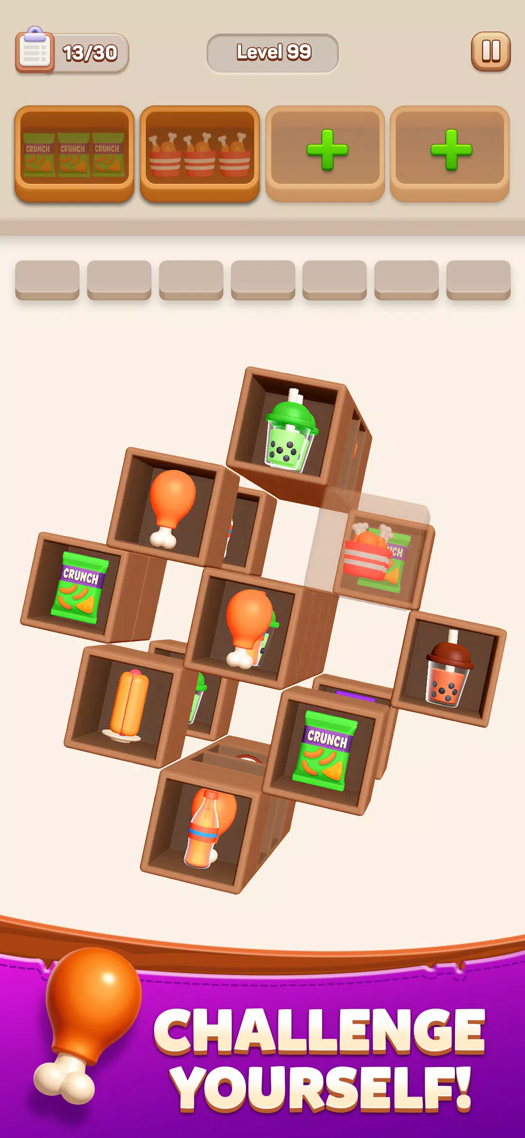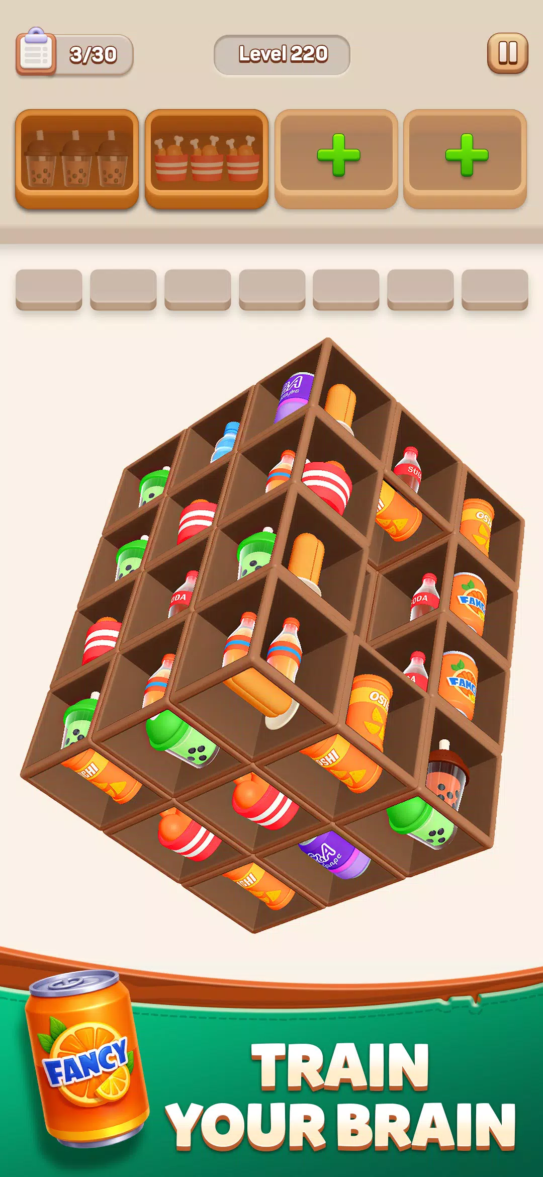 👉从简单的开始:点击 3D 物品,将三个相同的商品放入盒子中。你的分类冒险之旅就此开启!