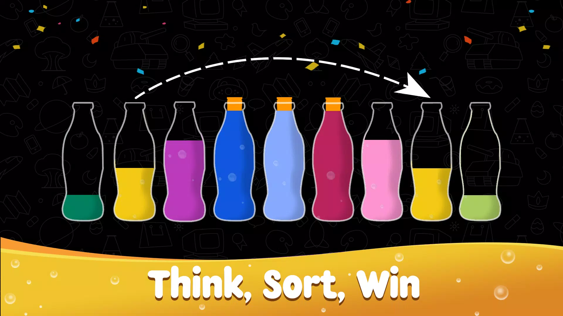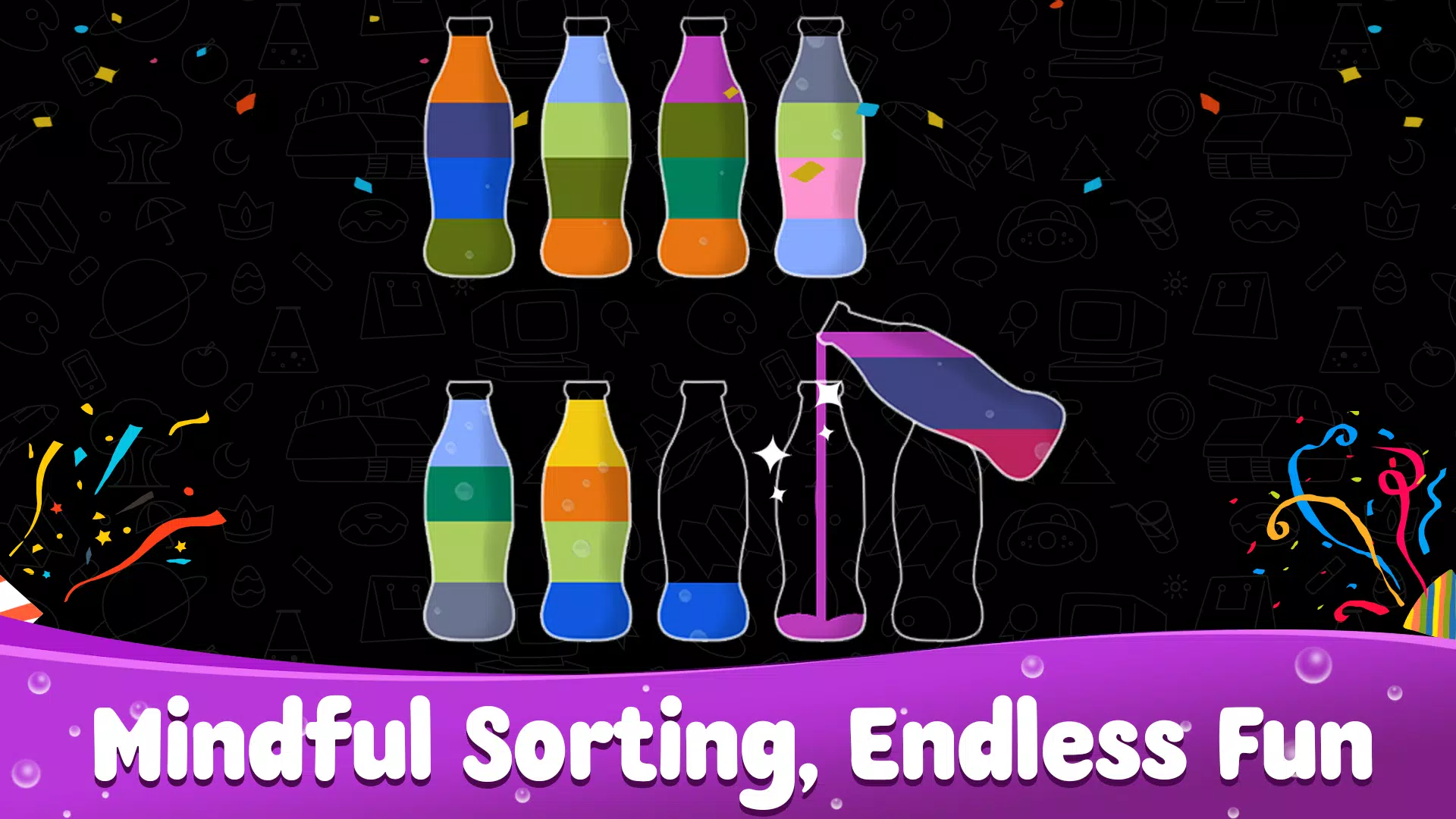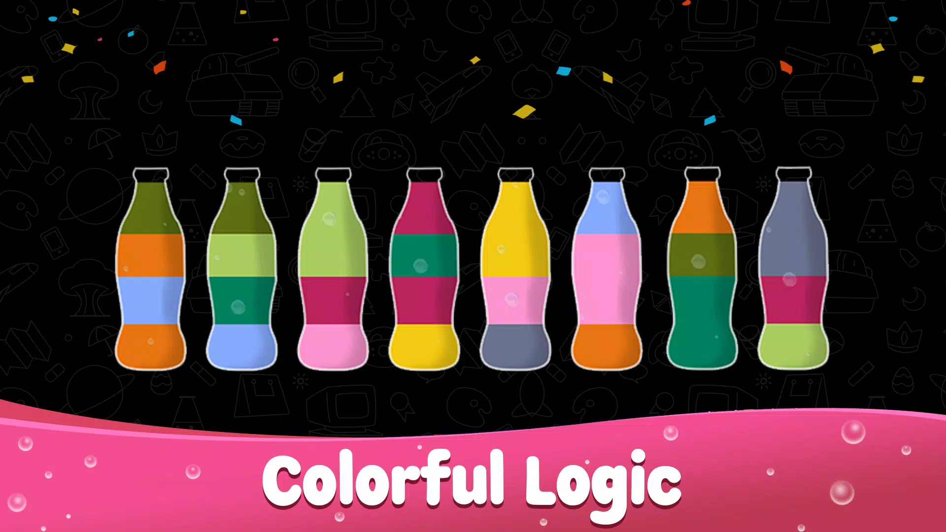 水分类谜题:液体分类是一款充满乐趣和挑战性的益智游戏。你的任务是将不同颜色的水分门别类,直到所有颜色的水都装在同一个瓶子里。这是一款轻松又充满挑战性的游戏,可以训练你的大脑!