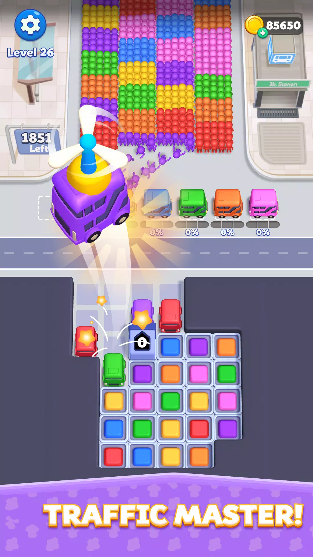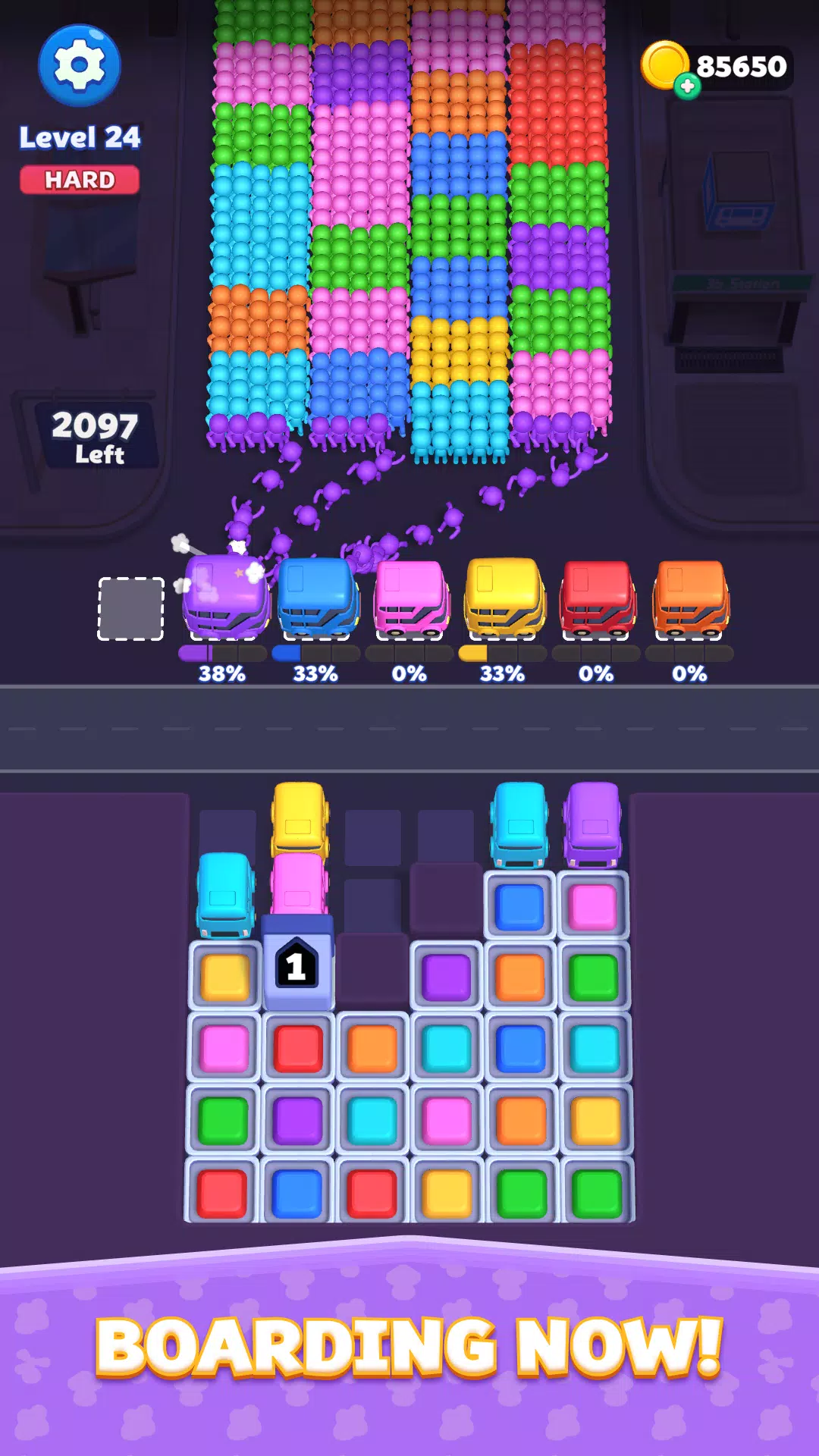 在《拥挤的公交车站:交通堵塞》中,你的智慧是让公交车畅通无阻的唯一方法!在这款色彩缤纷的益智游戏中,你需要根据颜色将乘客匹配到正确的公交车上,管理好路线,并避免交通堵塞。