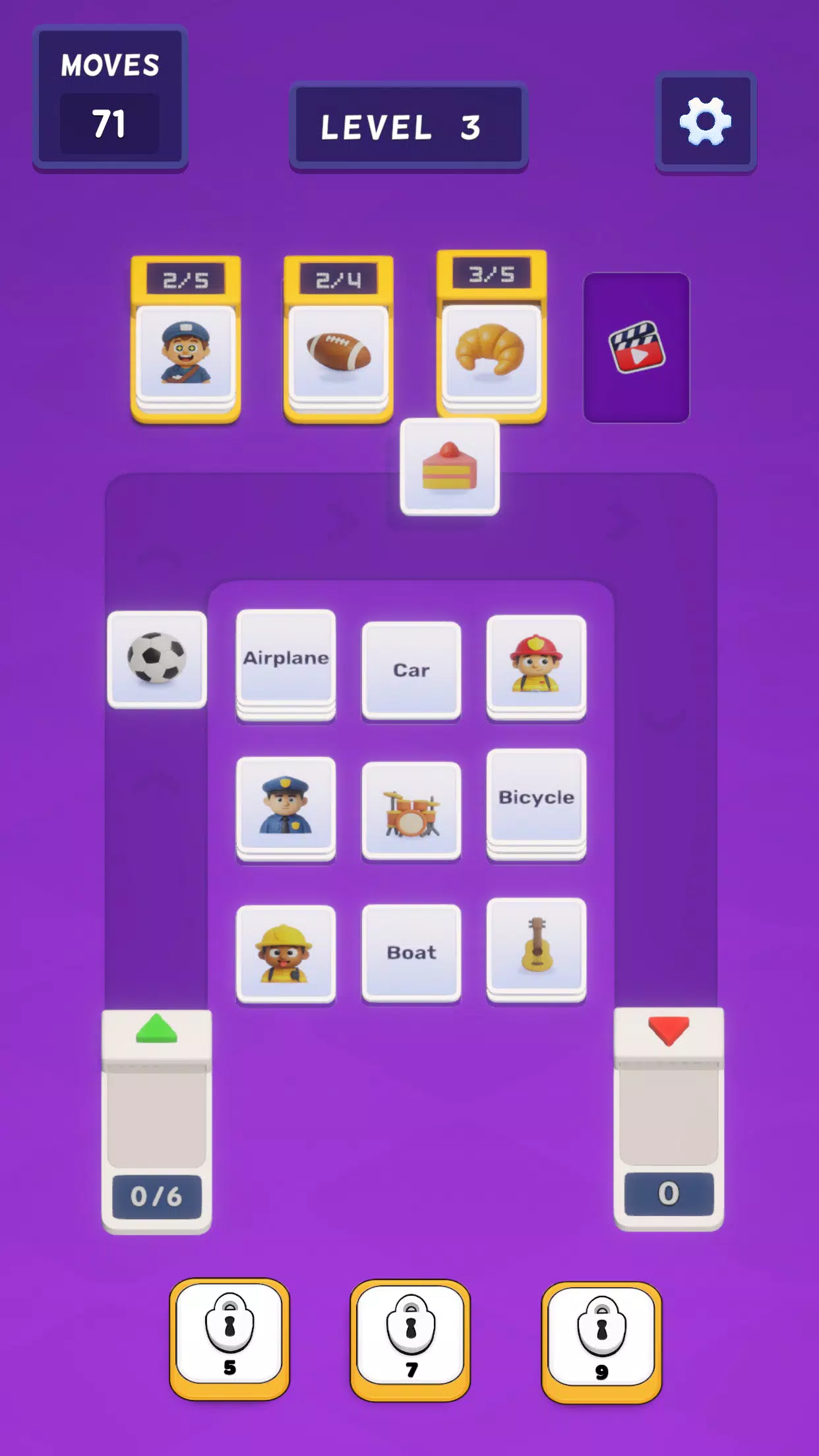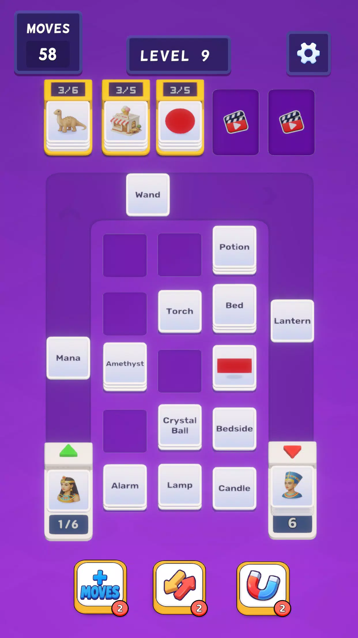 卡牌会持续在棋盘中央移动,你的任务是引导它们到达正确的目的地。提前思考,规划好你的每一步,保持卡牌的流动,即可完成每个关卡。
