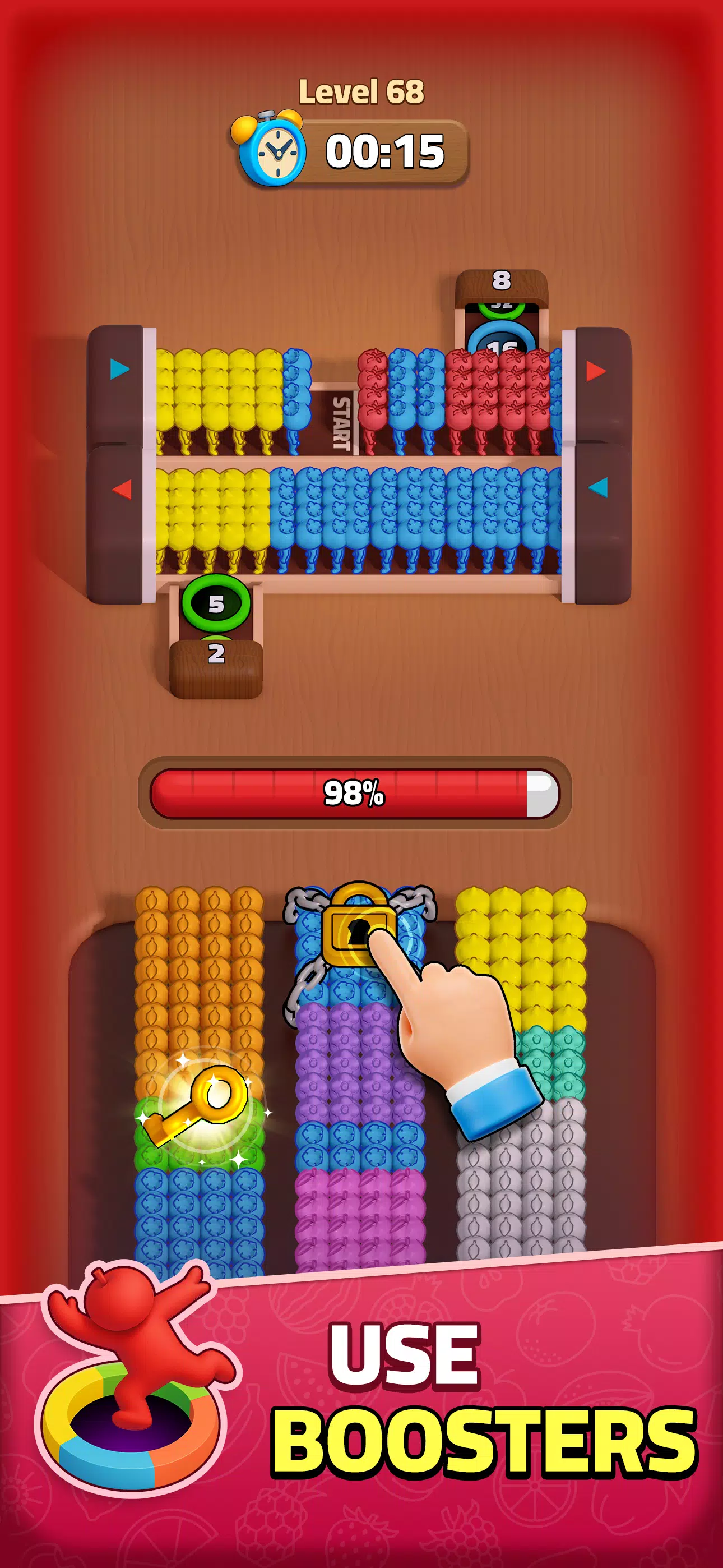 – 点击并按住你的彩色小人,让他们跑到传送带上。