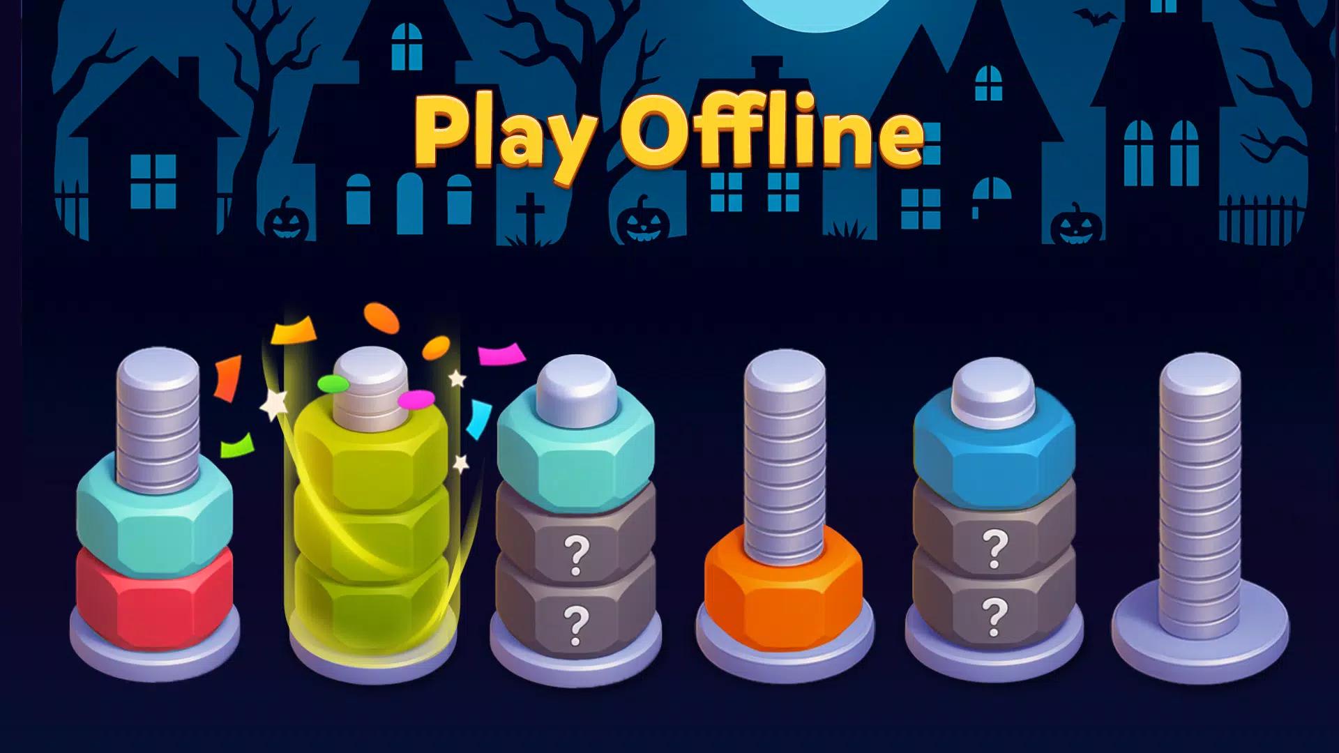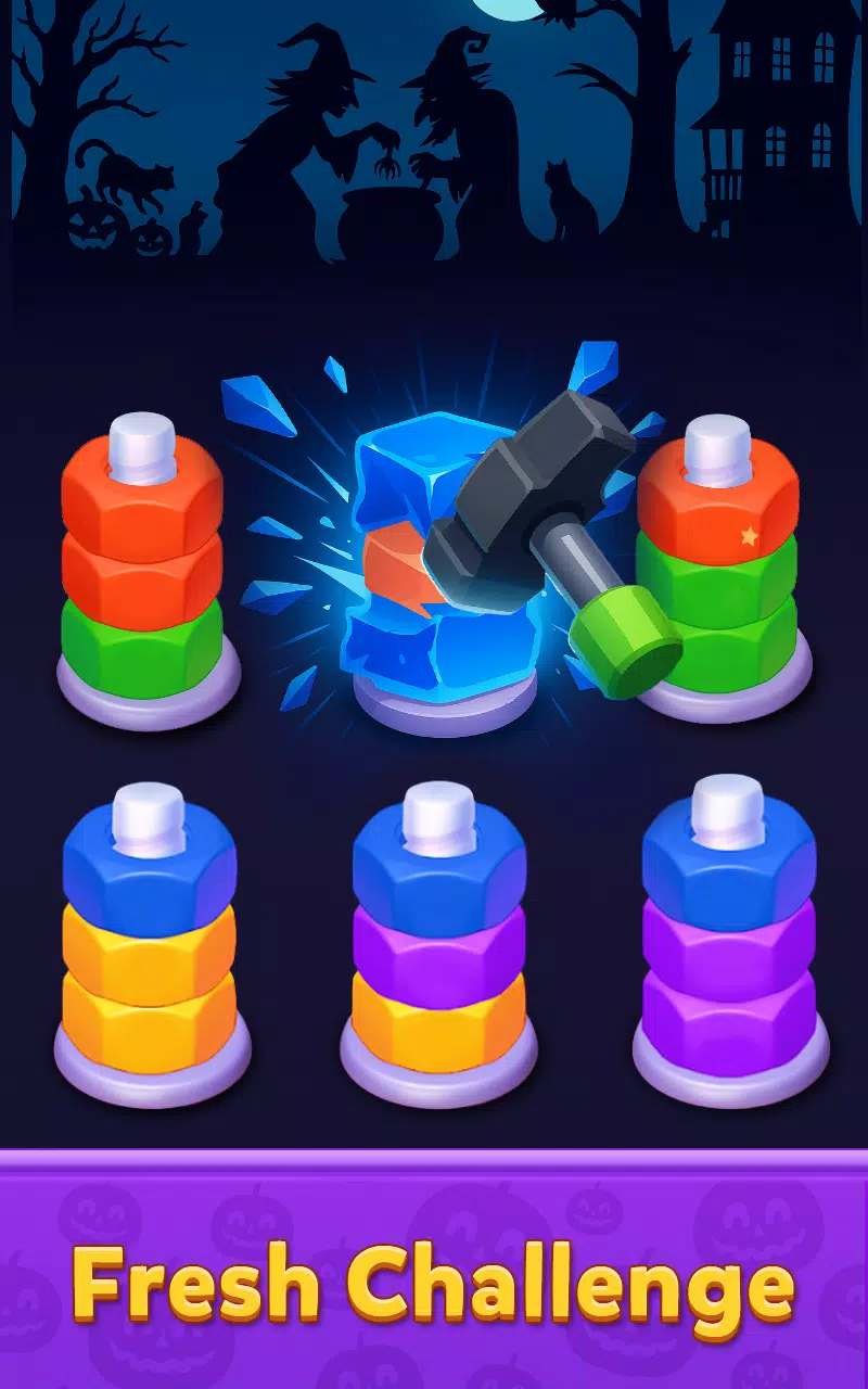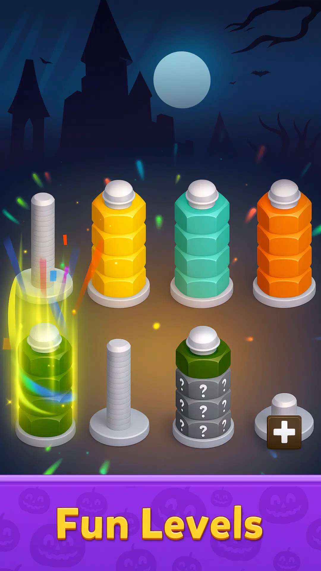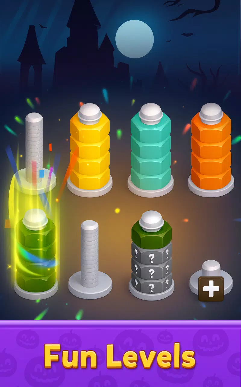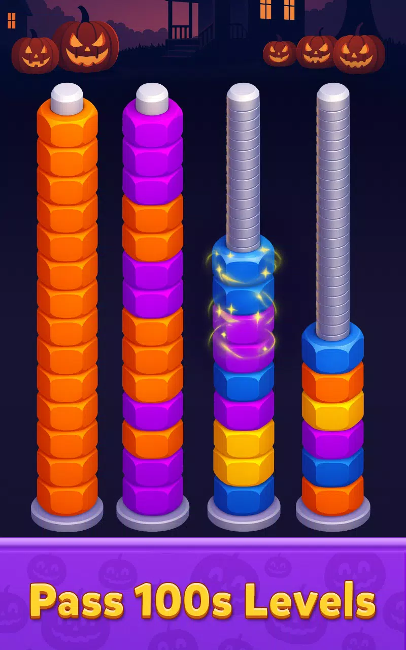 这款令人上瘾的螺母和螺栓游戏邀请你匹配、分类和堆叠色彩鲜艳的螺母,以解决独特的颜色排序难题。凭借其直观的玩法和令人满意的合并机制,《坚果狂热》是一款完美的益智休闲排序益智游戏,同时也是一款逻辑和智力游戏。