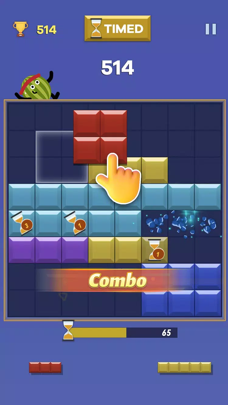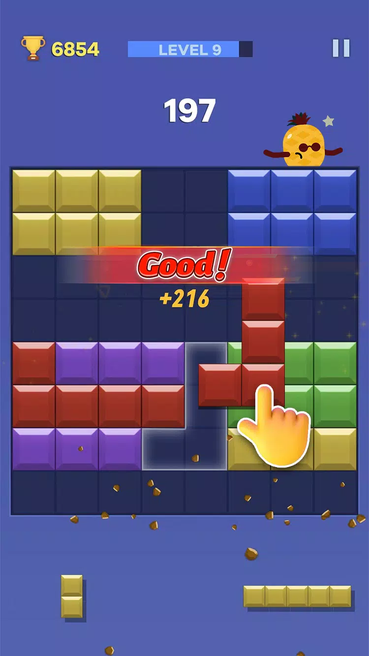 只需用手指按住方块碎片,并将其拖动到拼接区域即可放置。一旦方块碎片水平或垂直填满,即可消除。