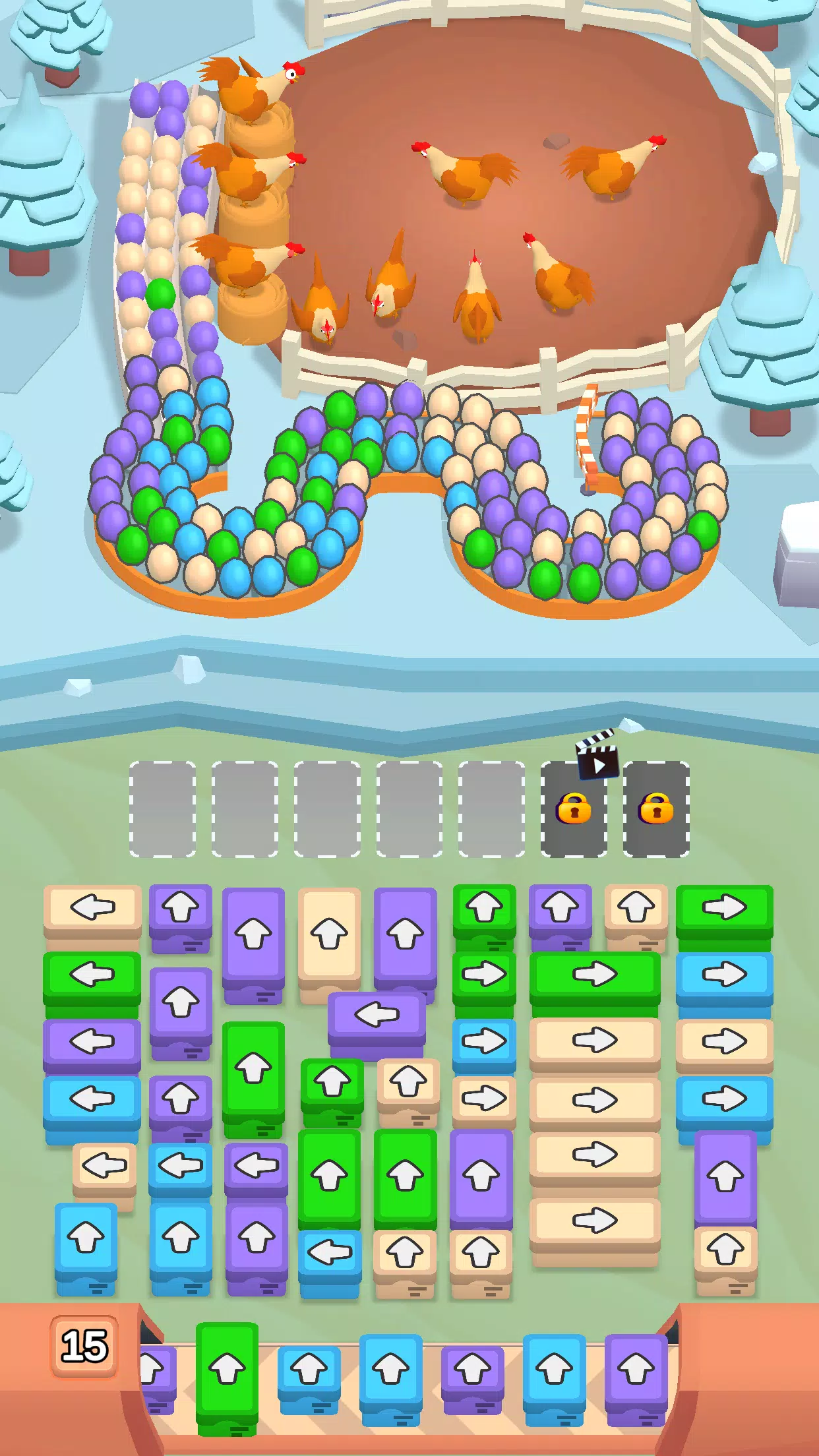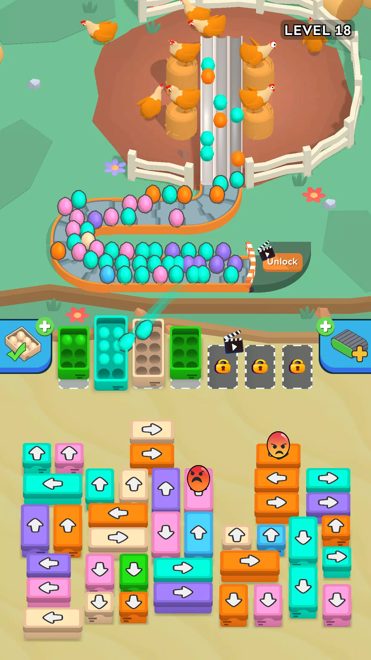 农场里有很多母鸡下蛋,蛋的颜色随机。在这个益智游戏中,你需要精准点击传送带上与蛋颜色匹配的盒子来收集鸡蛋。不同大小的盒子可以容纳不同数量的鸡蛋。游戏共有 7 个空位可以存放盒子。随着关卡的推进,鸡蛋的数量会逐渐增加,颜色分布也会变得更加复杂。这将极大地考验你的分配技巧。制定策略,高效地完成收集任务吧!快来体验这场充满色彩与逻辑的趣味之旅!