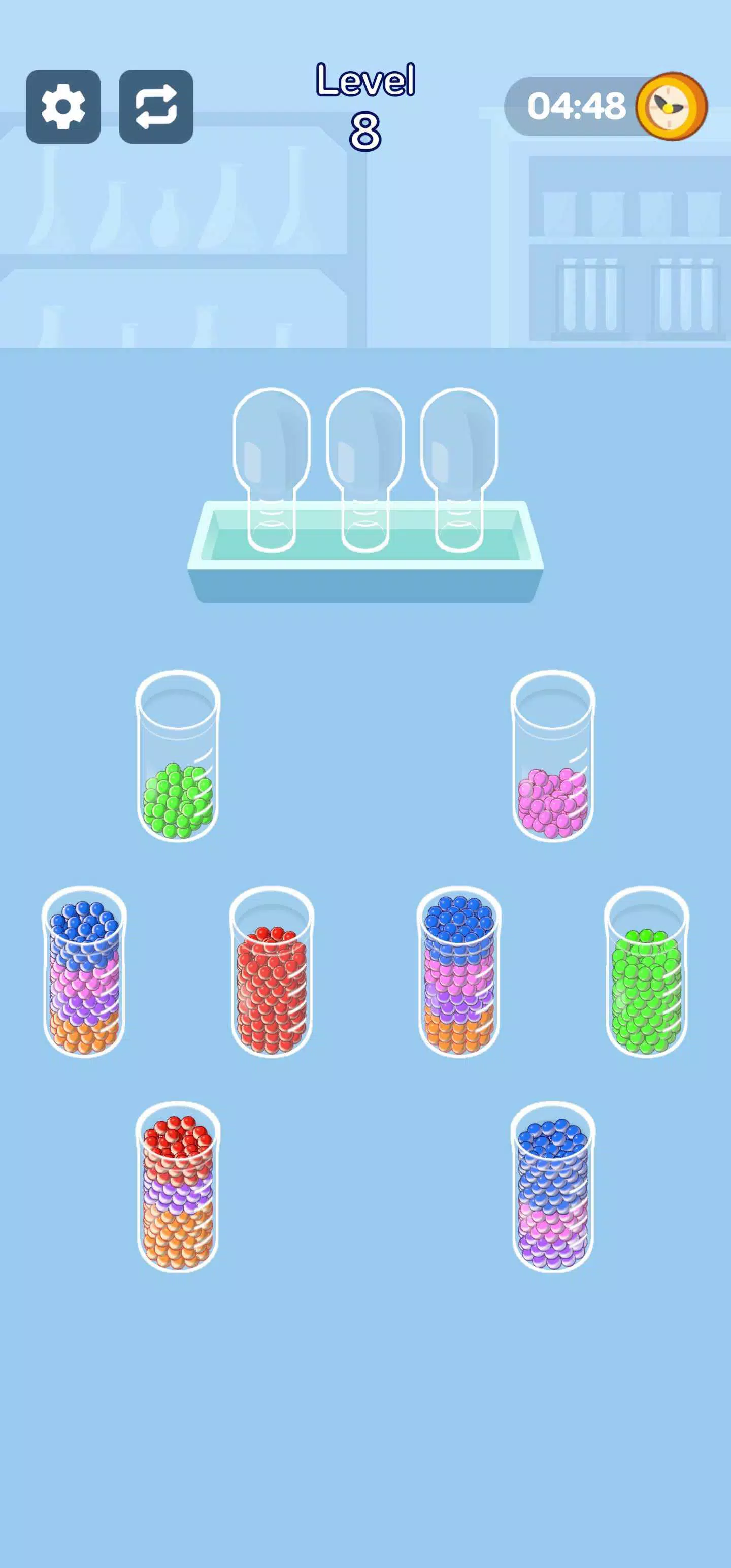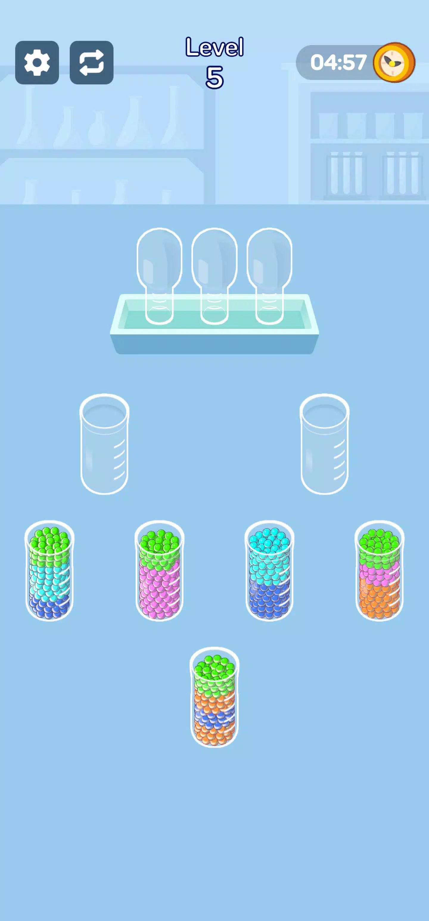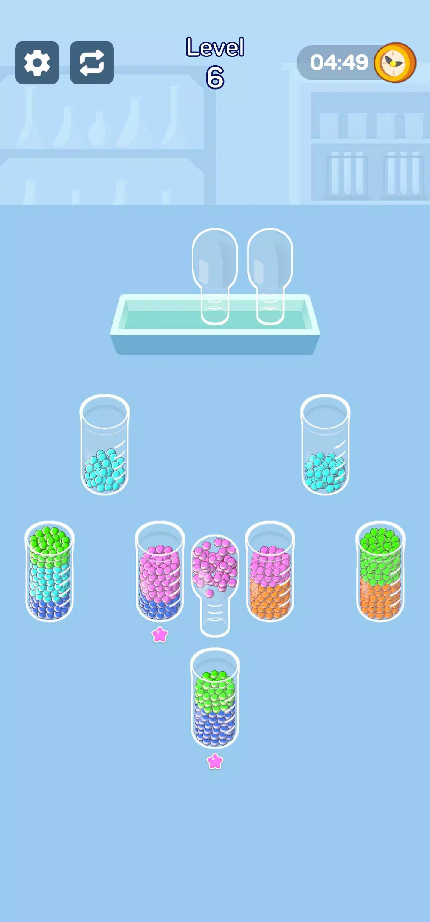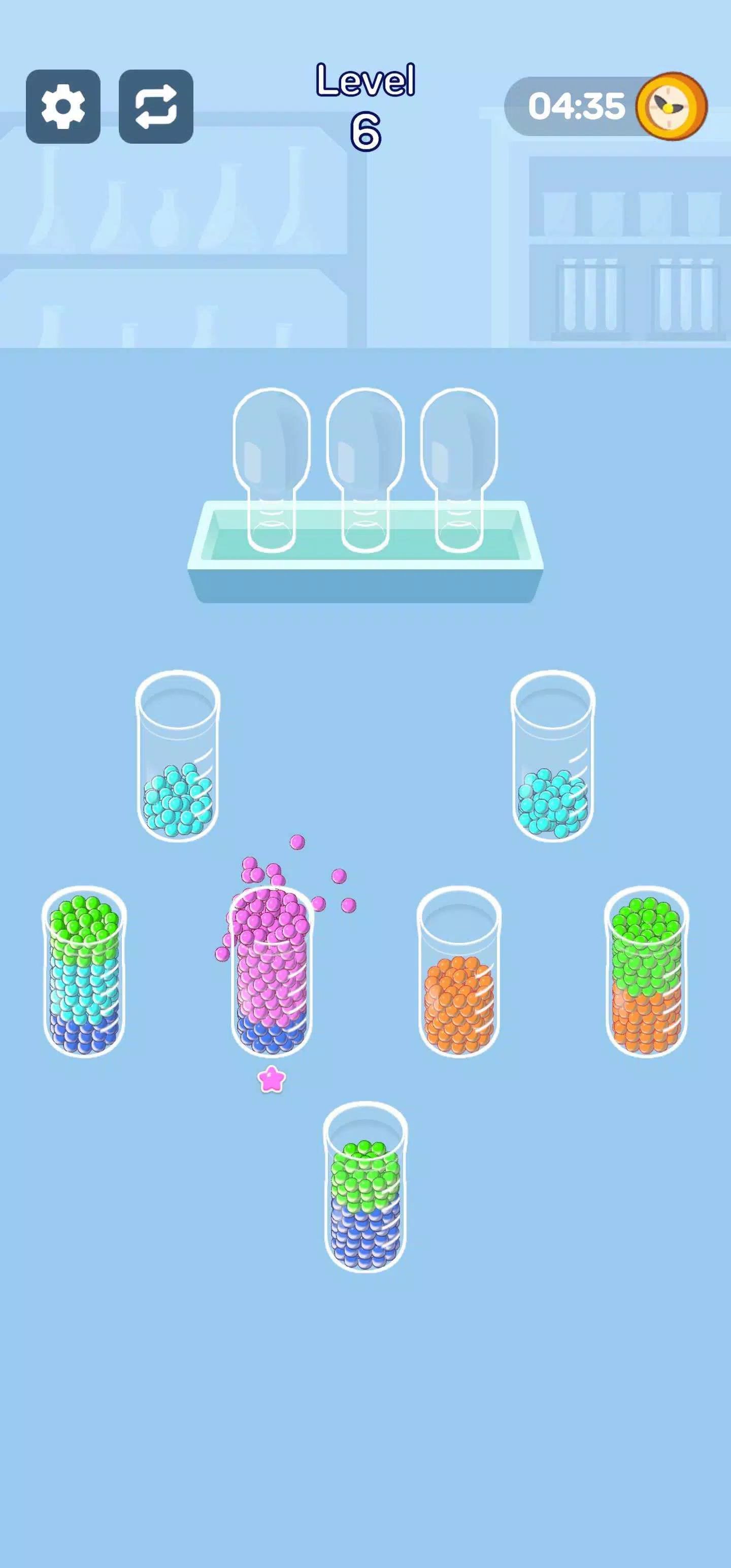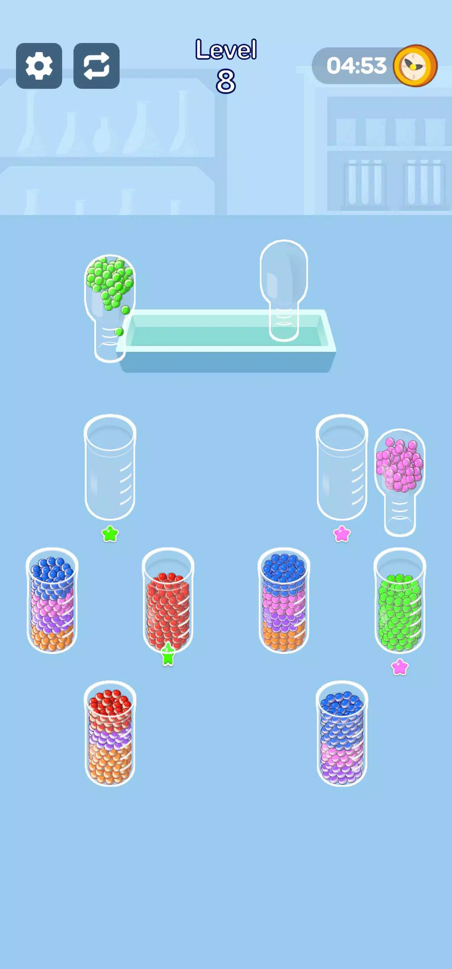 点击一个杯子,然后点击另一个杯子来倒出珠子。