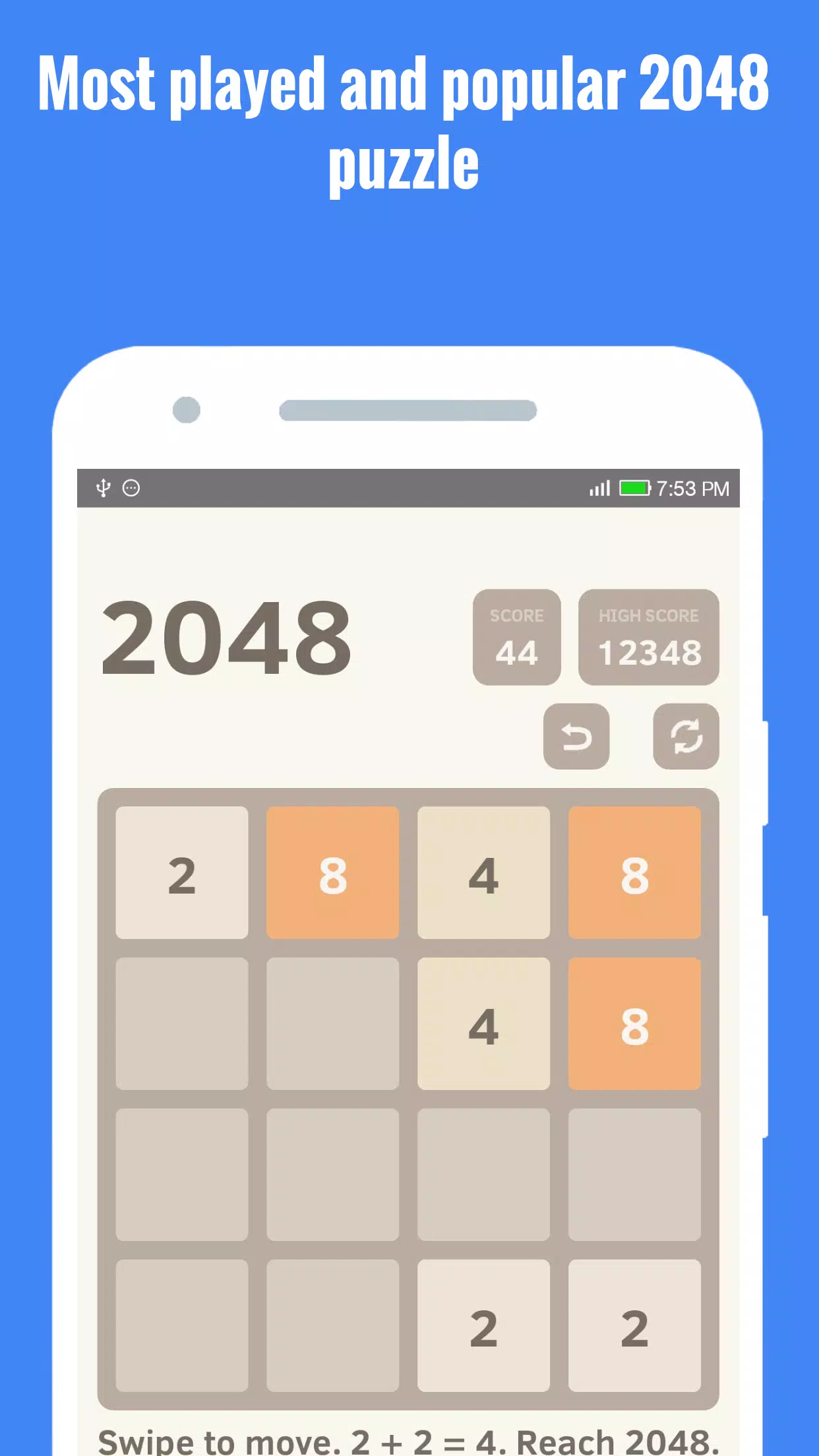 滑动屏幕来移动方块。当两个相同数字的方块滑动触碰时,它们会合并成一个更大的方块!达到 2048 即可赢得游戏。