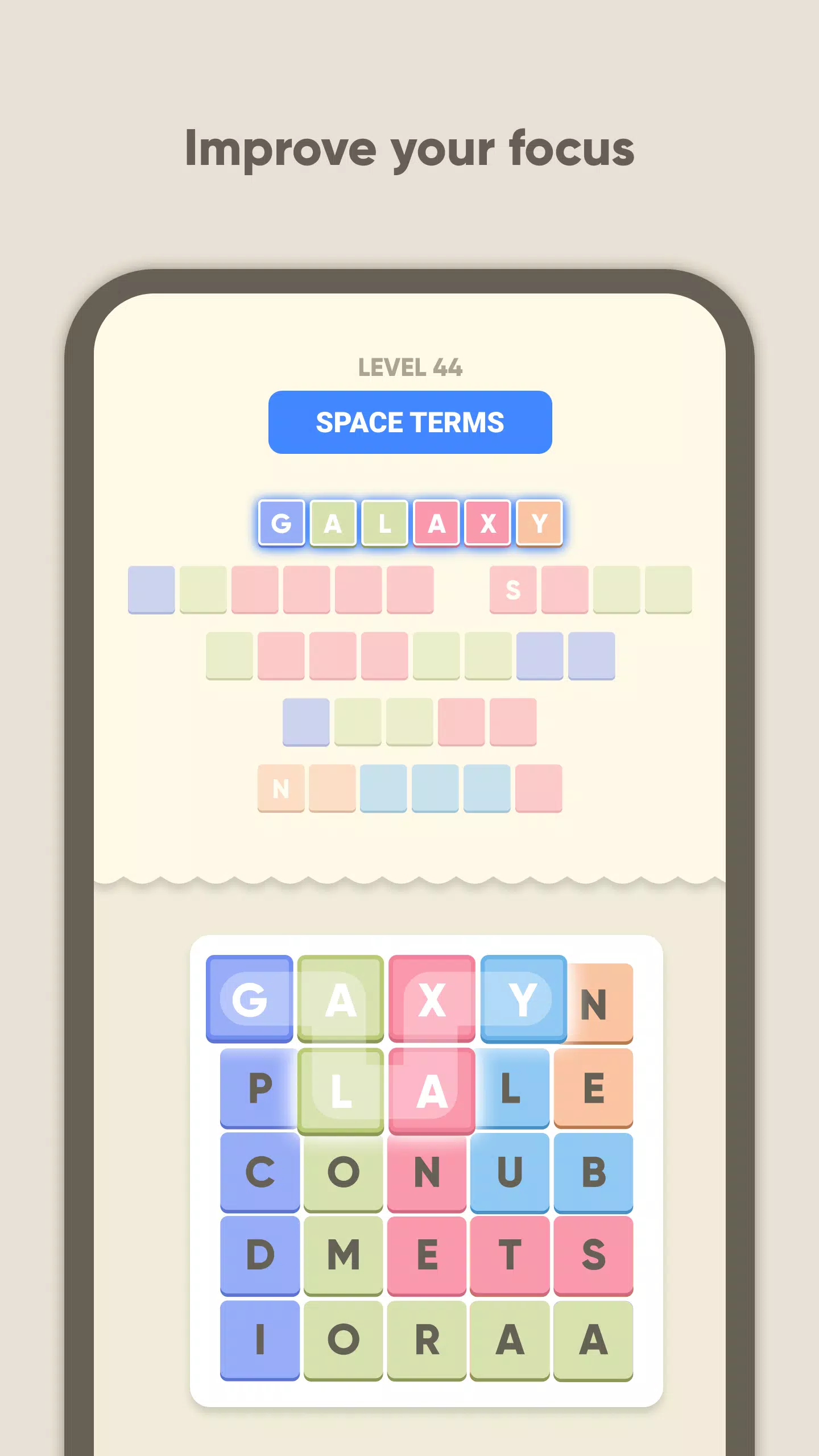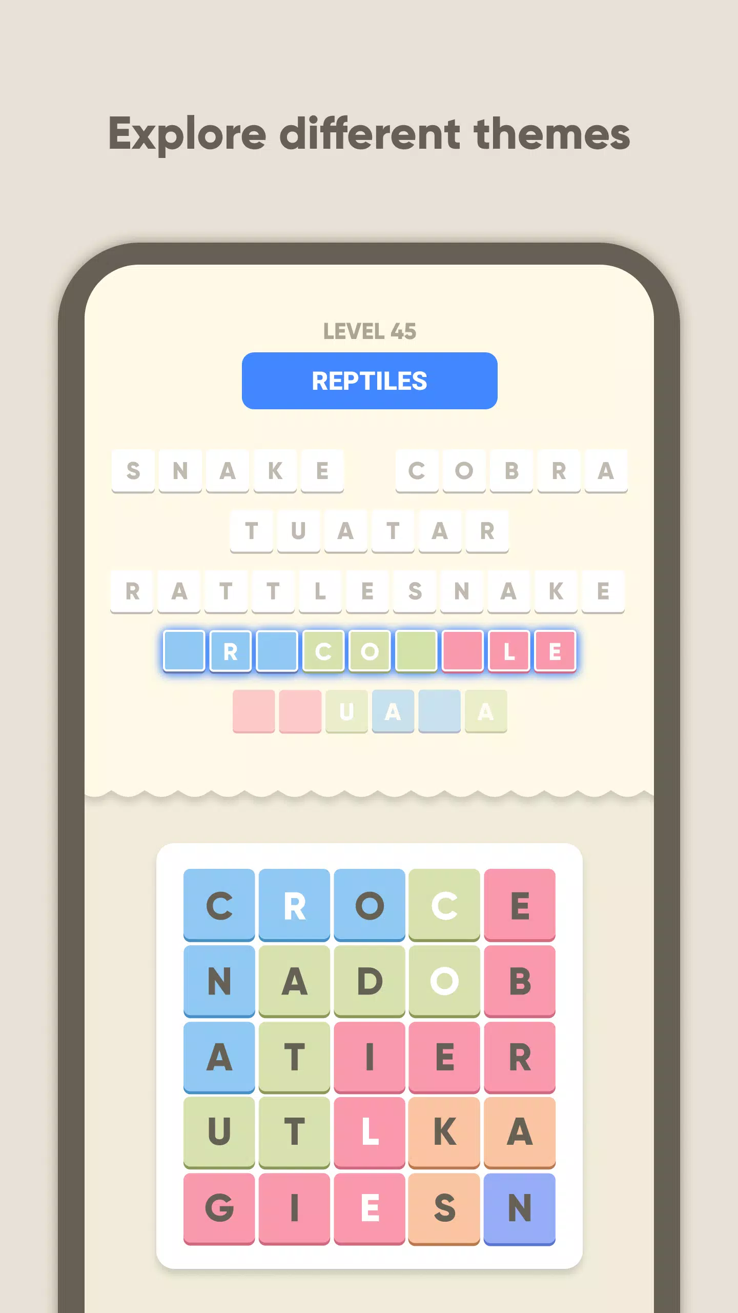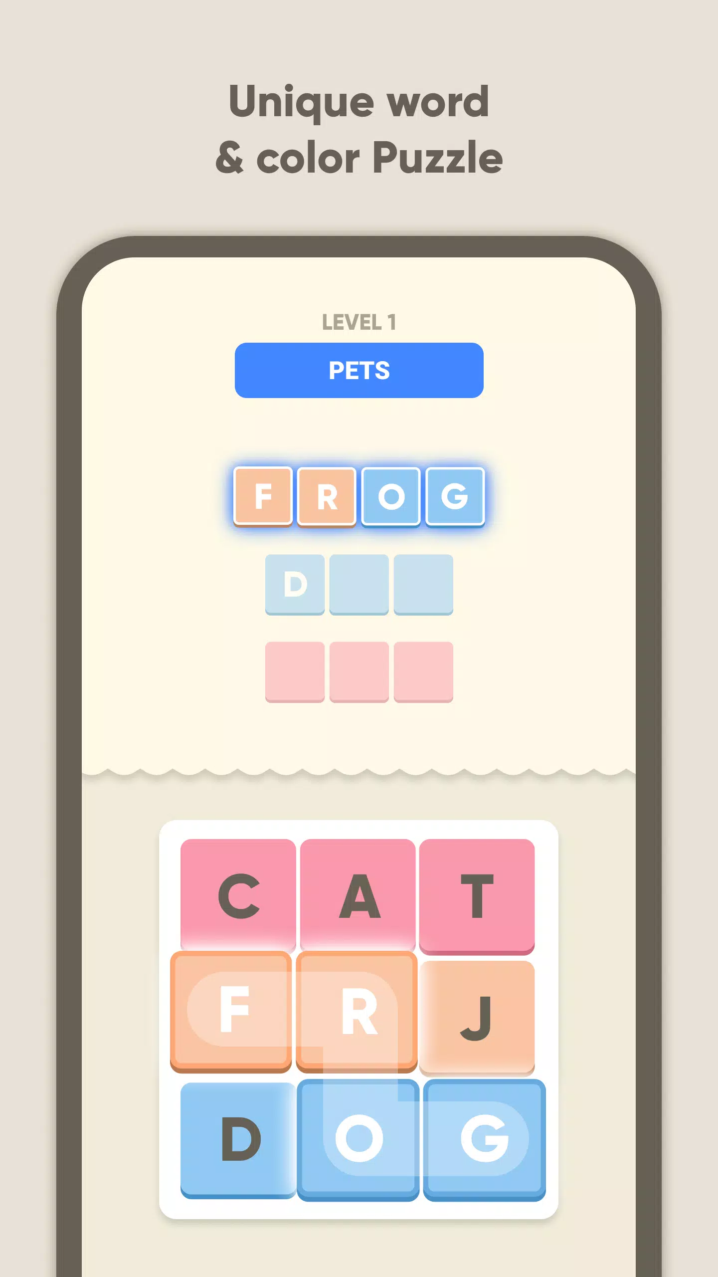 每个关卡都呈现一个由彩色字母组成的网格。你的目标?通过识别颜色和字母的规律来找到并排列正确的单词。从简单的谜题开始,逐渐挑战更复杂的挑战,这将真正考验你的词汇量和逻辑能力!
