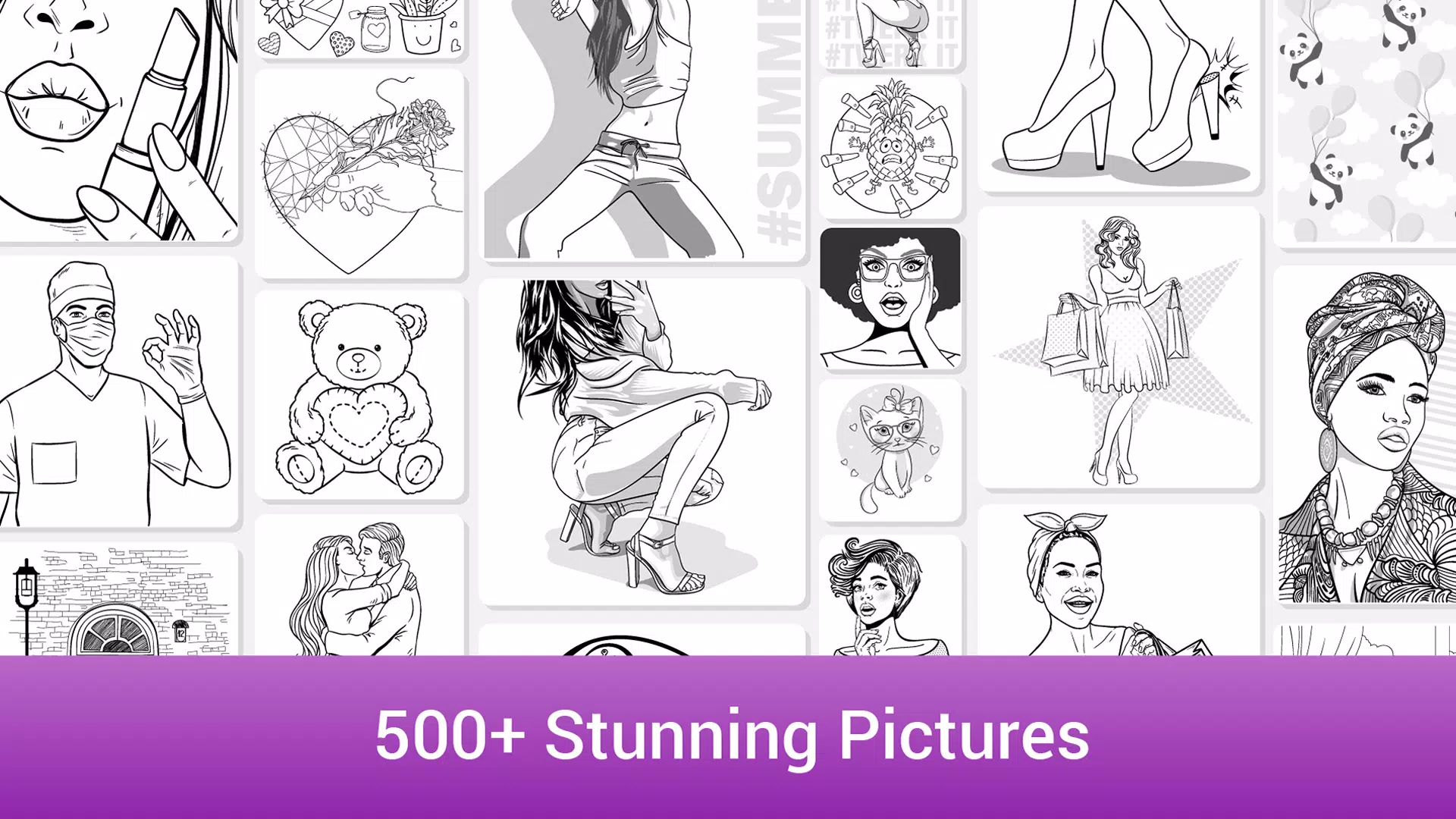 Note: All pictures are suitable as coloring books for adults and kids. This is a classic drawing app, not a “color by number” game.
