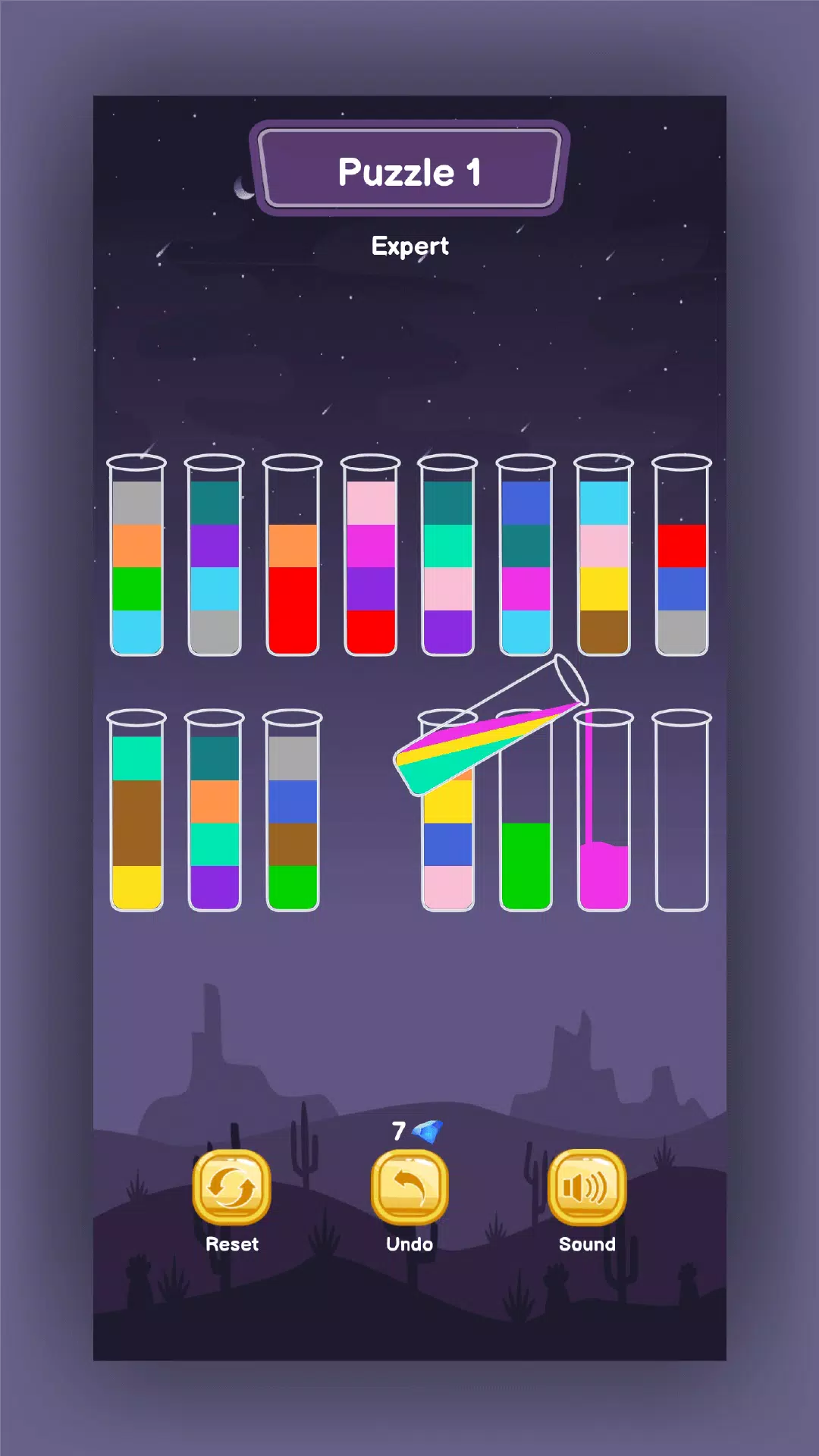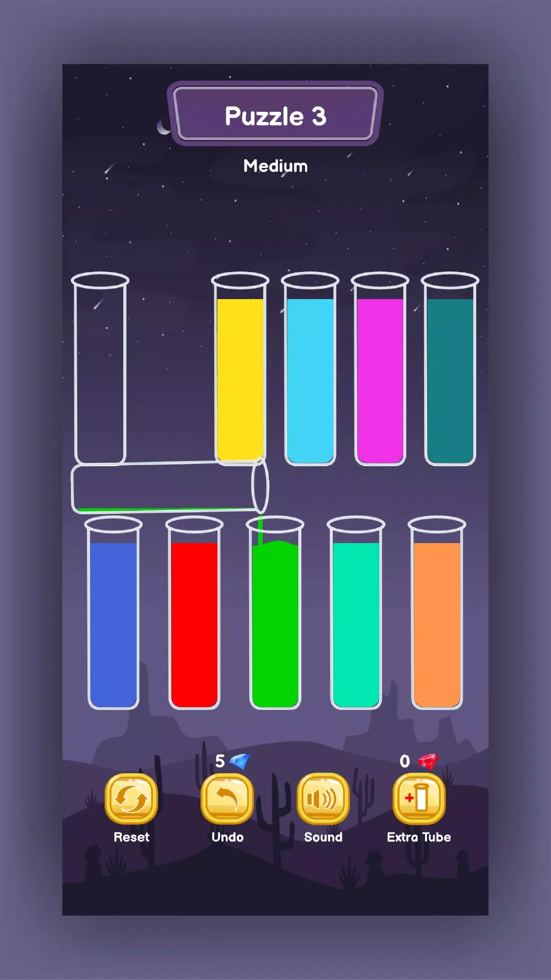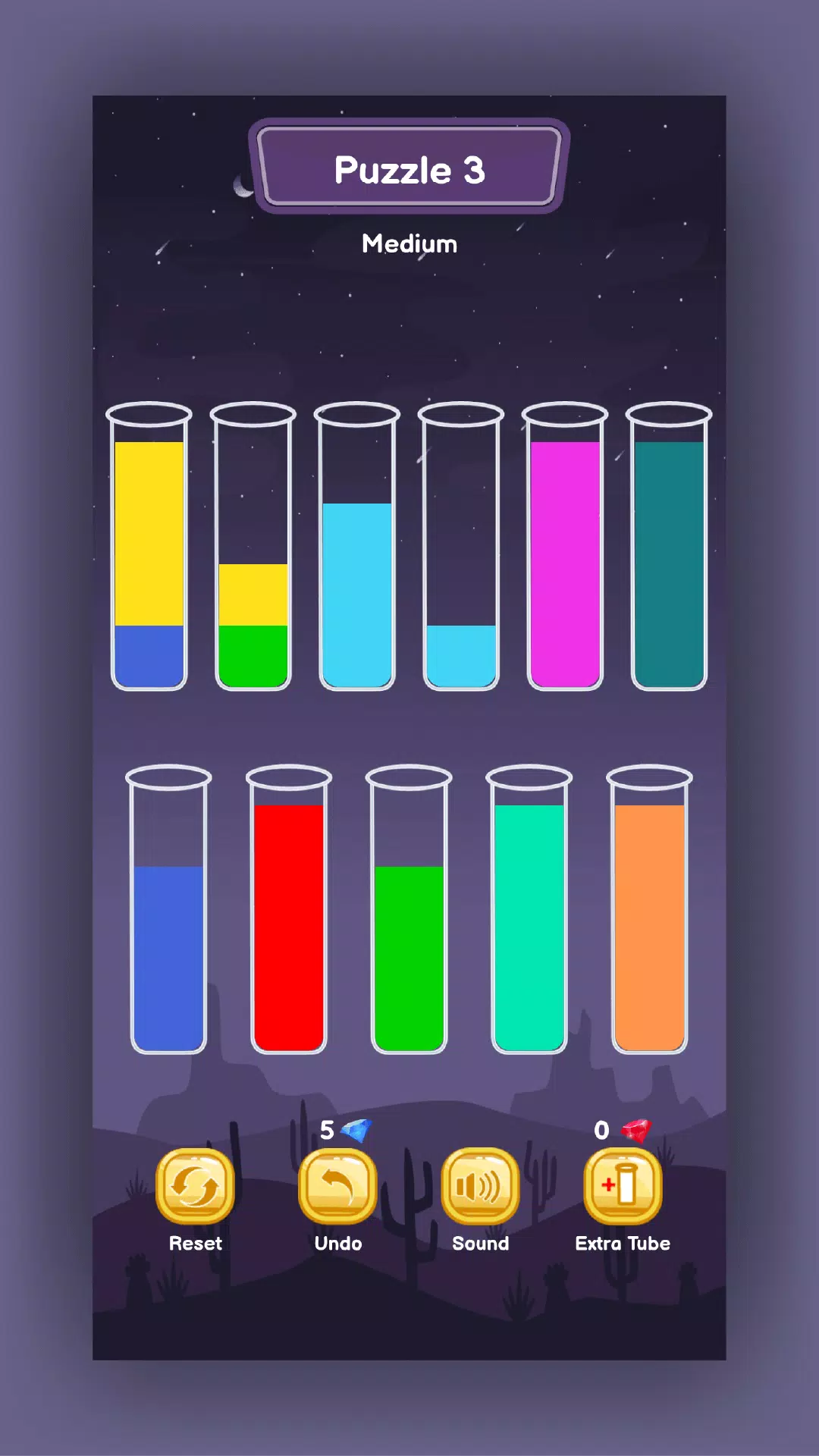 游戏还具有许多实用功能,可帮助你更轻松地解决谜题。例如,如果你在某个关卡中卡住了,你可以添加一个额外的管子来帮助你更轻松地对颜色进行排序。如果你犯了错误,你可以撤销操作并重试。