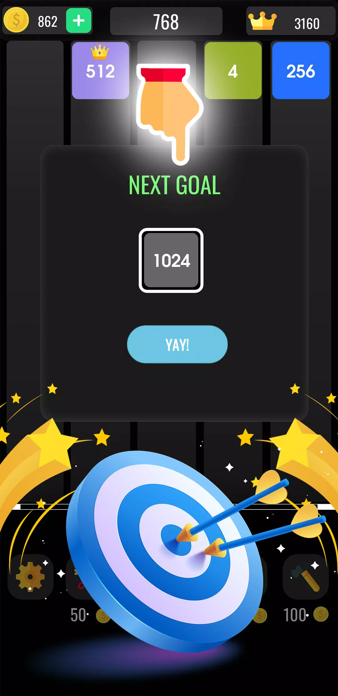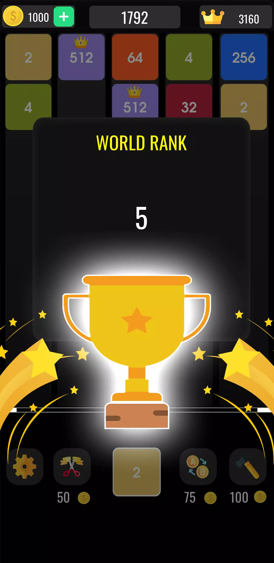合并图块:点击屏幕向上推图块。具有相同数字的图块在碰撞时将合并,用它们的总和创建一个新的图块。