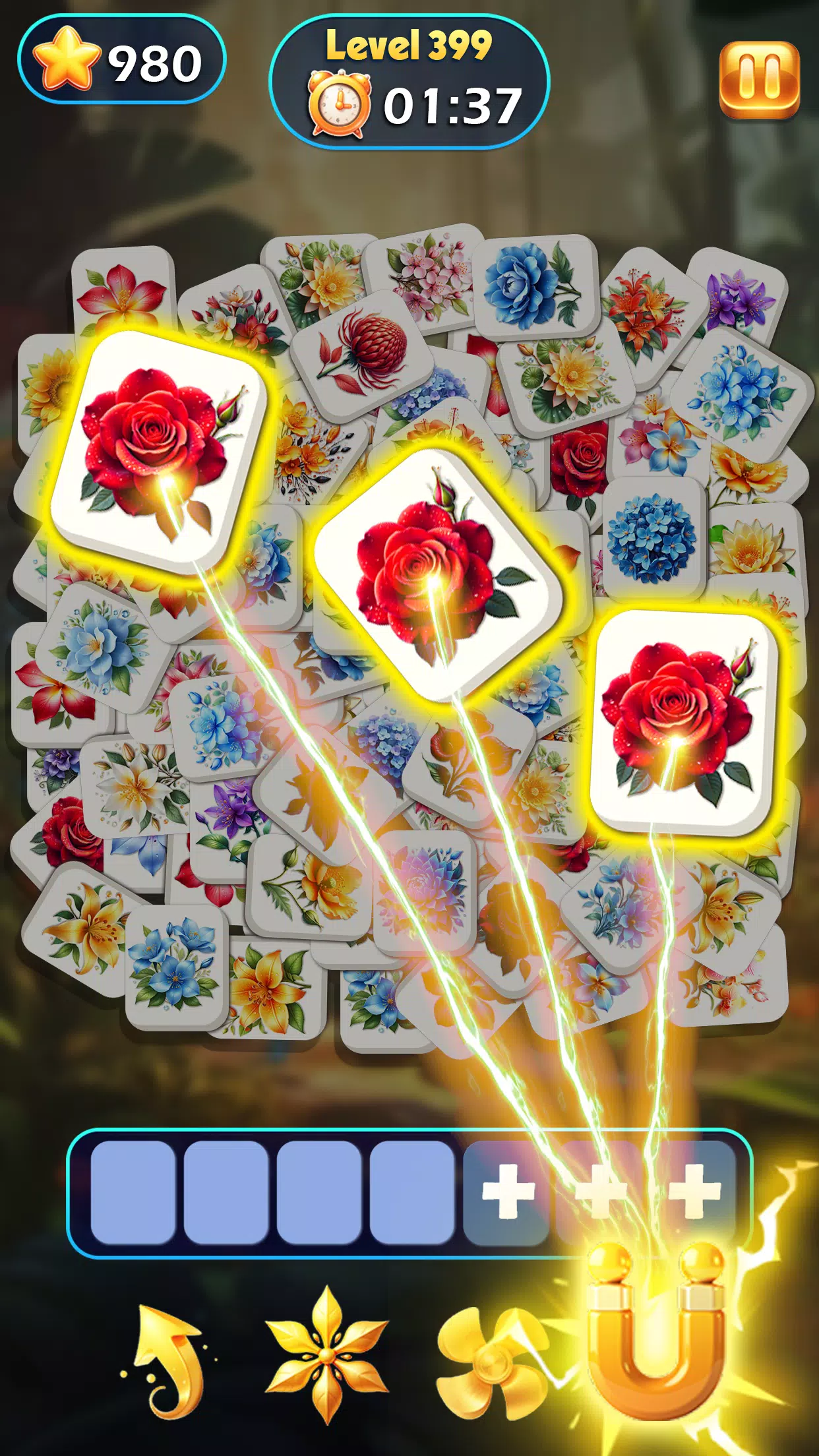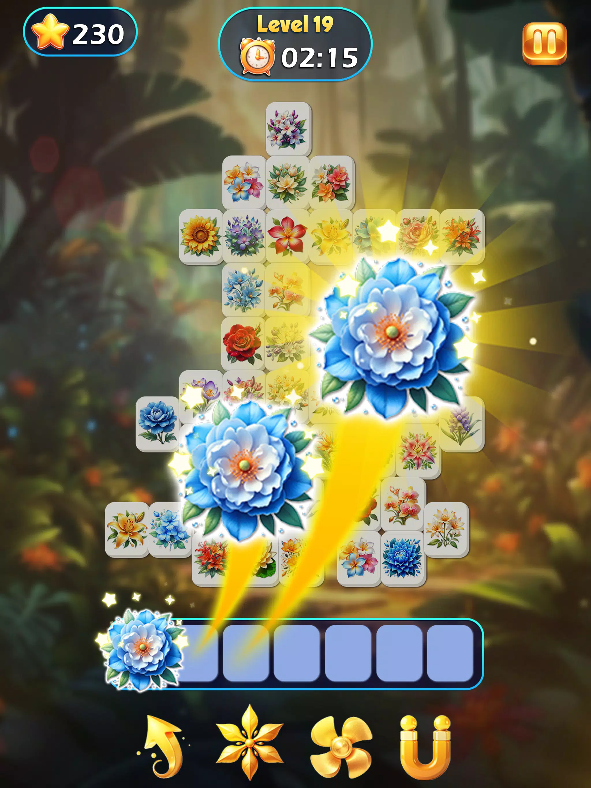 🌷🥀🌻 在《神秘花砖》中,您的目标是匹配三个或更多相同的花砖,将它们从棋盘上清除并获得宝贵的积分。 匹配得越快,获得的星星就越多。
