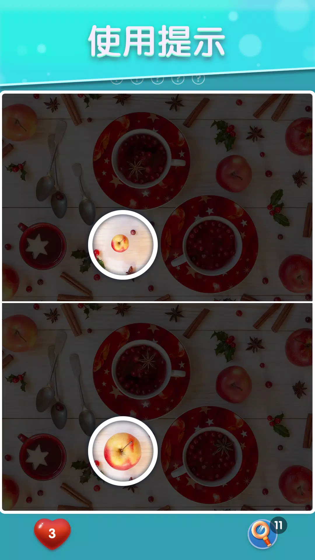 ● 规则简单!找出两张相似图片之间的不同之处,然后点击这些点来标记它们。您还可以使用提示来查看图片中的不同之处。