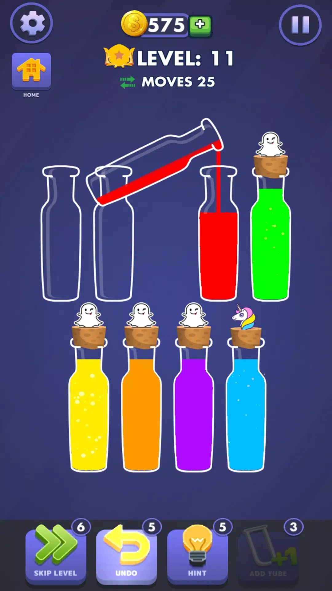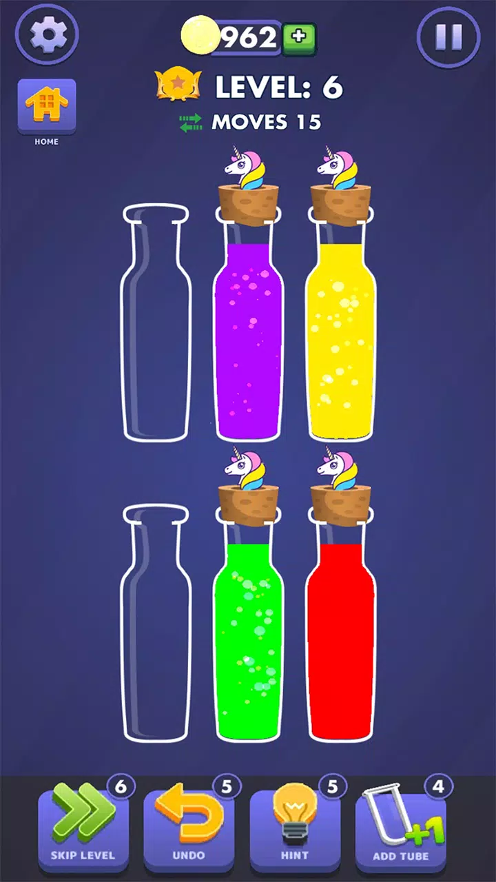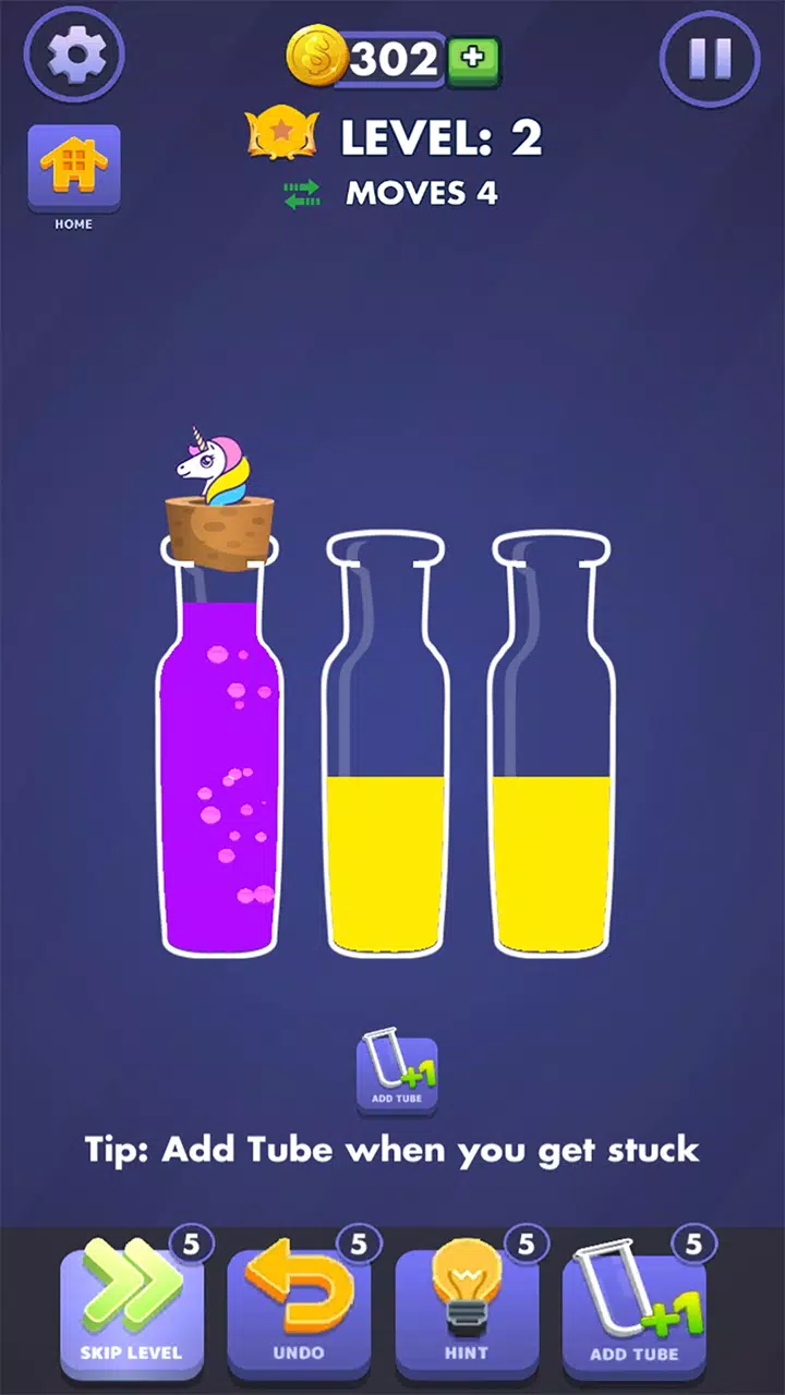 • 点击任何水管,将水移动到装有相同颜色水的水管中。