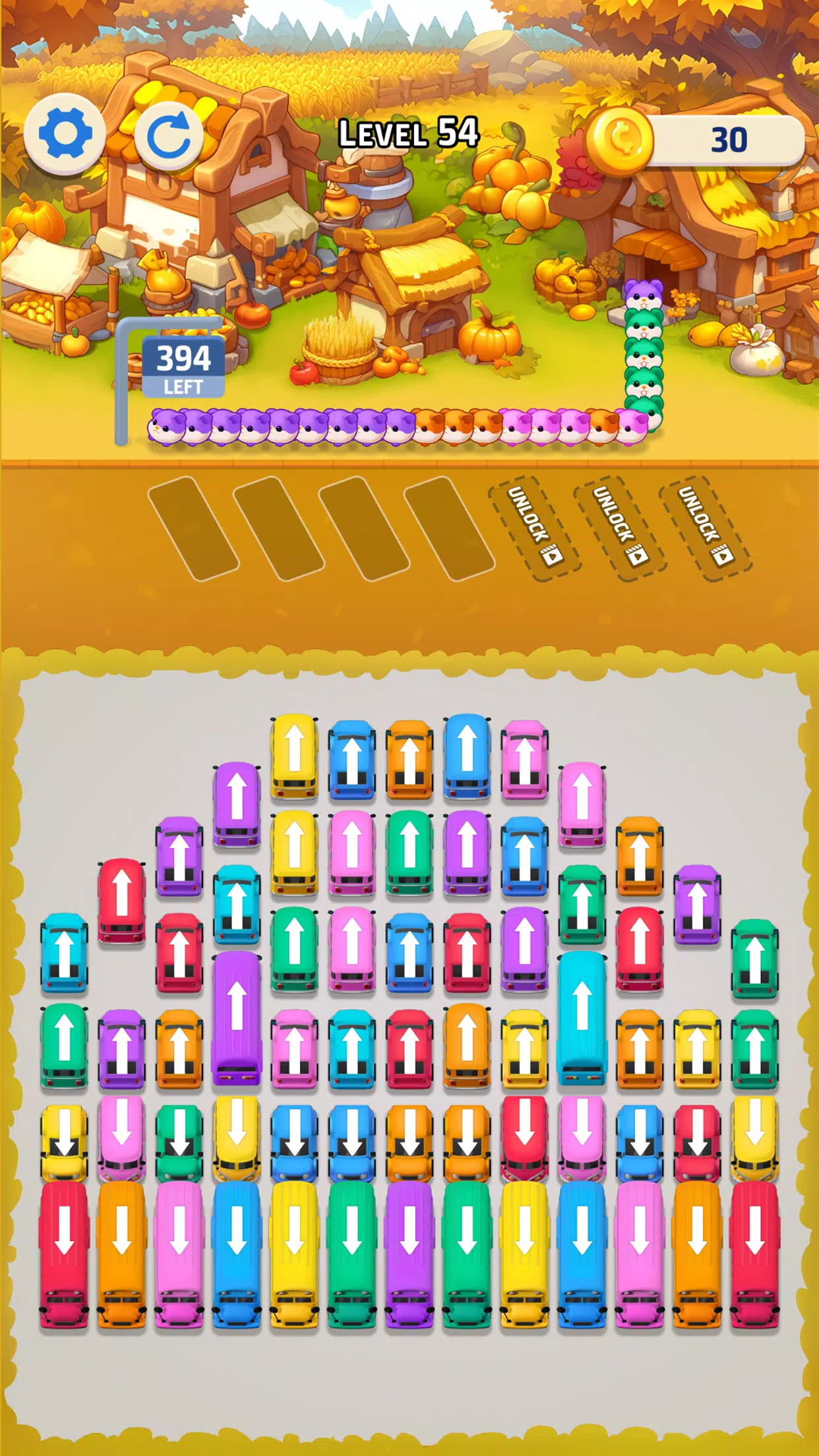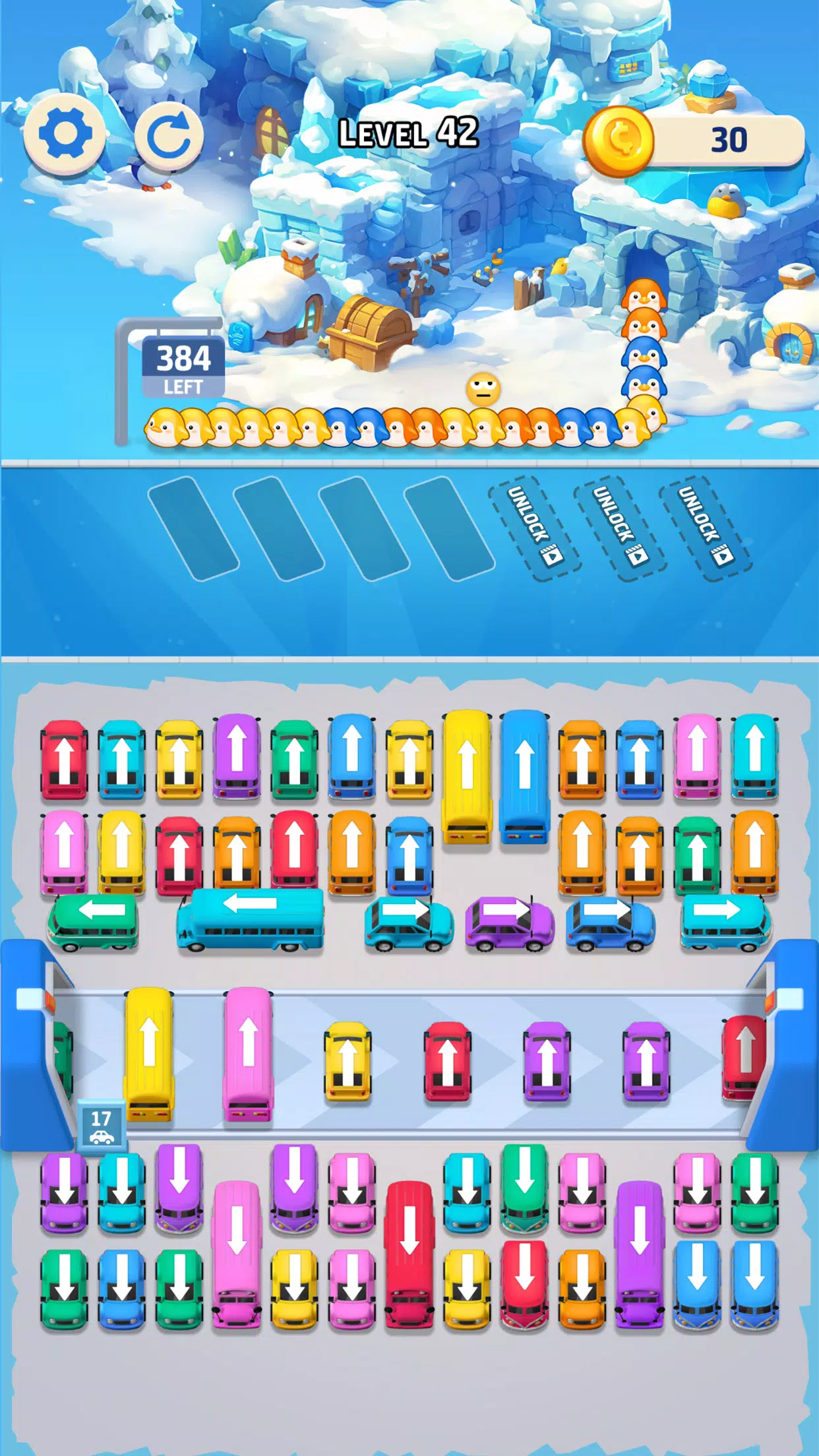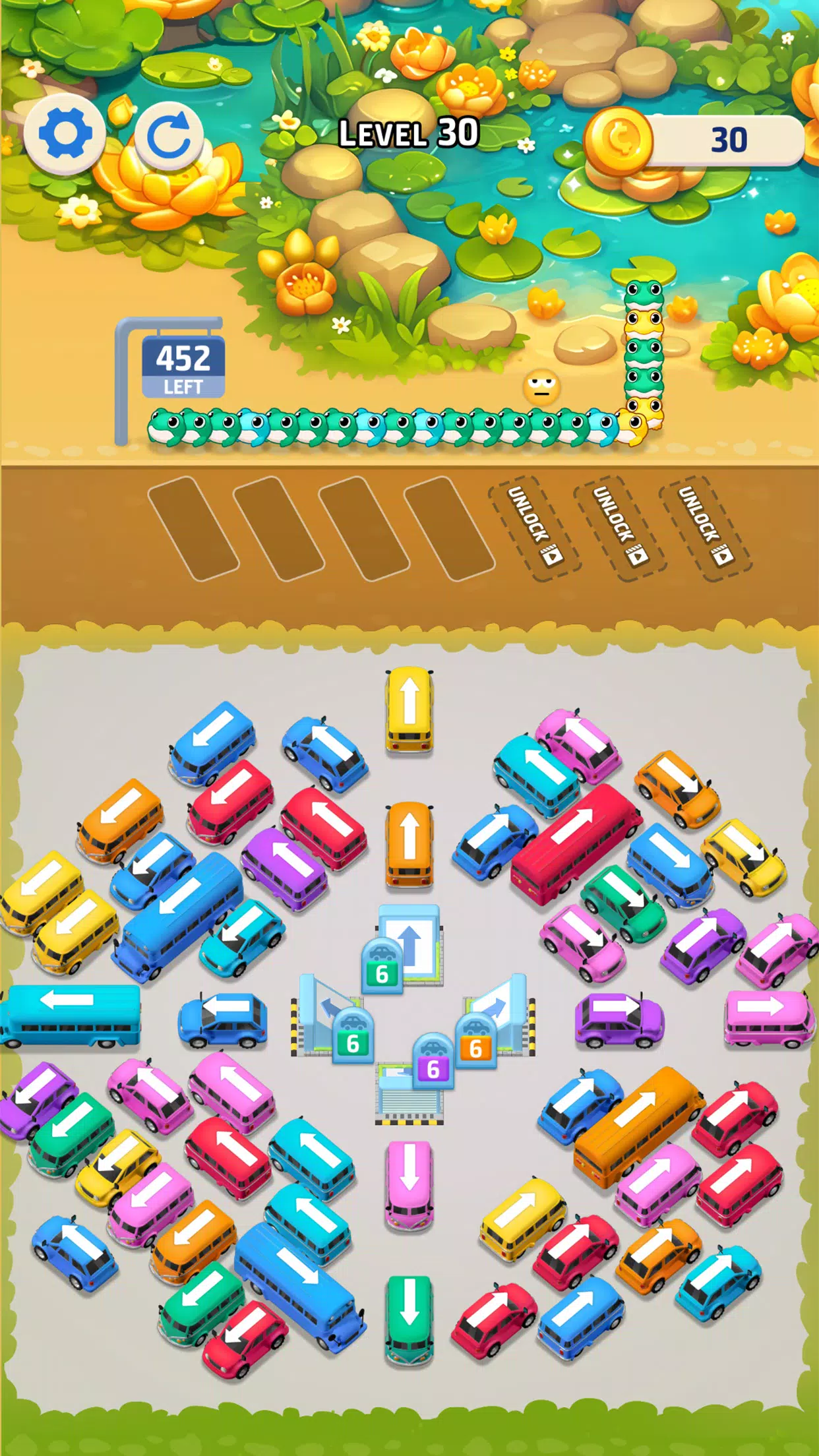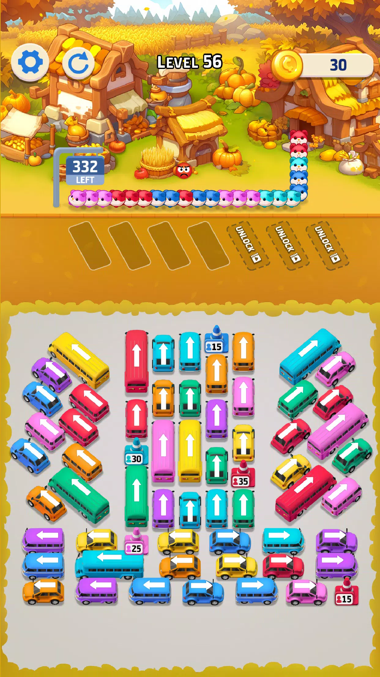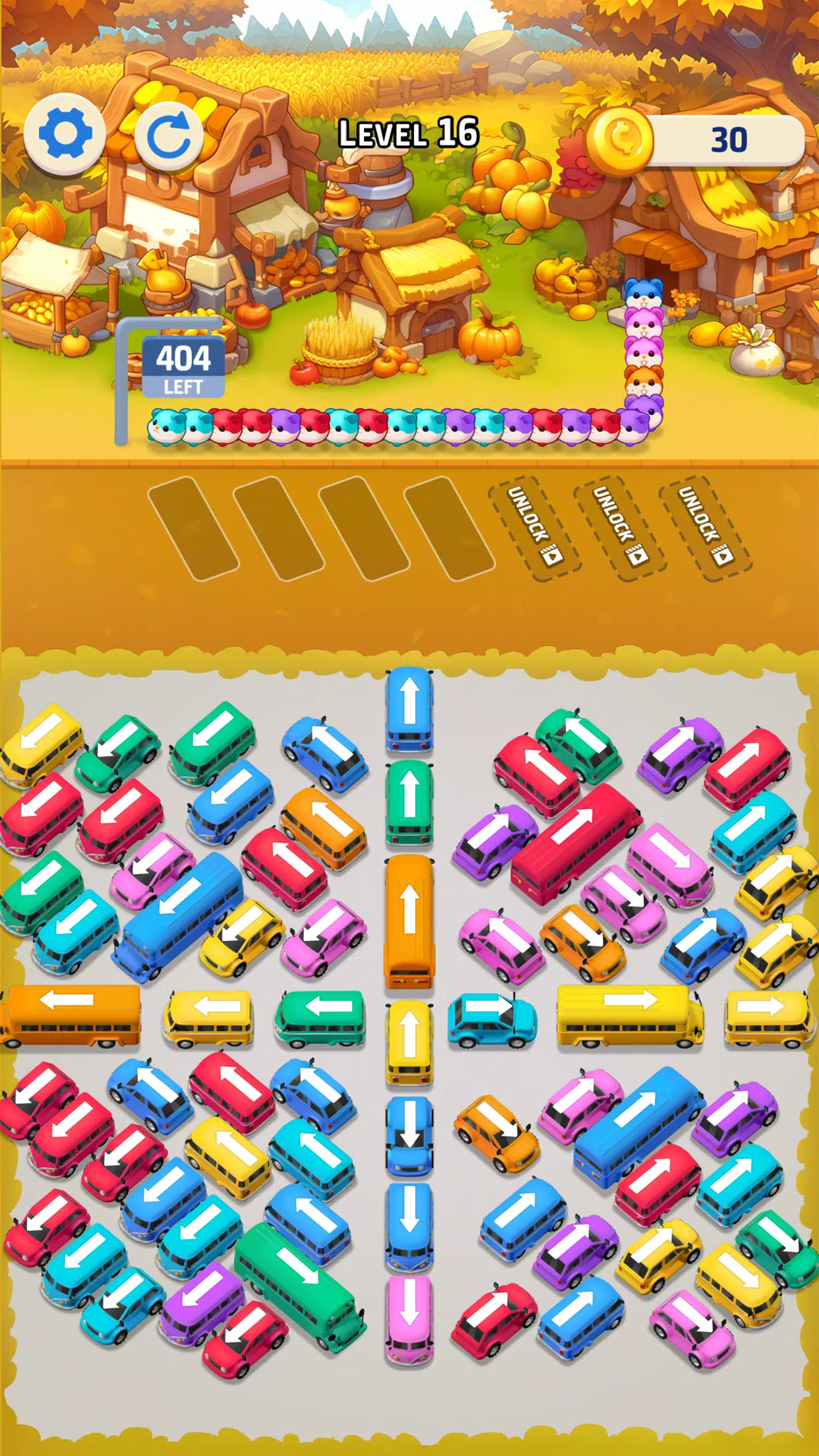 你会遇到不同的关卡,每个关卡都有一组色彩缤纷的巴士,需要根据它们的颜色停放在指定的停车位。每个关卡都带来新的挑战,更多的巴士、更狭窄的停车位以及巧妙的障碍物需要你仔细规划你的行动。你必须想办法把巴士移开,既不挡住其他巴士的路,也不让它们卡在狭窄的地方。目标是尽可能快速高效地将所有巴士停放在正确的位置。
