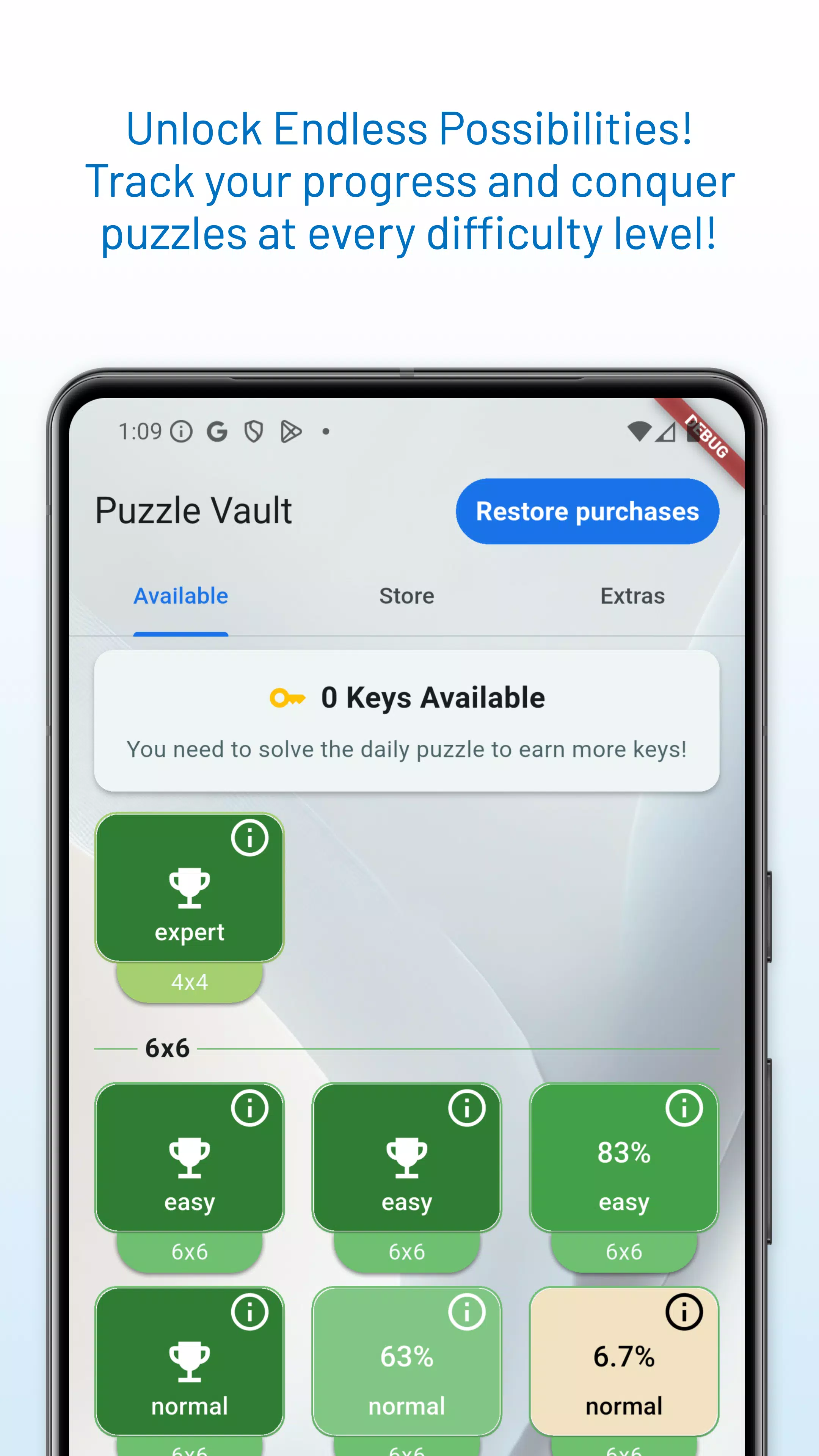 拥有 3712 个手工精心设计的谜题,涵盖多种网格尺寸(4×4 到 14×14),并设有从简单到专家的四个难度等级。