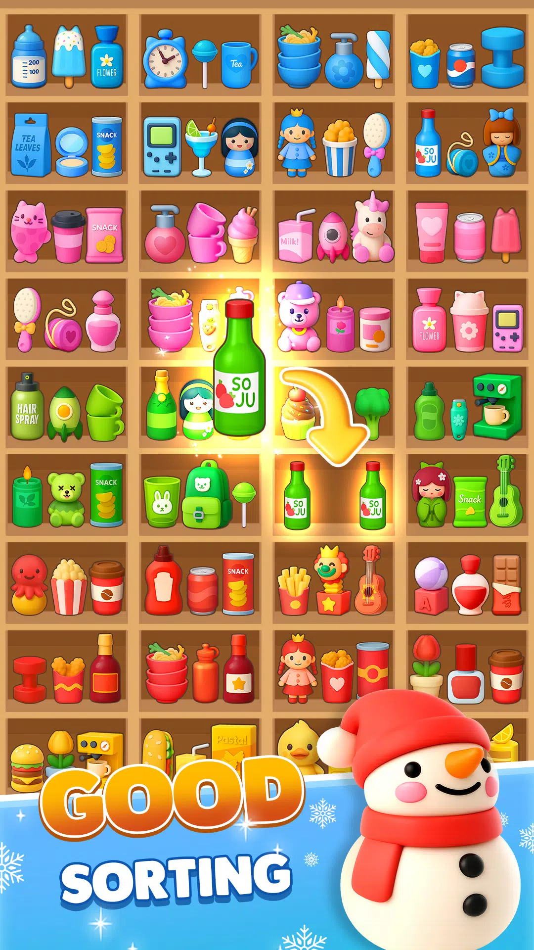 拖放并按类型或颜色匹配商品,清除杂乱物品并完成关卡。