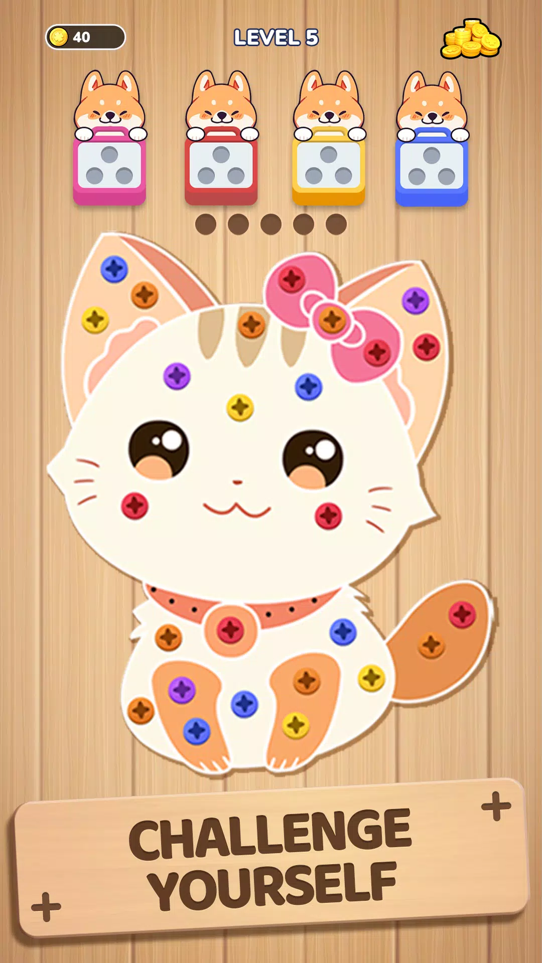 ⤴️ 战略思维:在 Woodle Screw™ Pin Nuts & Bolts 中,每个谜题都会挑战您的战略思维。您需要仔细计划您的动作以拧开螺栓、对彩色销钉进行分类并填充相应的螺丝盒。诀窍在于提前思考 – 有效利用可用空间并避免陷入螺丝堵塞。