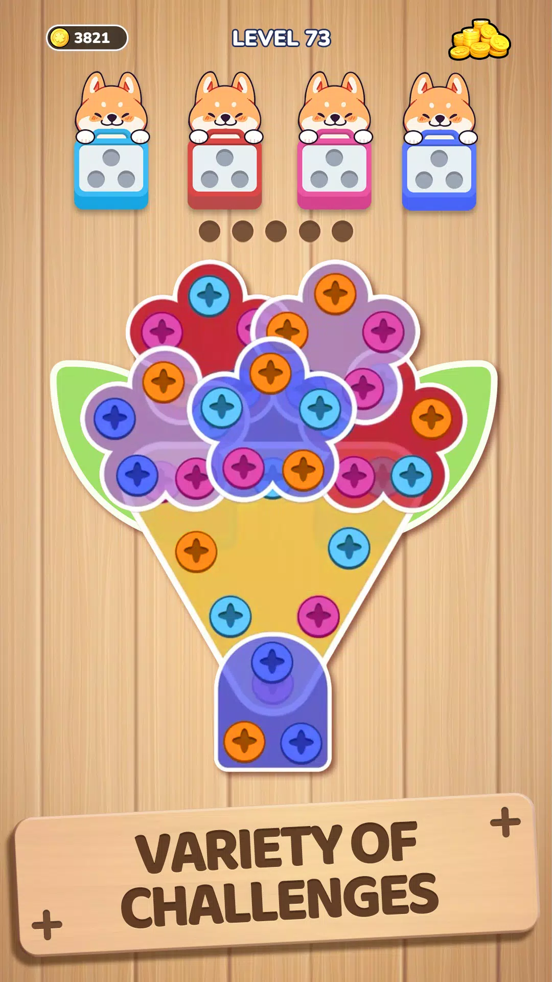 👍 独特的界面:享受令人惊叹的木制主题与彩色螺丝的融合,每个关卡都具有视觉吸引力。游戏的多样化设计确保您不仅仅是在解决难题——您还沉浸在艺术性的螺丝和销钉体验中。