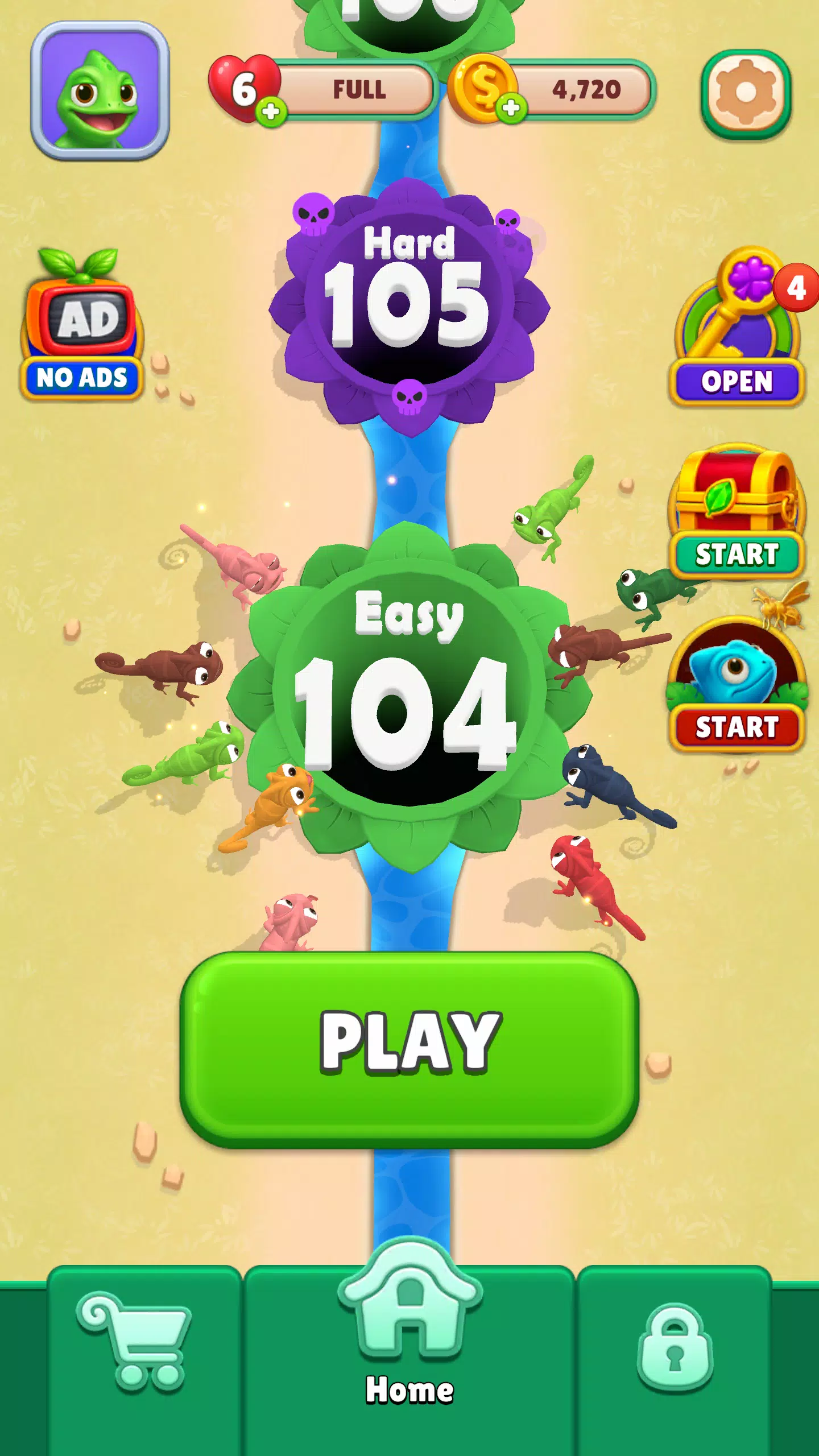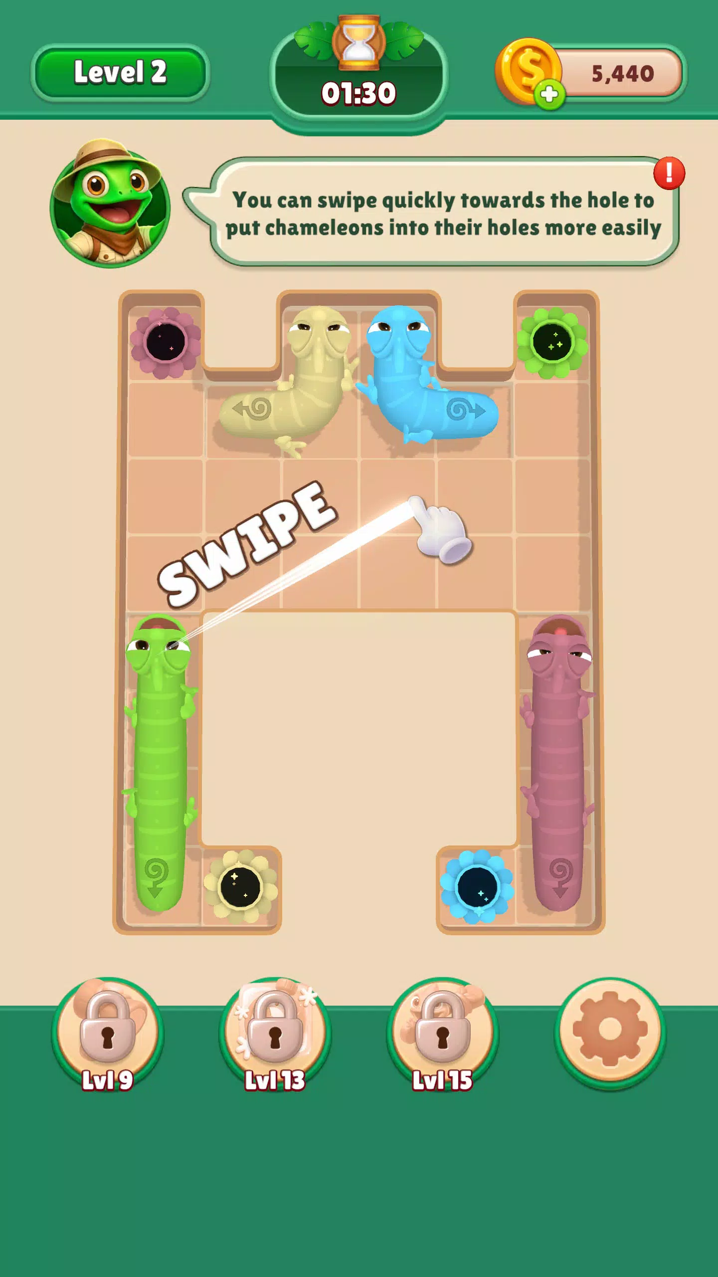 🎨 Color-Coded Chaos: Match each chameleon to its corresponding hole to complete the level.