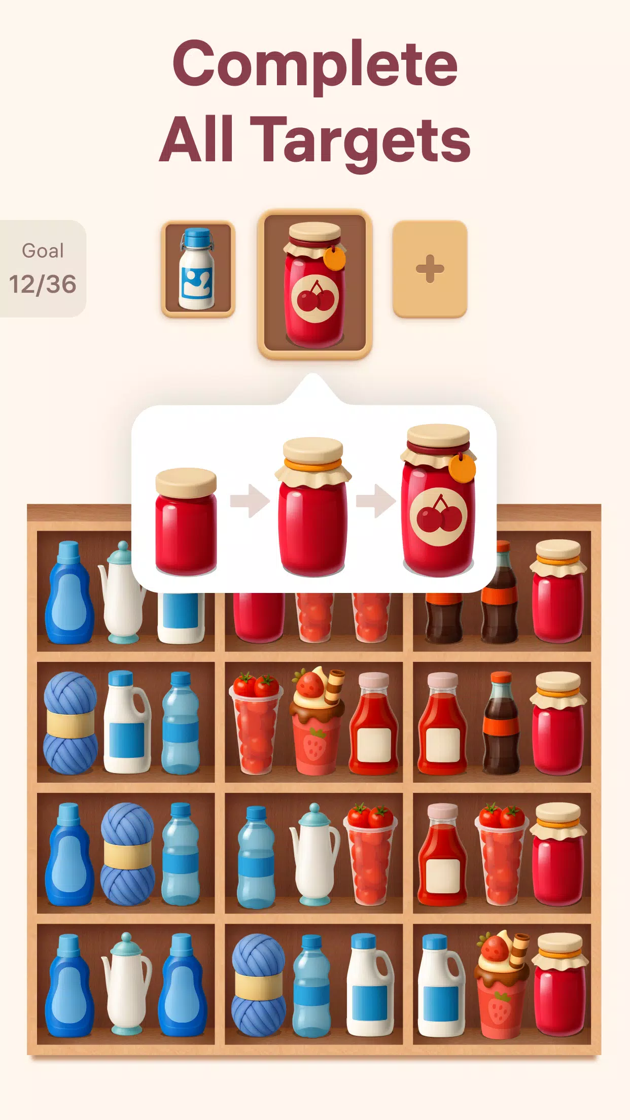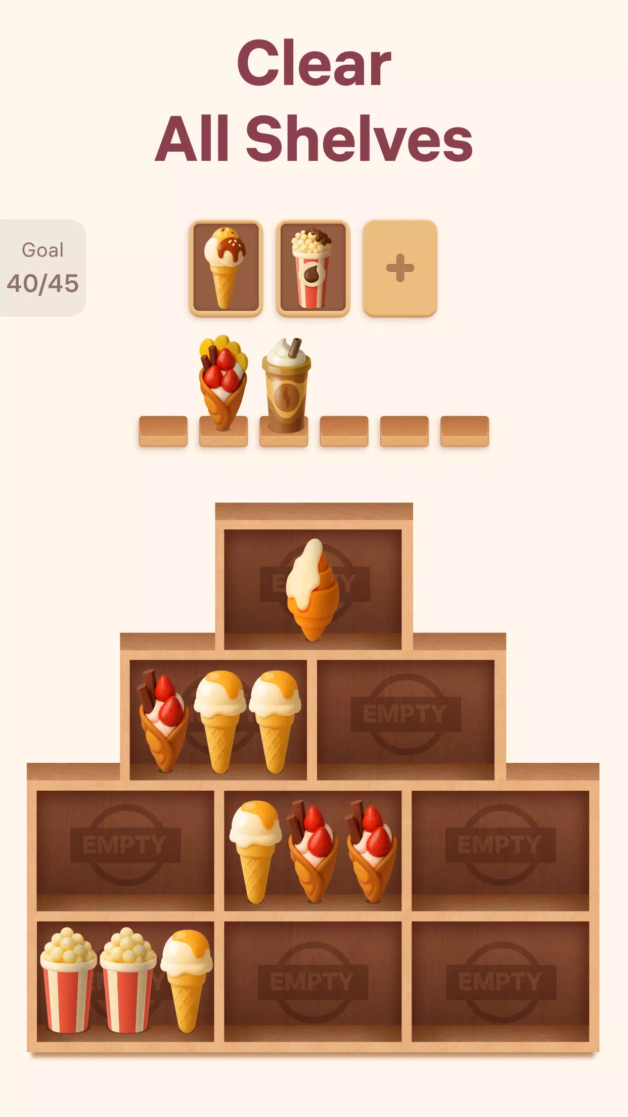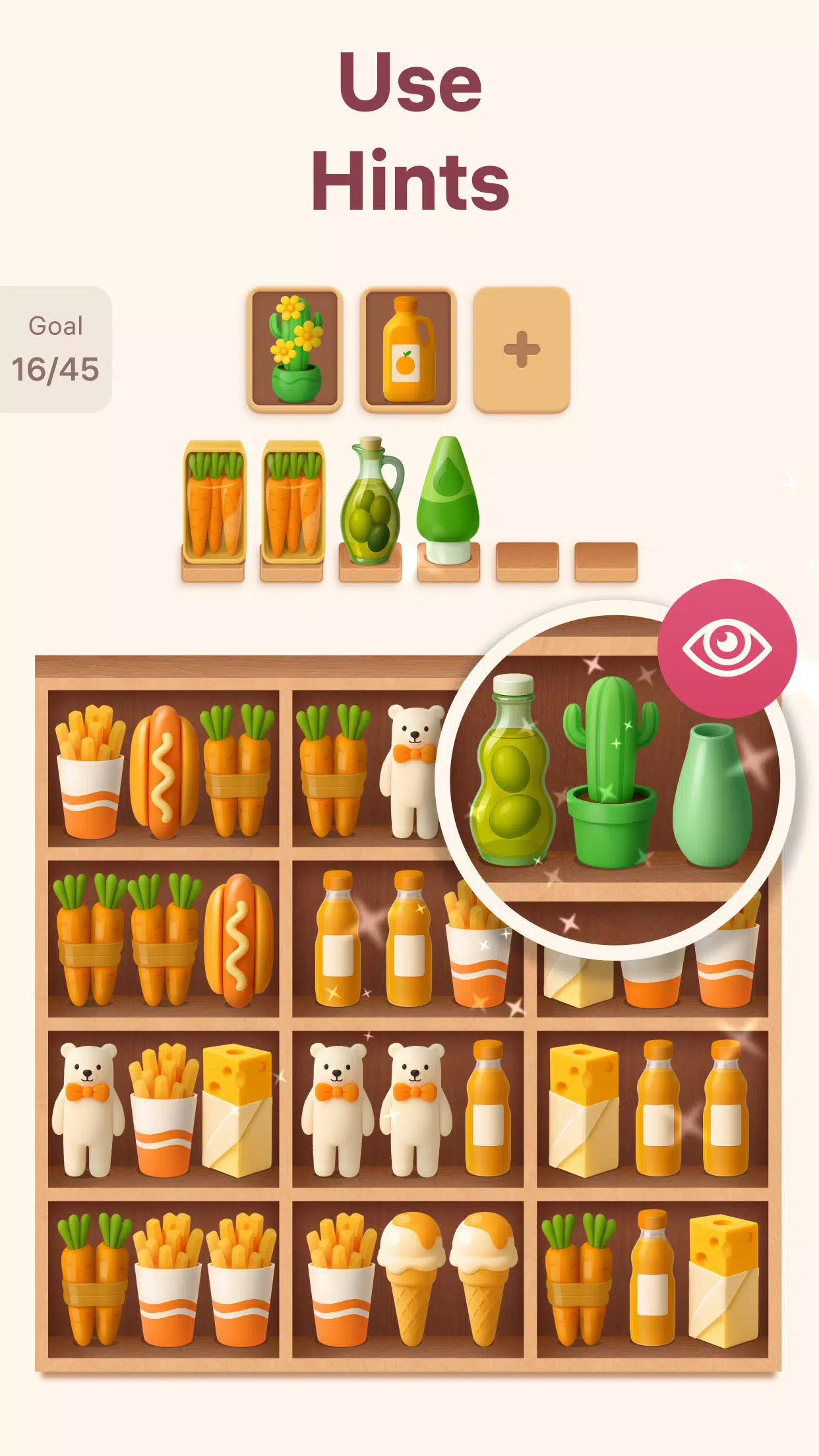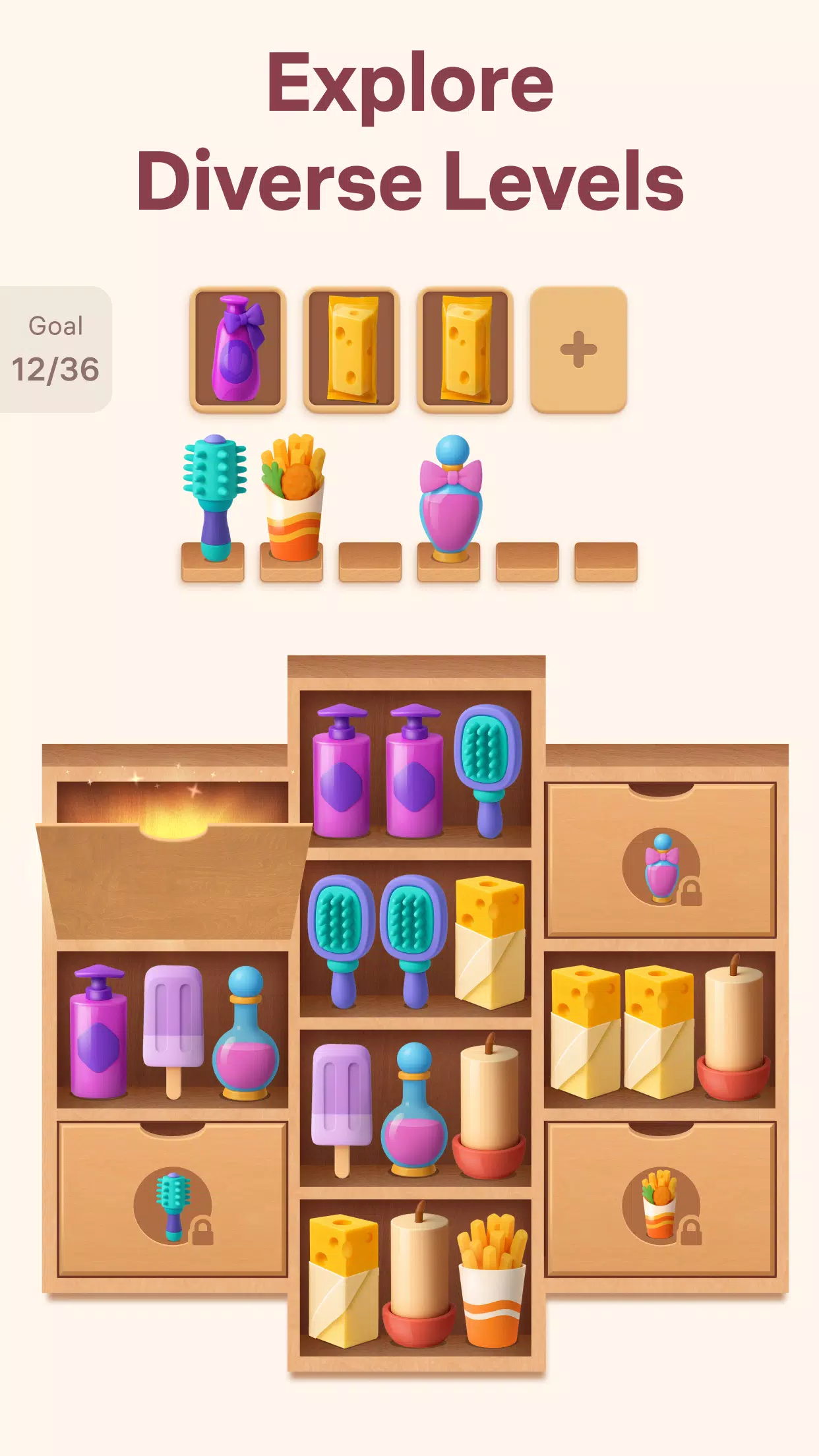 享受无压力的排序过程,体验每次合并带来的成就感。选择要合并的商品,并决定它们的下一个放置位置,在游戏过程中自然而然地锻炼你的专注力、逻辑思维和问题解决能力。走进色彩缤纷的货架世界,发现排序的乐趣吧!