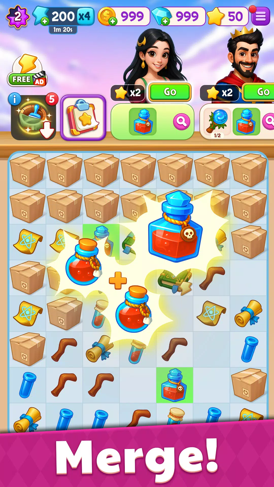 拖动并连接匹配的物品,制作装饰品、工具和宝藏。每一次精心的合并都会发现新的惊喜——充满魔力的颜料套装、水晶、蜡烛和家具。