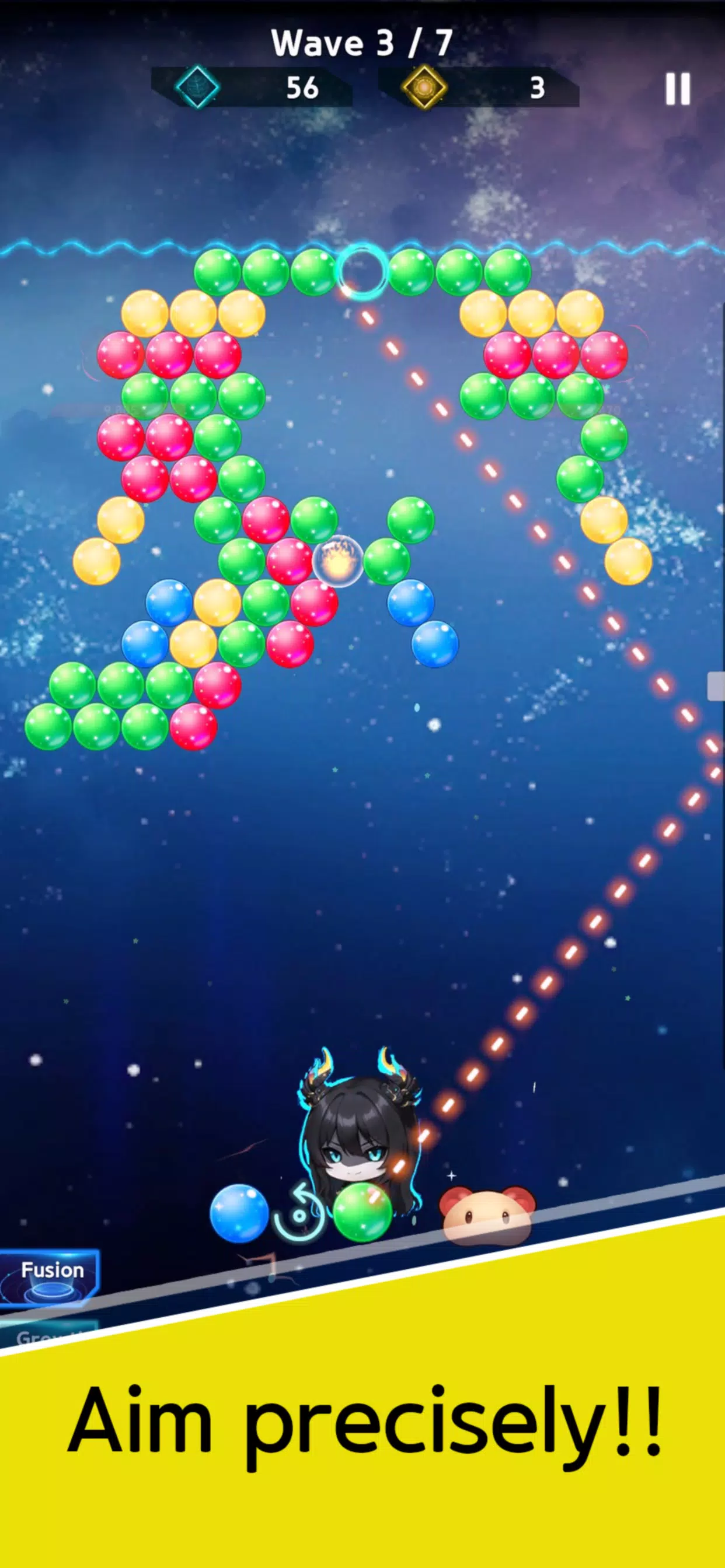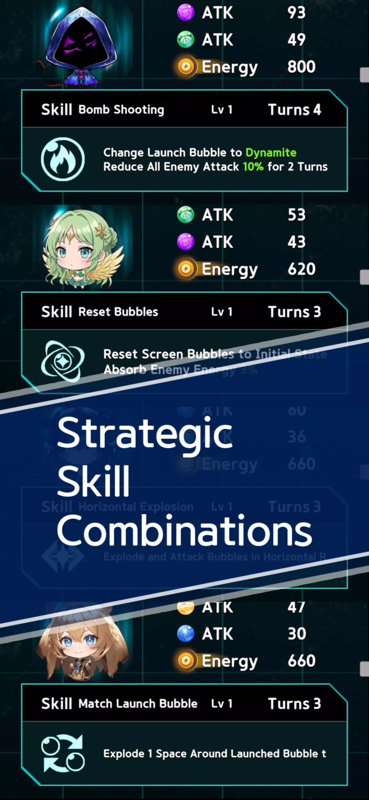 匹配并爆破彩色泡泡来吸收元素能量。将它们组合起来,释放人工智能生成的单位的强大技能,称霸战场。