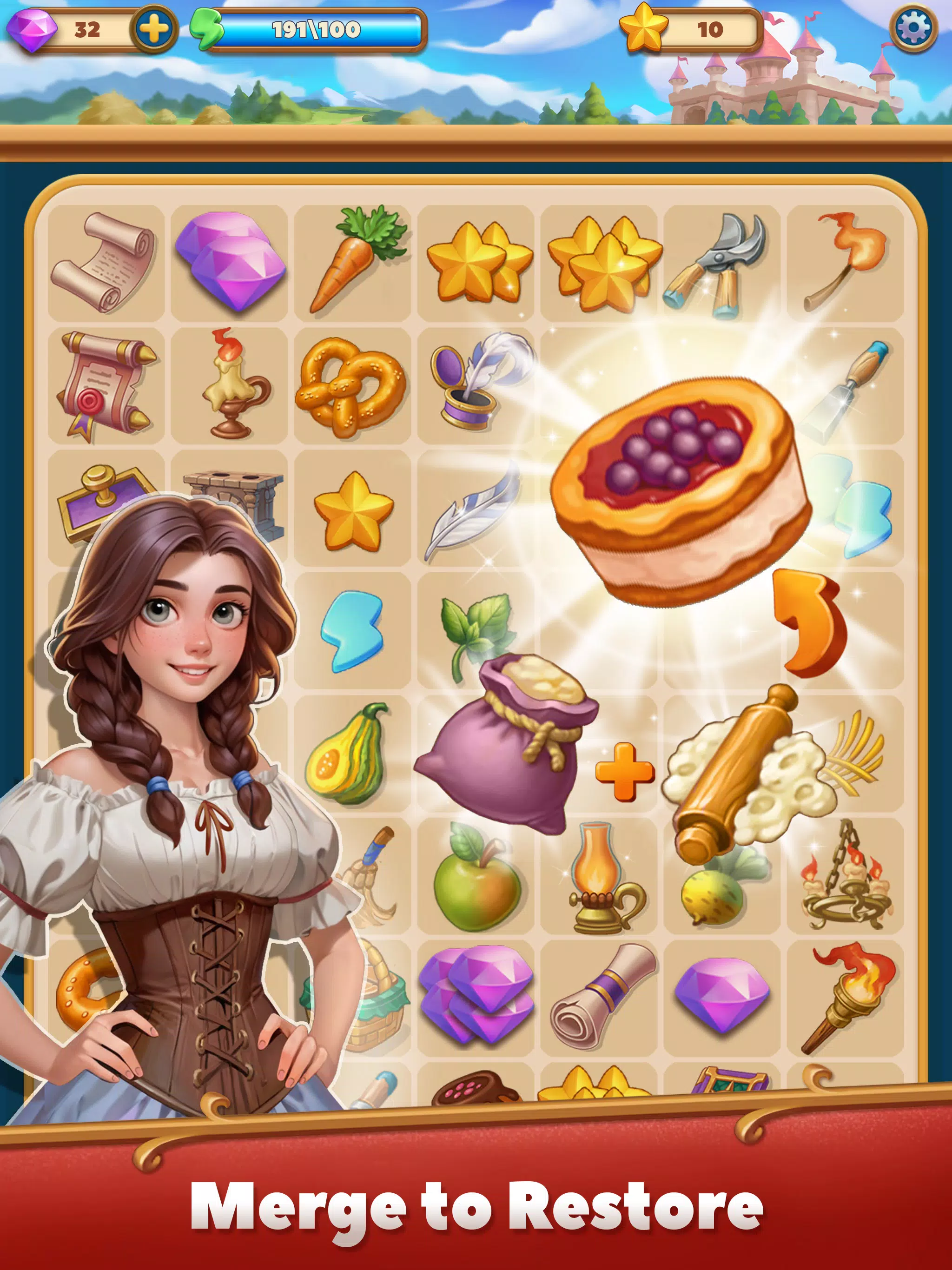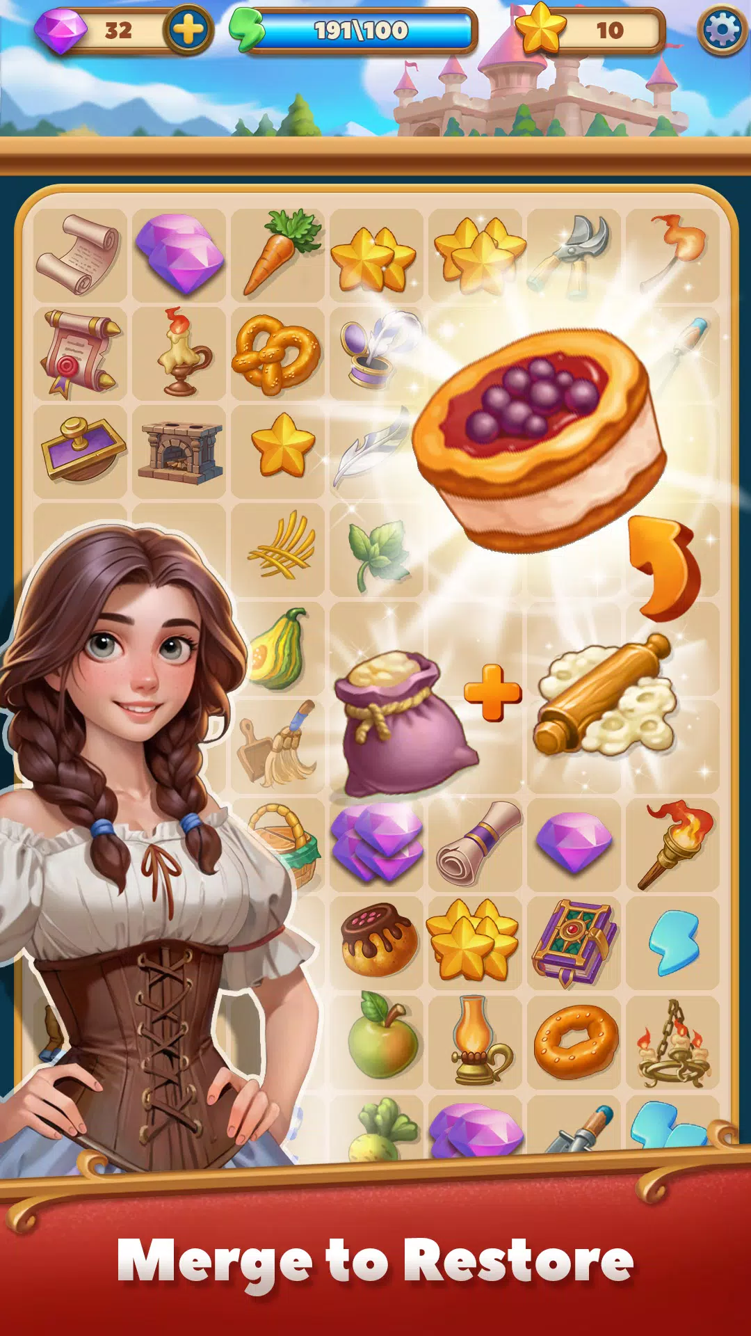 合并物品来制作工具,修复建筑,将废墟改造成一座宏伟的皇家堡垒。