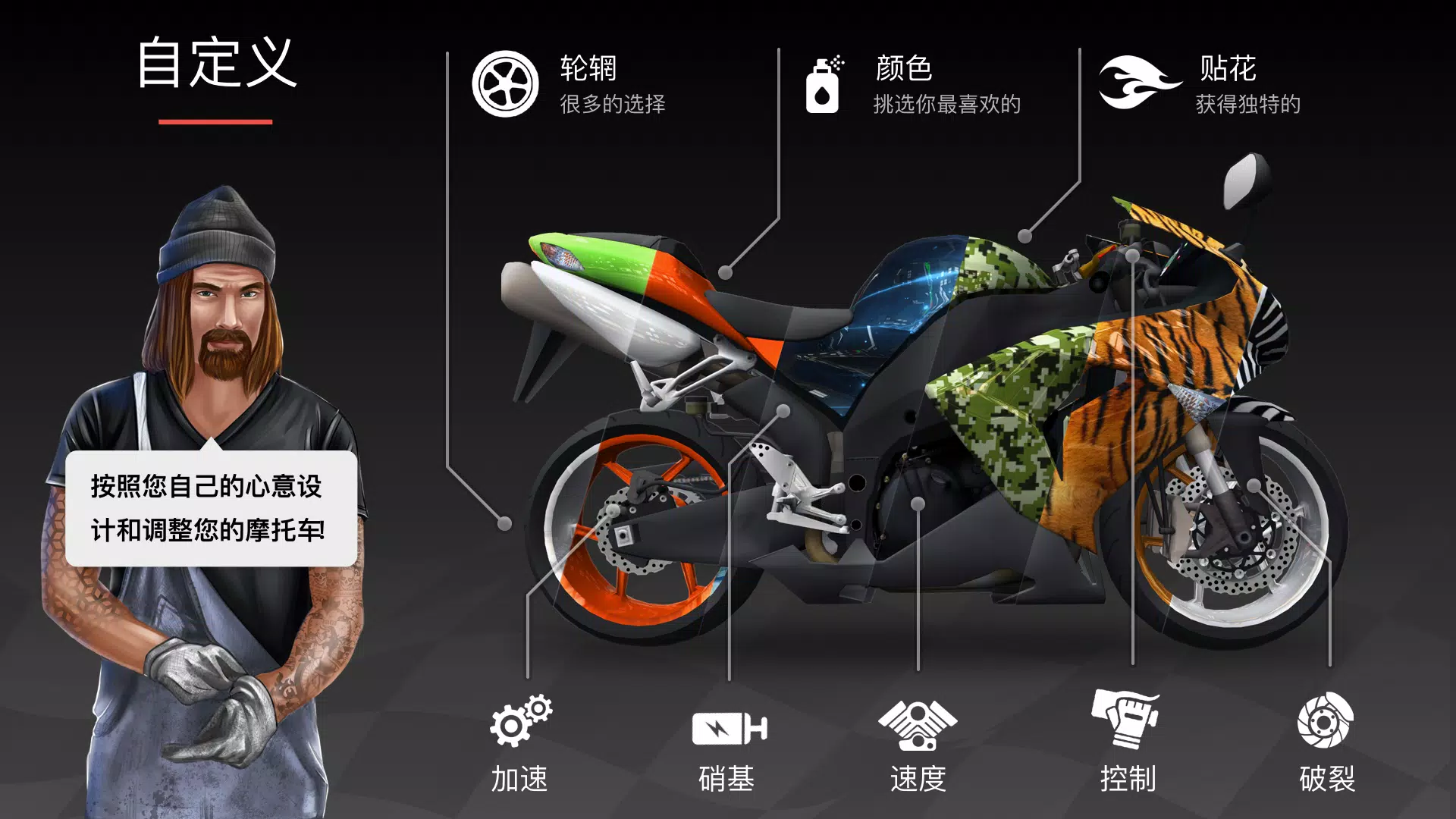 我们从最细微的细节为你模仿了16种不同的摩托车。随你挑选哪一种,改善其性能,更改其设计,然后开始比赛。